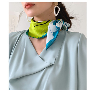 春夏季薄款防晒脖子装饰小丝巾小清新花卉拼色真丝围巾桑蚕丝纱巾