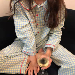 可爱格子小熊长袖长裤睡衣女春秋款网红风学生薄款家居服两件套装