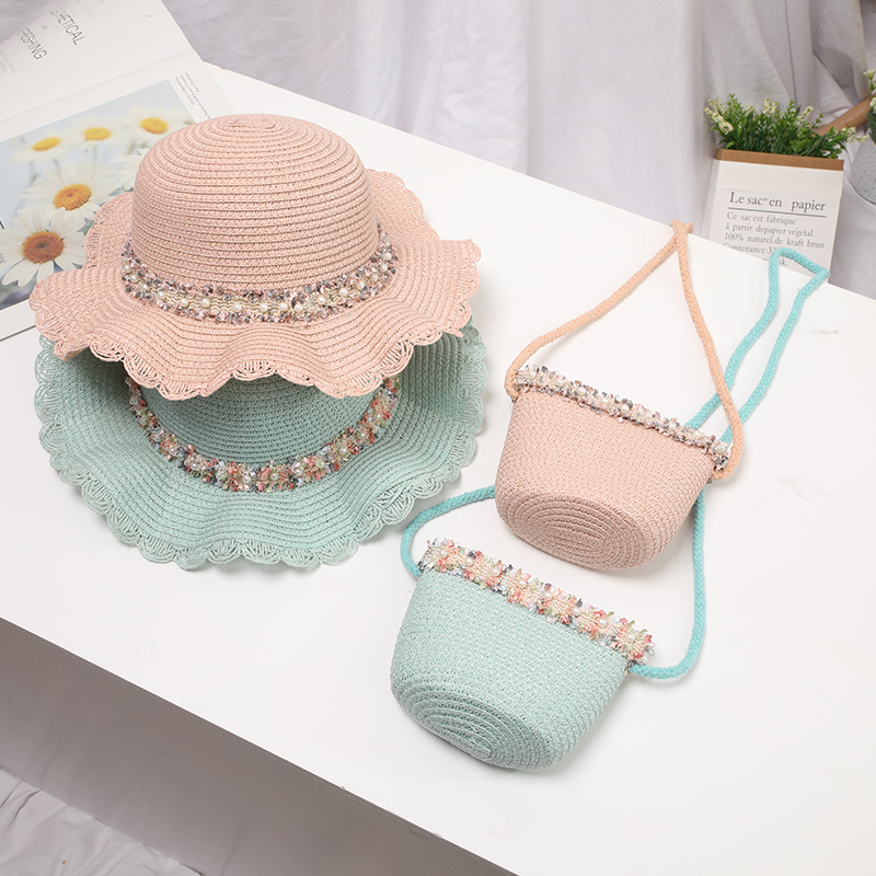 새로운 어린이 여자의 여름 태양 모자 공주 레이스 밀짚 모자 태양 모자 모자 가방 세트
