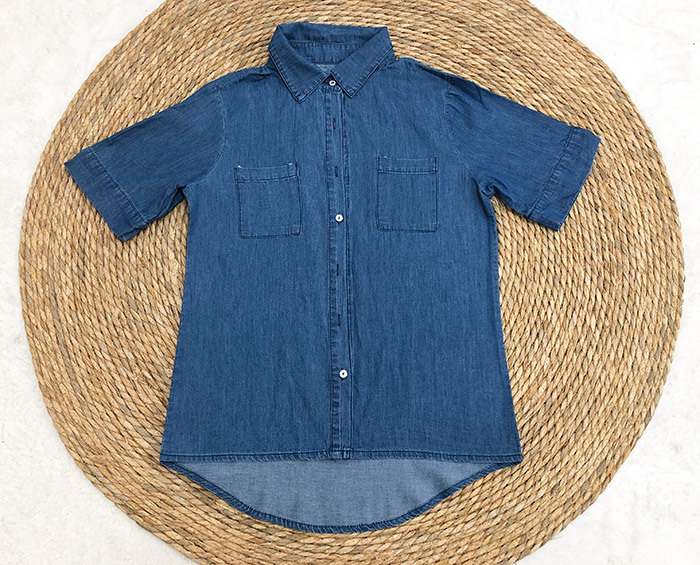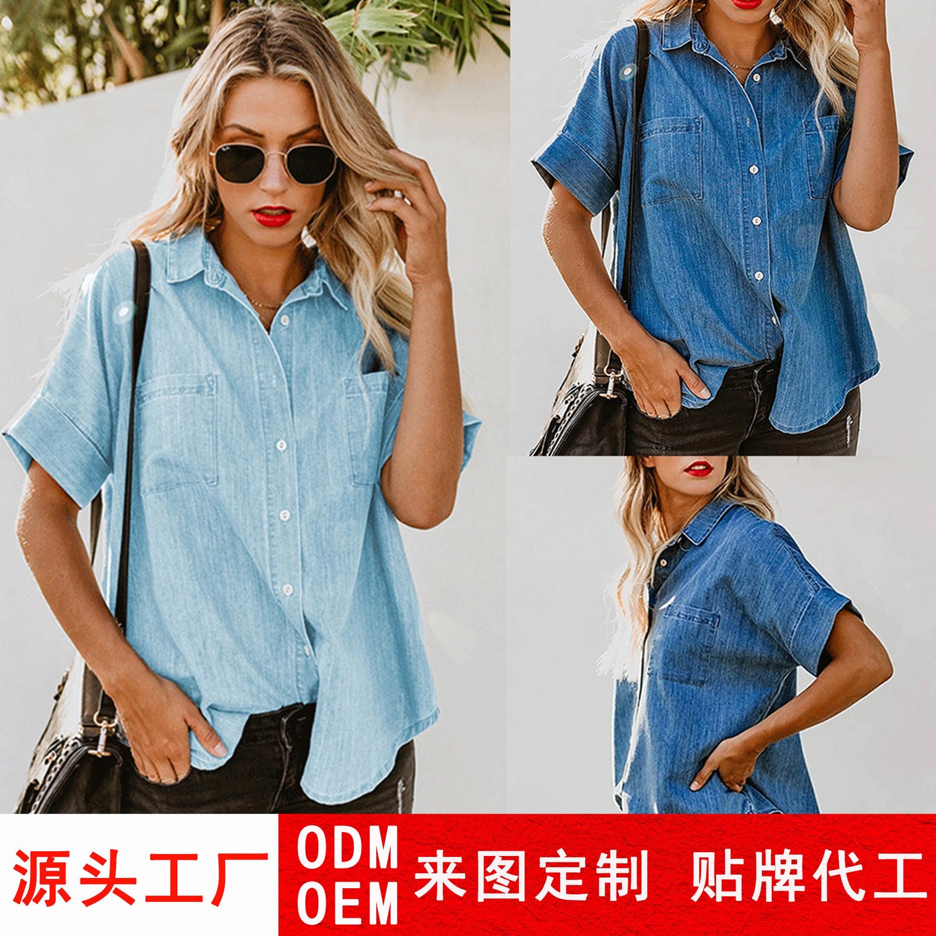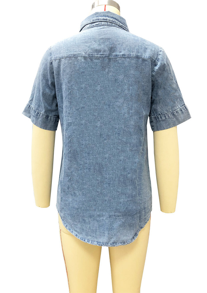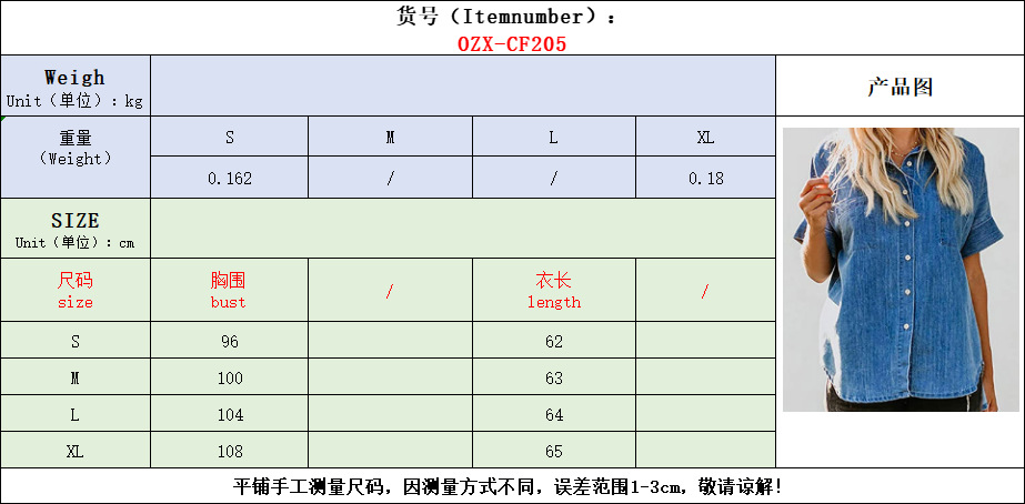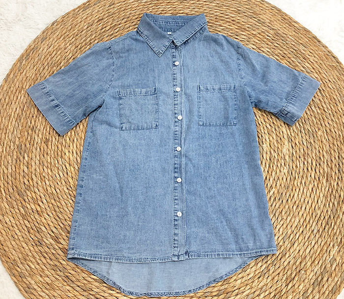 2023 봄/여름 독립 역 아마존 국경 간 Lel 반팔 데님 셔츠 유럽과 미국의 느슨한 단색 탑 여성 의류스토어 가기
