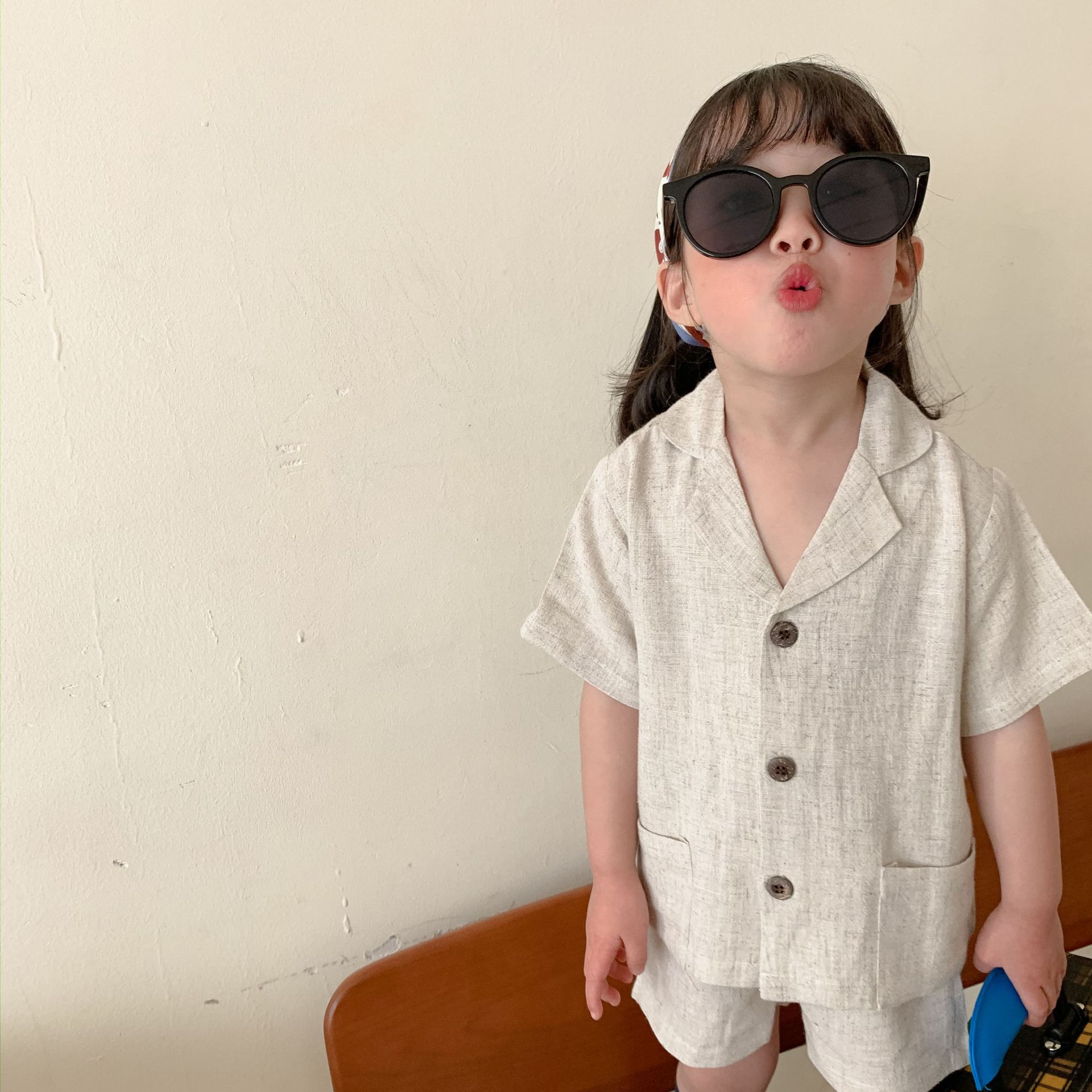 한국 아동복 아동의 새로운 한국 세트 소년과 소녀 아기 린넨 반팔 셔츠 반바지 2 피스 트렌디스토어 가기
