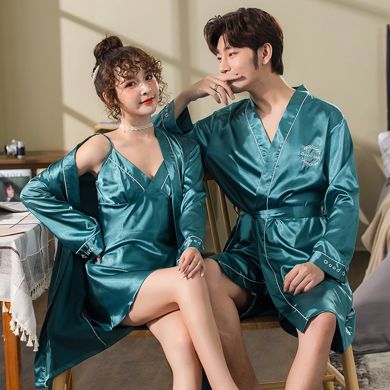 봄과 여름 얇은 실크 레드 웨딩 커플 잠옷 여성 신부 아침 가운 얼음 실크 잠옷 남자의 가정 옷 세트스토어 가기
