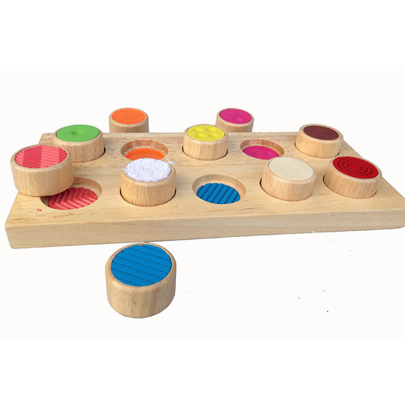 总共配有10个小圆木块,和底板上一一对应,每个圆木块颜色、图案各异。