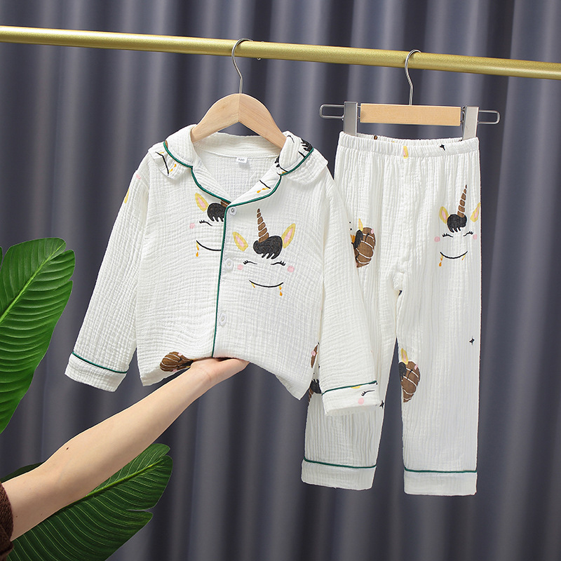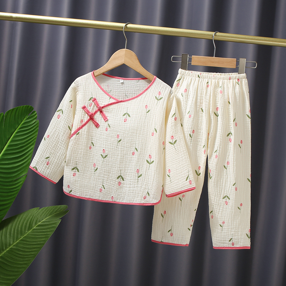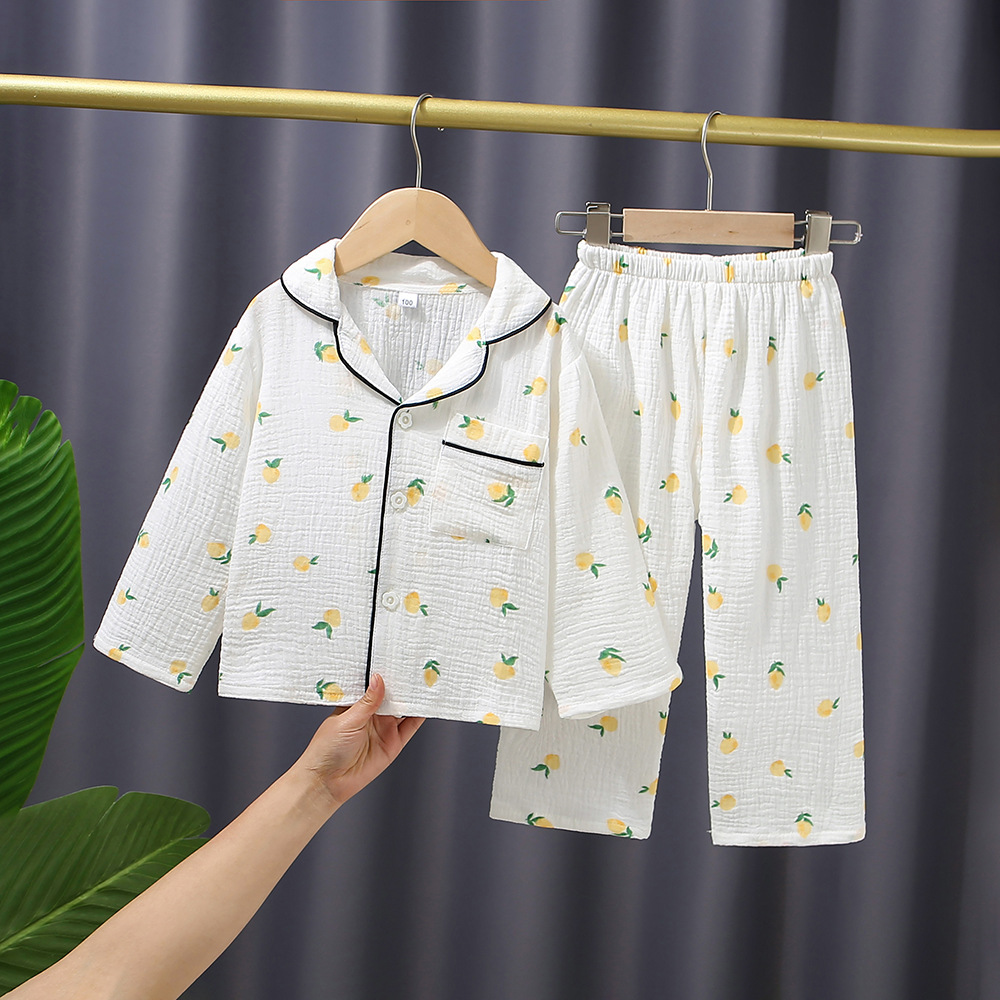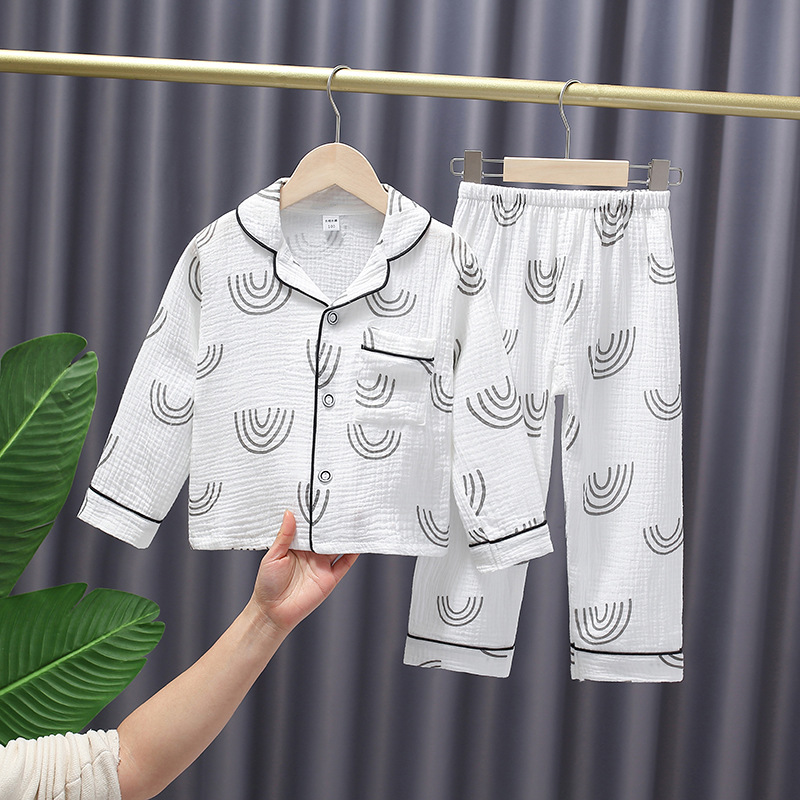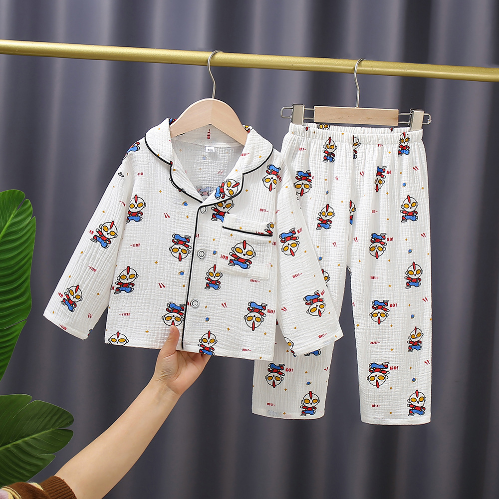 봄과 여름 어린이 순면 거즈 잠옷 소녀와 소년 면사 중형 및 대형 어린이 얇은 긴 소매 반팔 세트 가정 옷