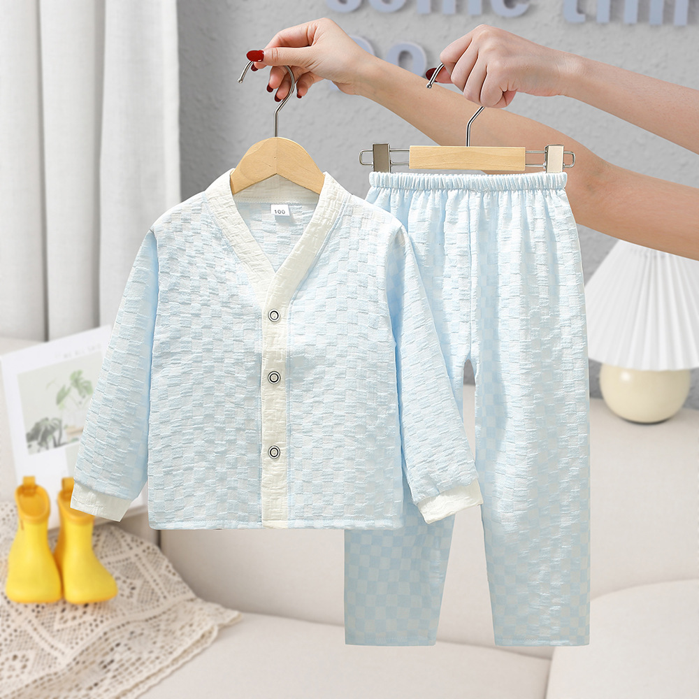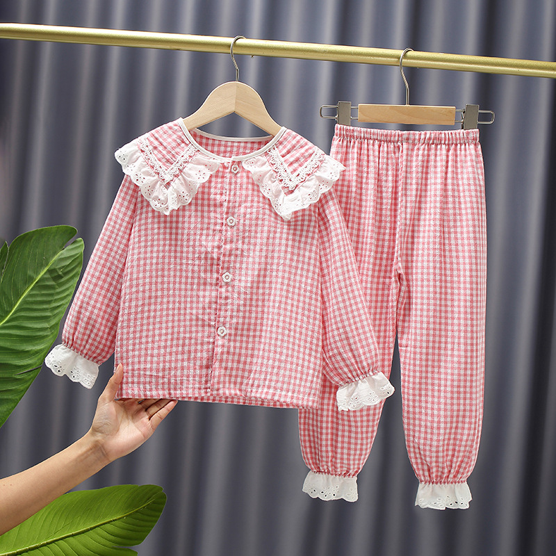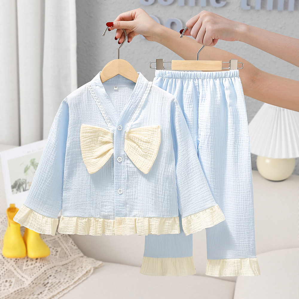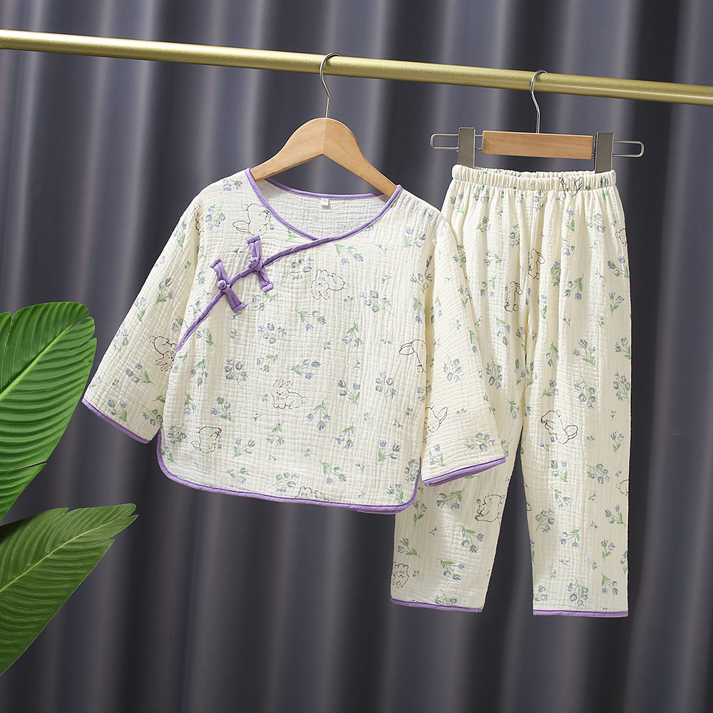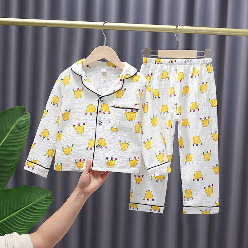 봄과 여름 어린이 순면 거즈 잠옷 소녀와 소년 면사 중형 및 대형 어린이 얇은 긴 소매 반팔 세트 가정 옷