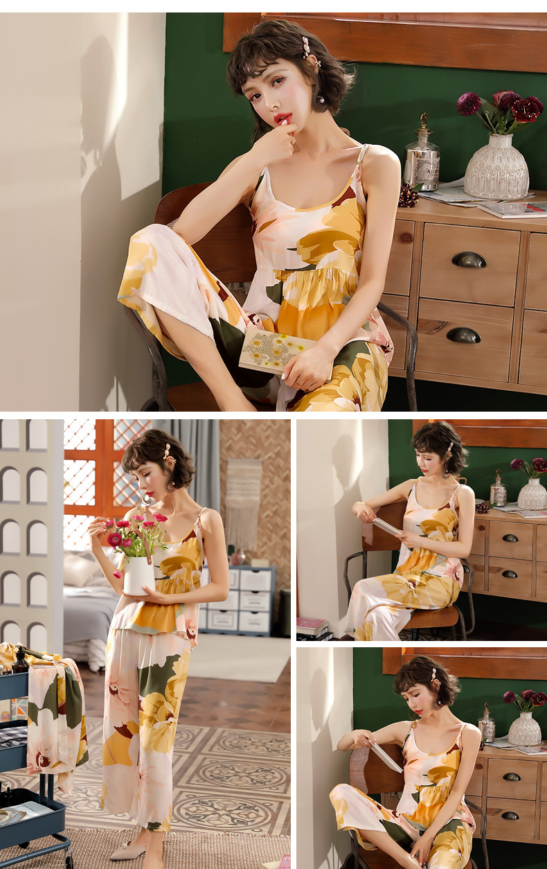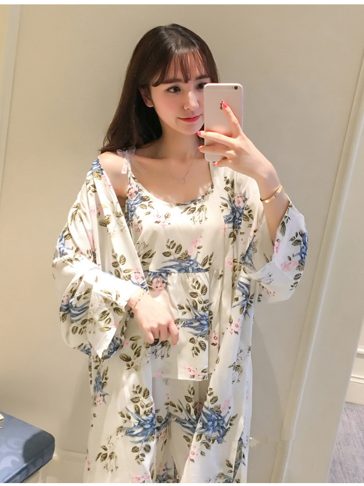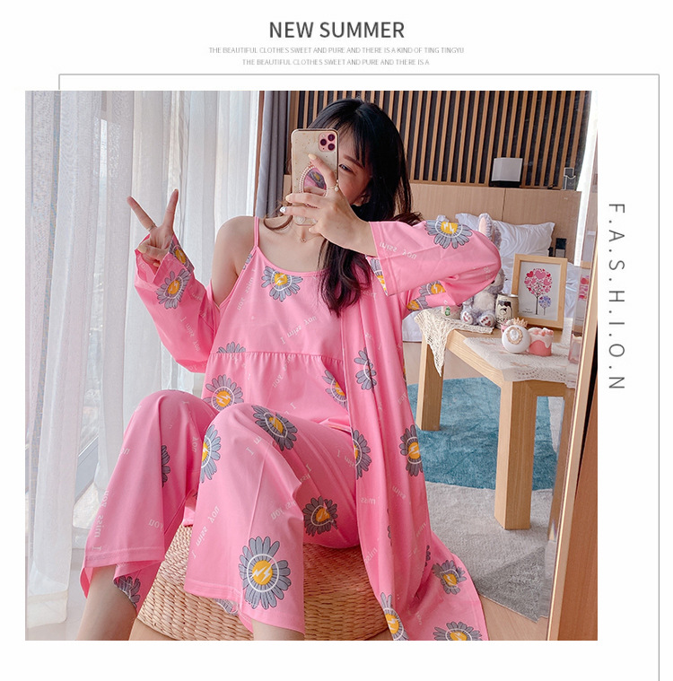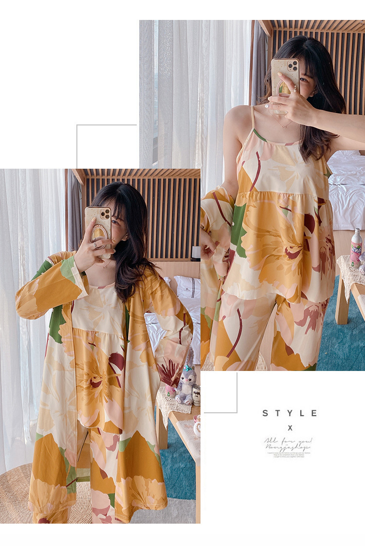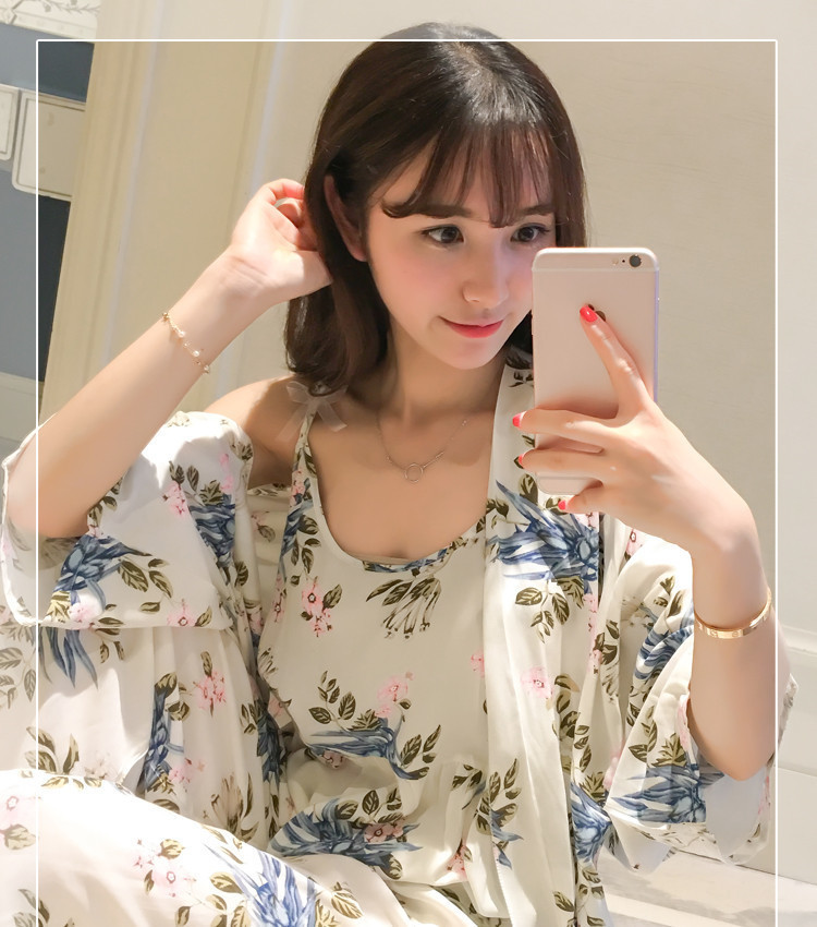 일본식 신선하고 달콤한 잠옷 난초 동백 데이지 꽃 슬링 섹시한 잠옷 3 종 세트 우유 실크 가정 옷