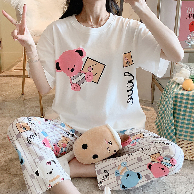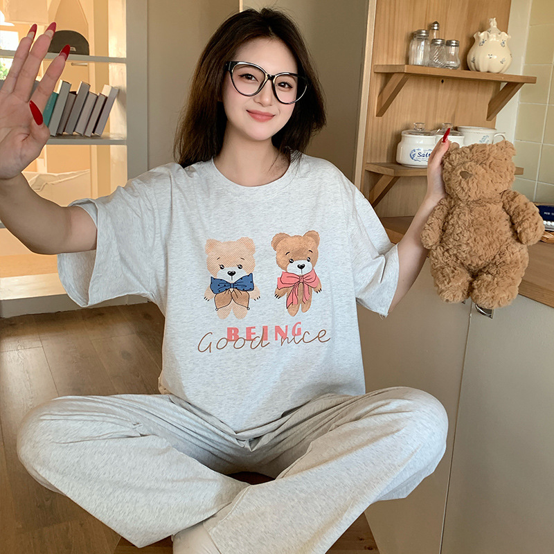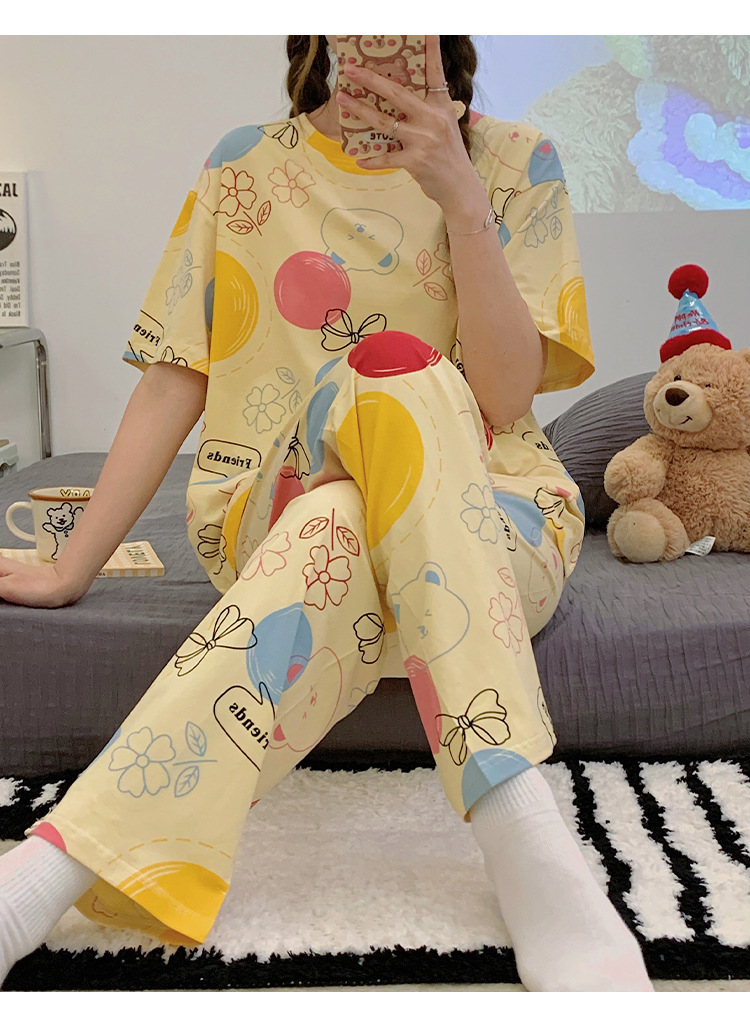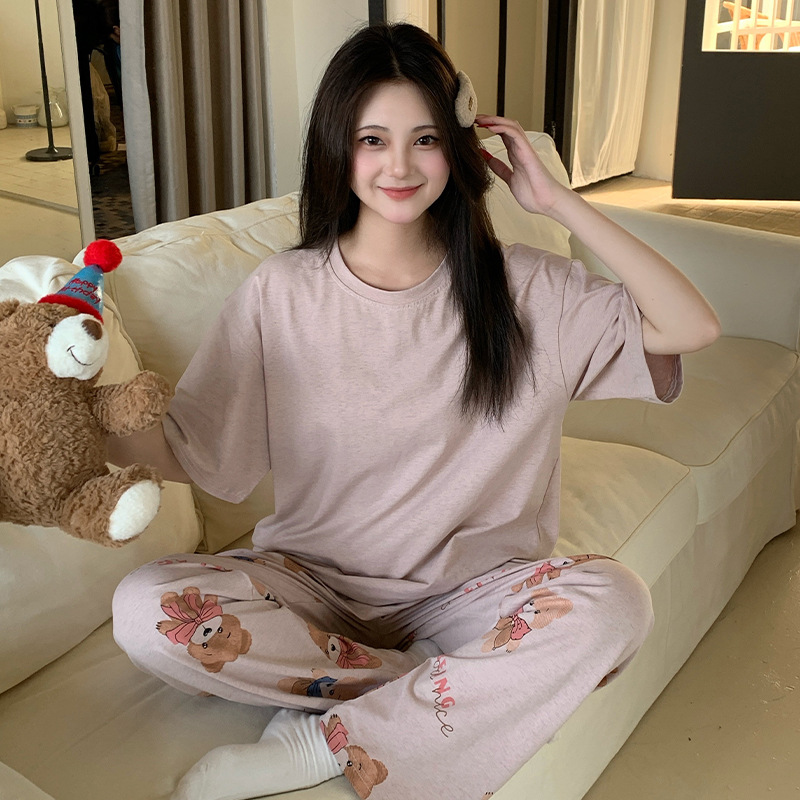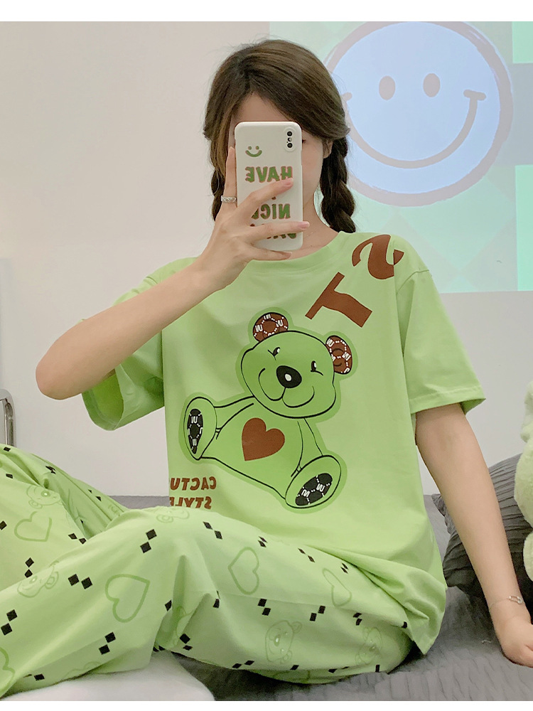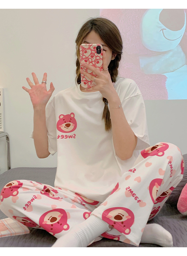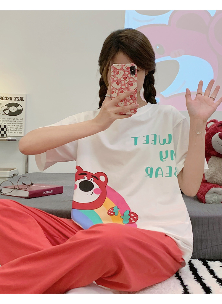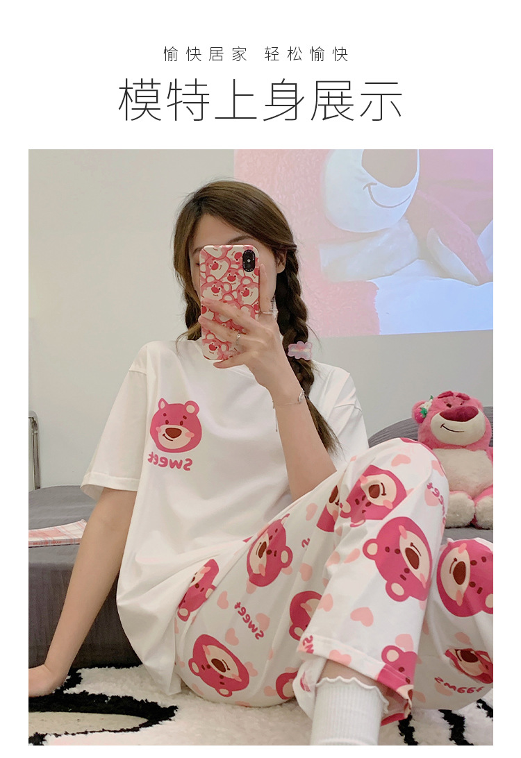 2024 봄과 여름 면 잠옷 여성 한국식 만화 크루 넥 반팔 바지 세트 캐주얼 홈웨어스토어 가기