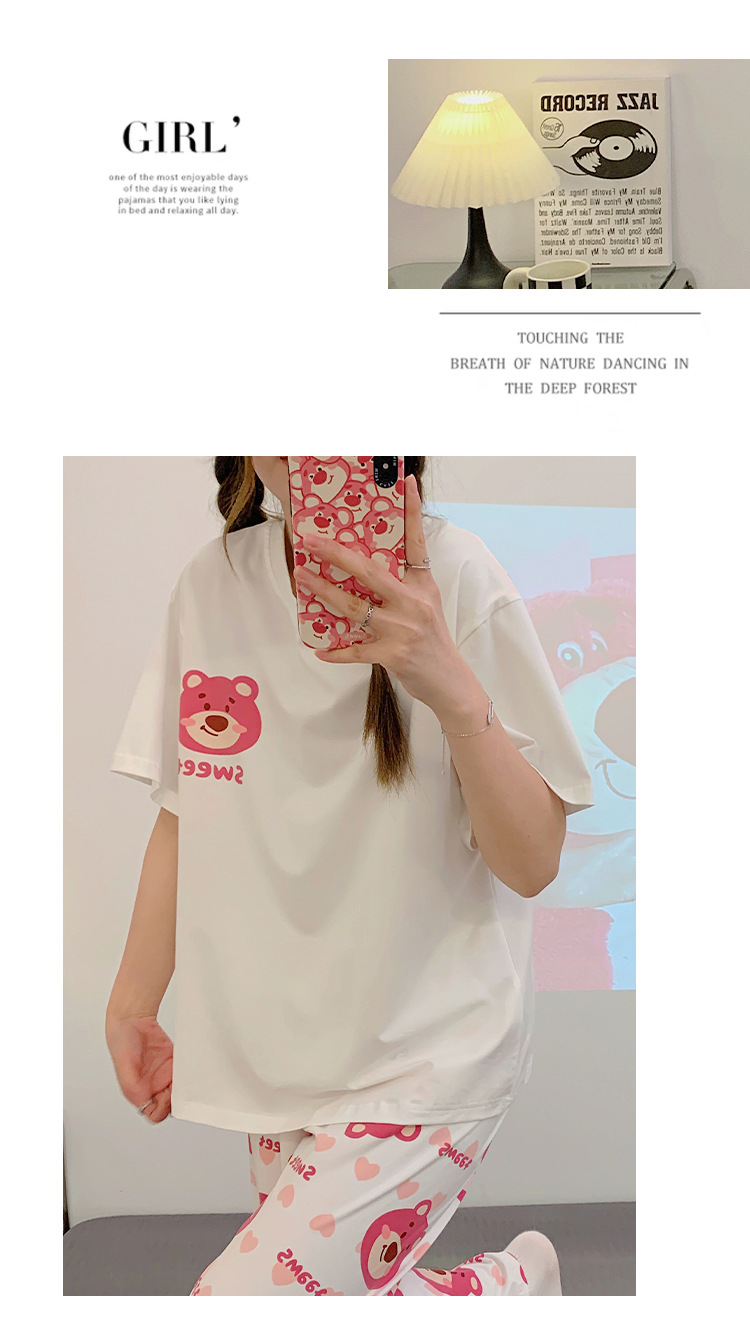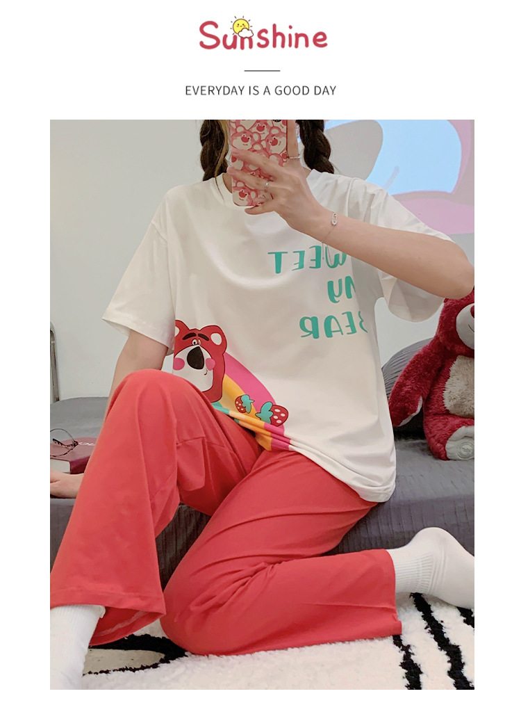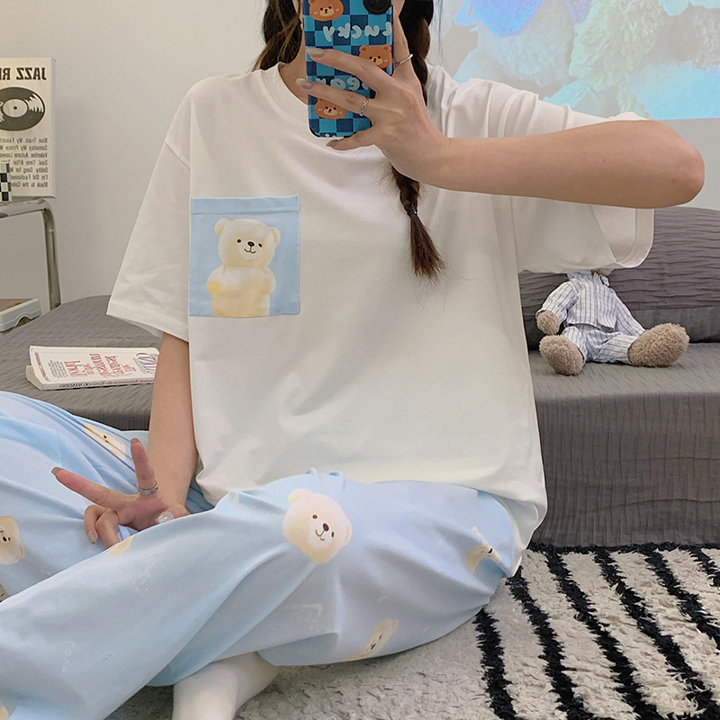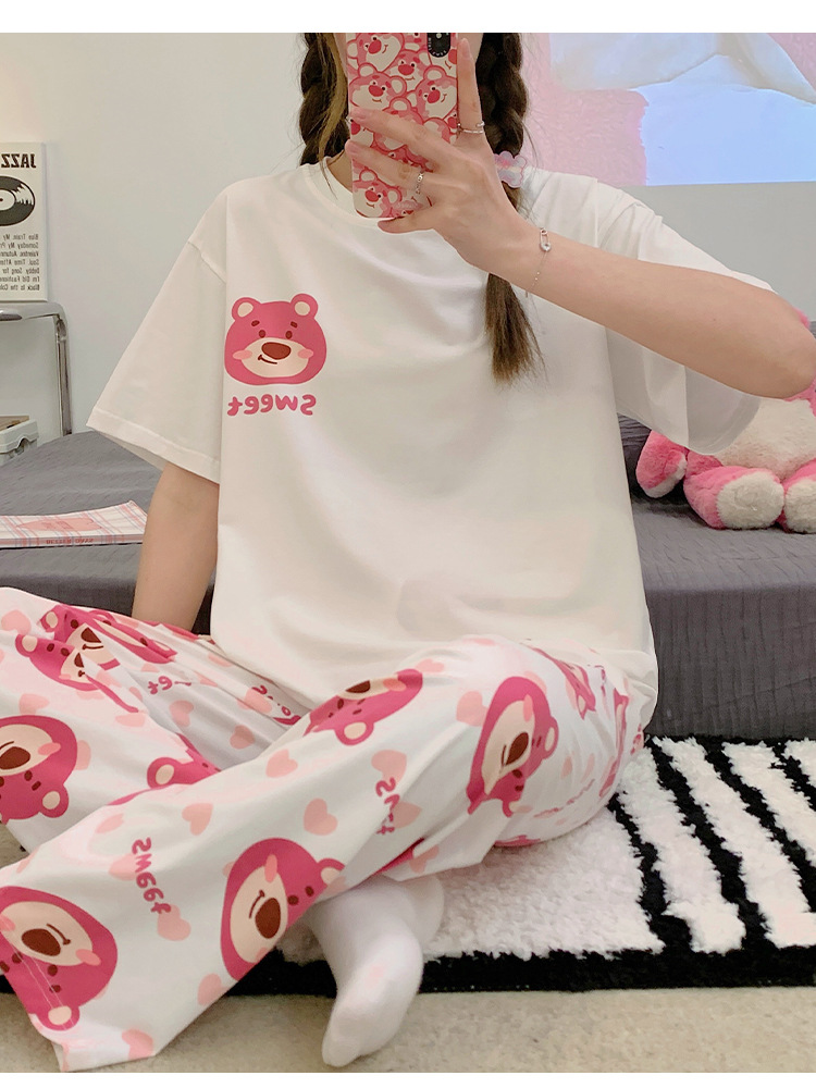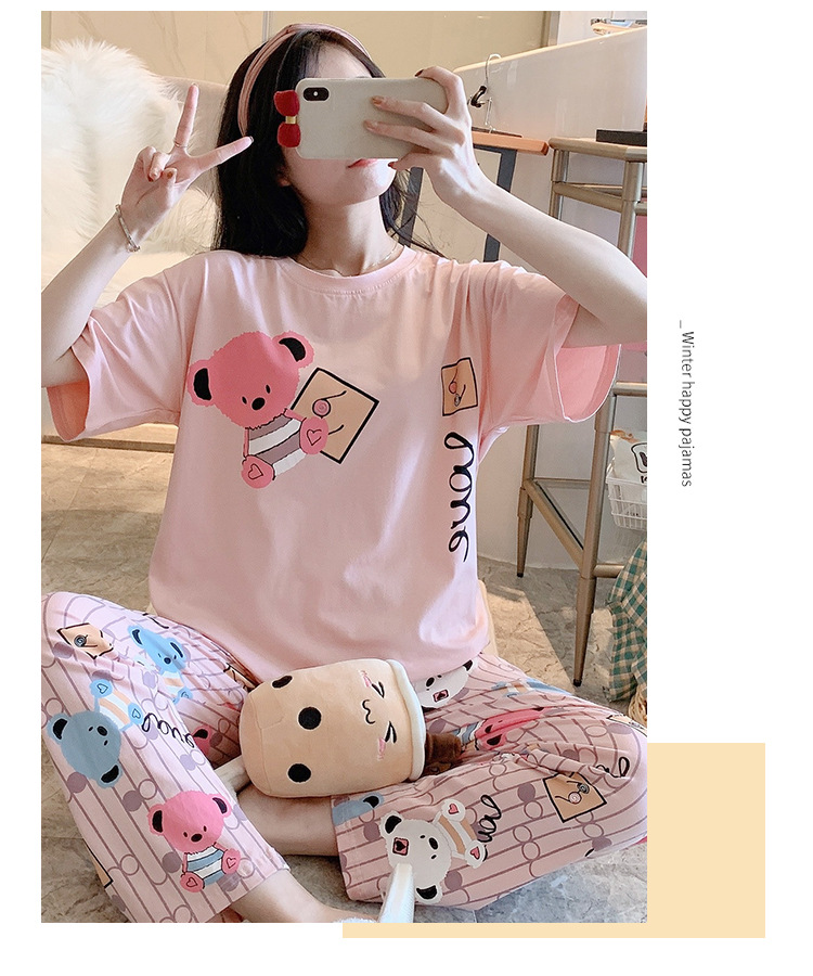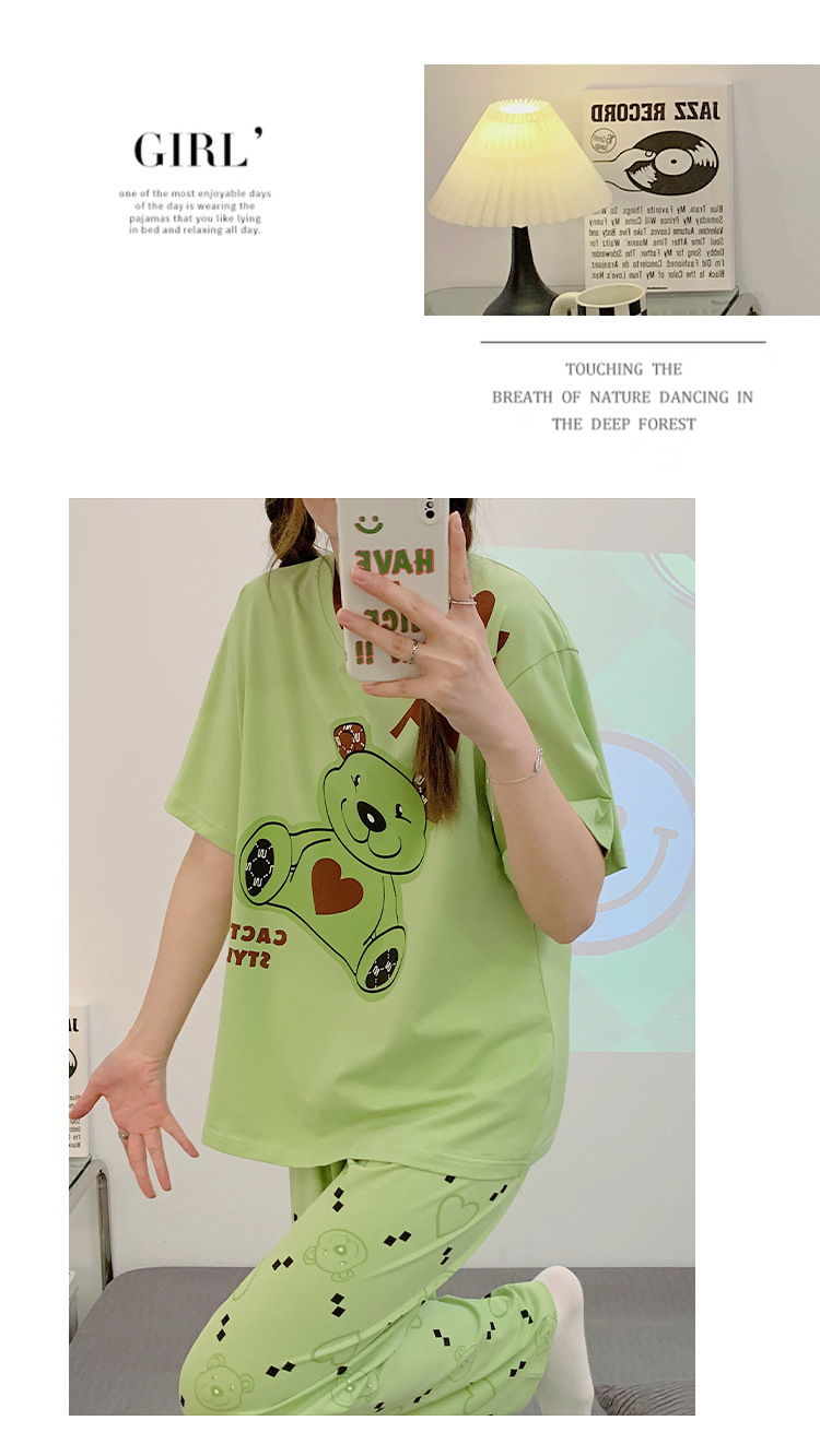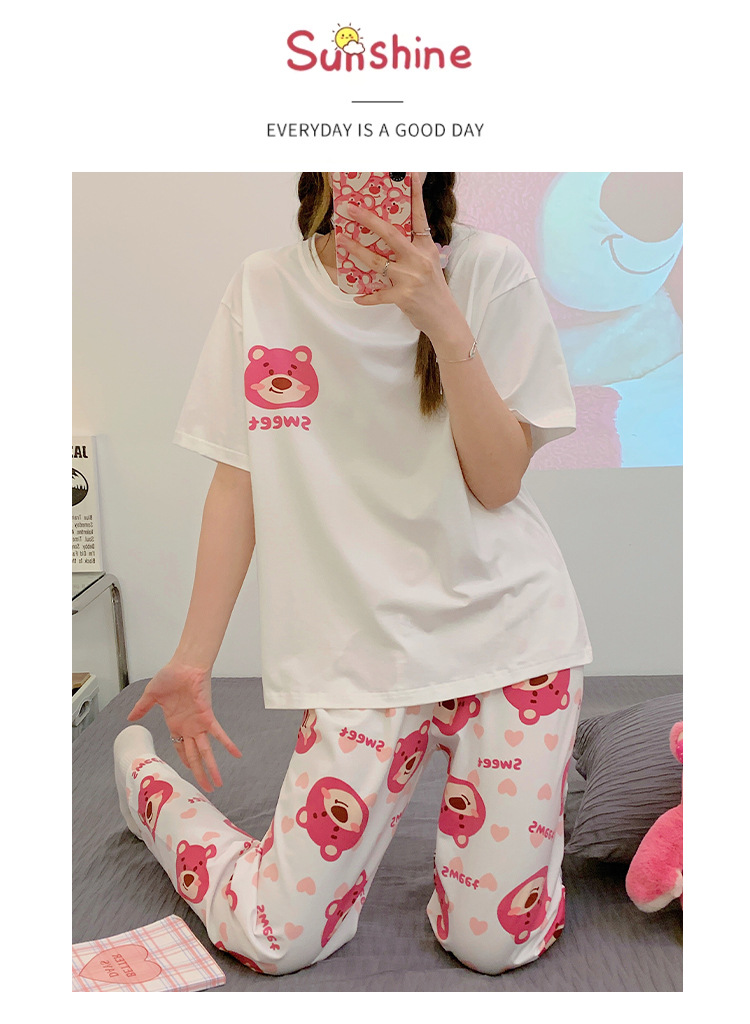 2024 봄과 여름 면 잠옷 여성 한국식 만화 크루 넥 반팔 바지 세트 캐주얼 홈웨어스토어 가기