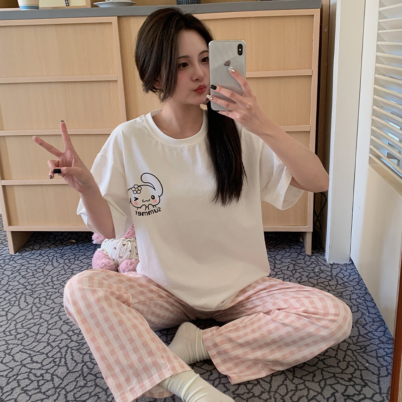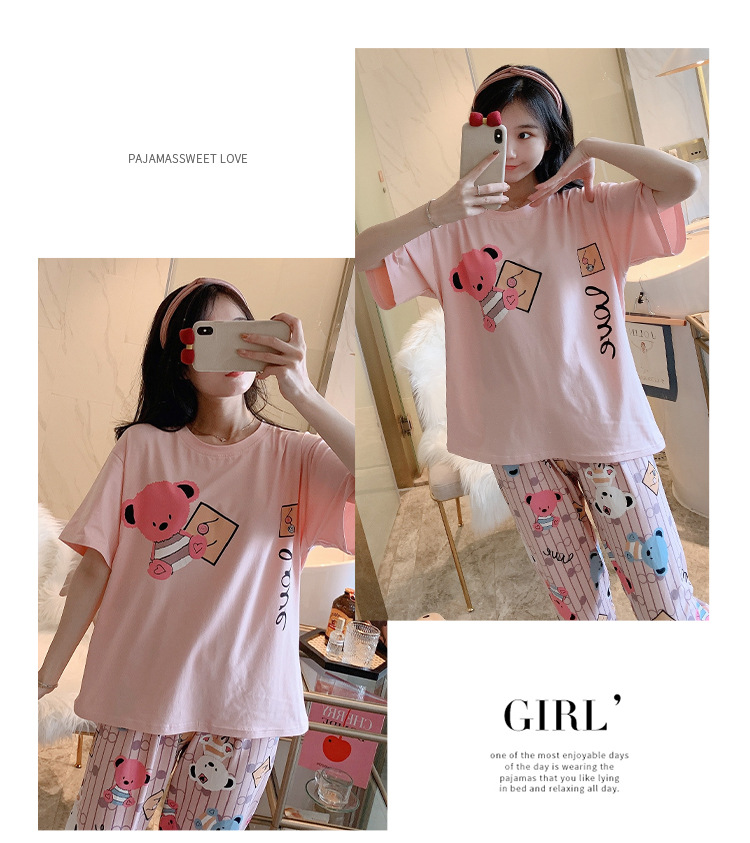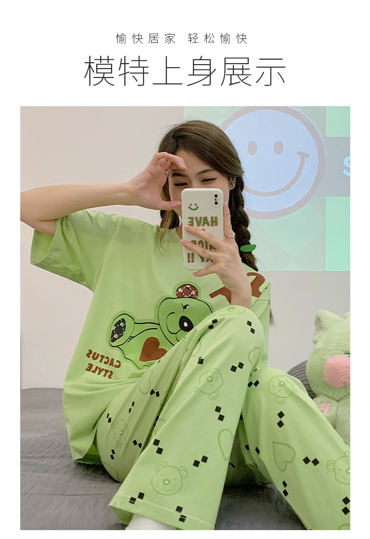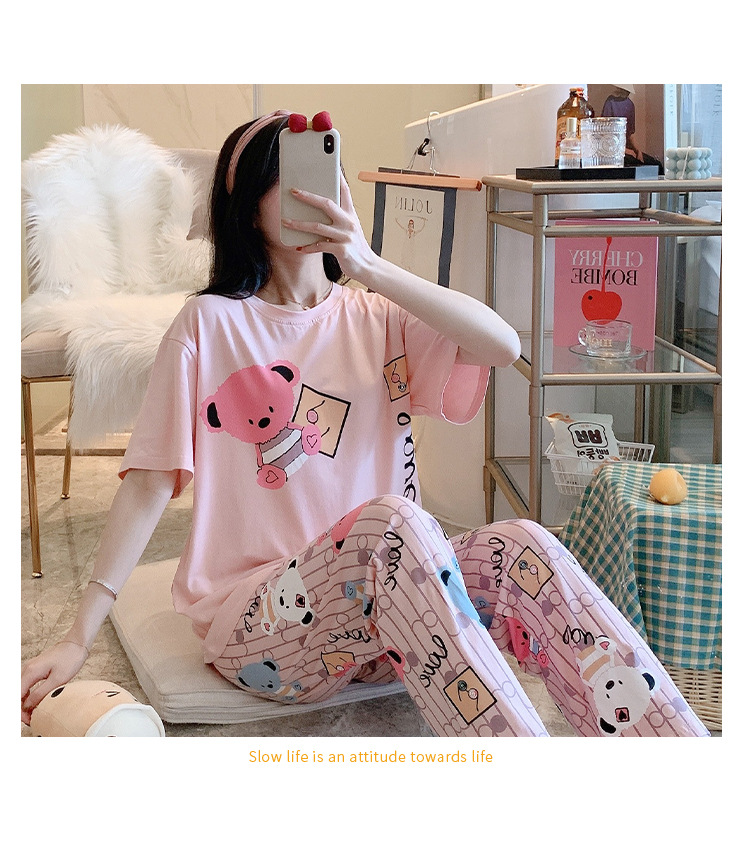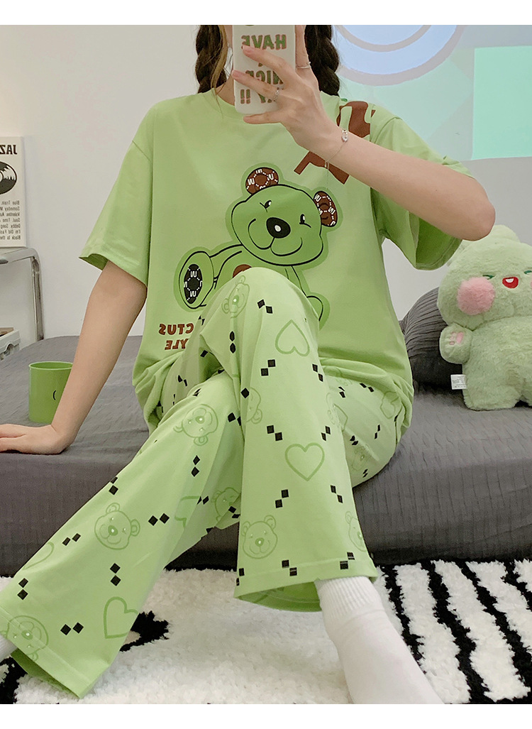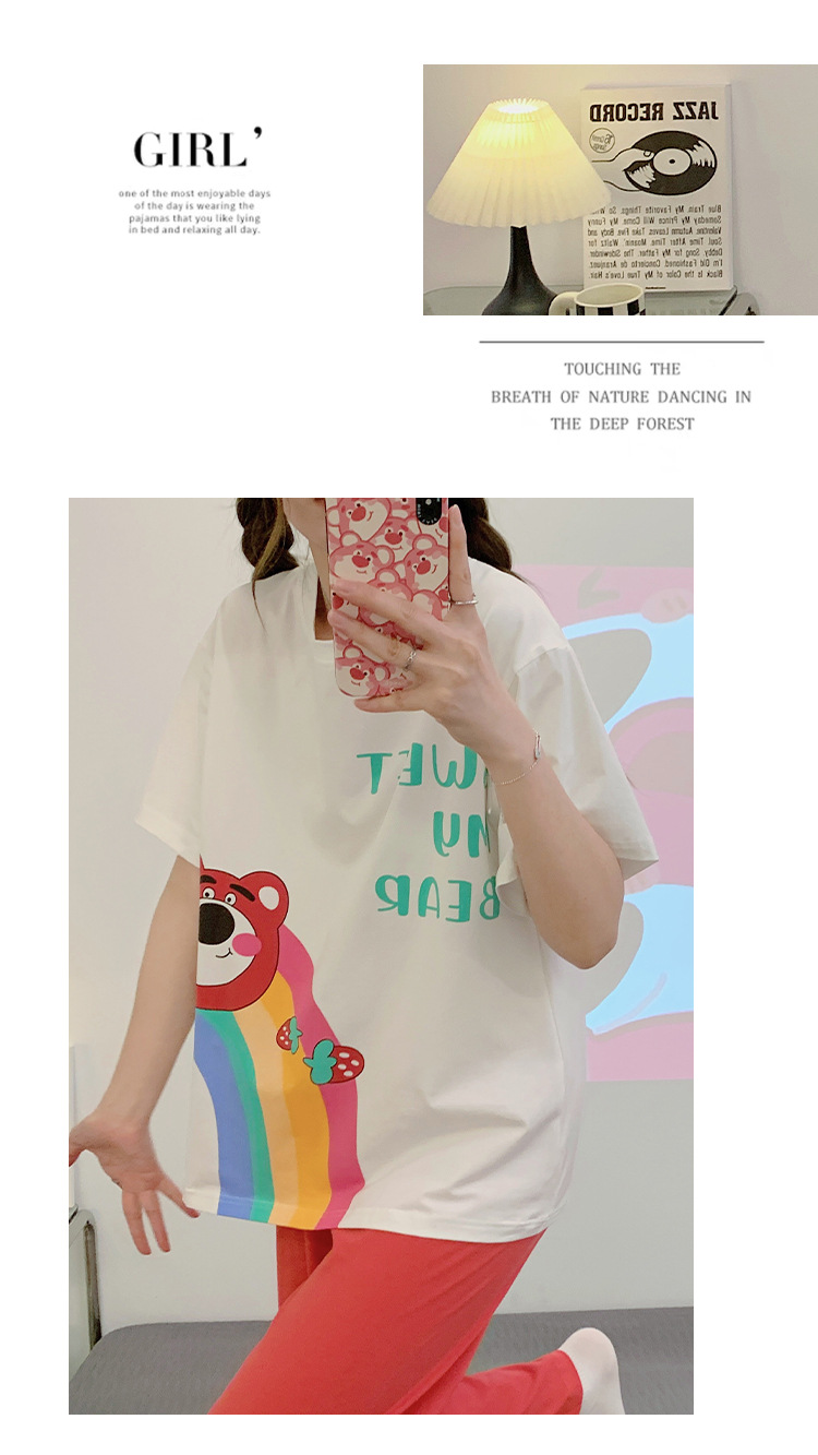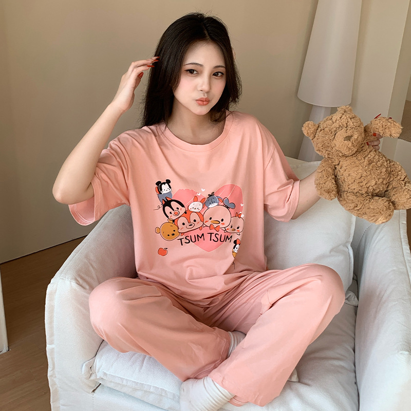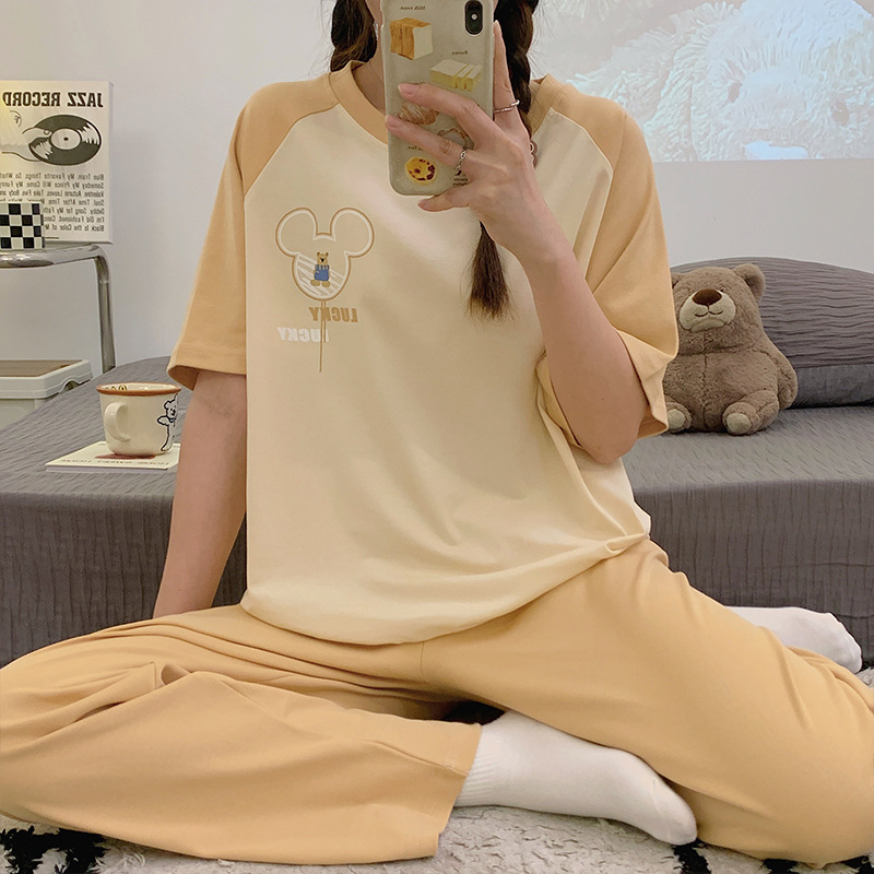 2024 봄과 여름 면 잠옷 여성 한국식 만화 크루 넥 반팔 바지 세트 캐주얼 홈웨어스토어 가기