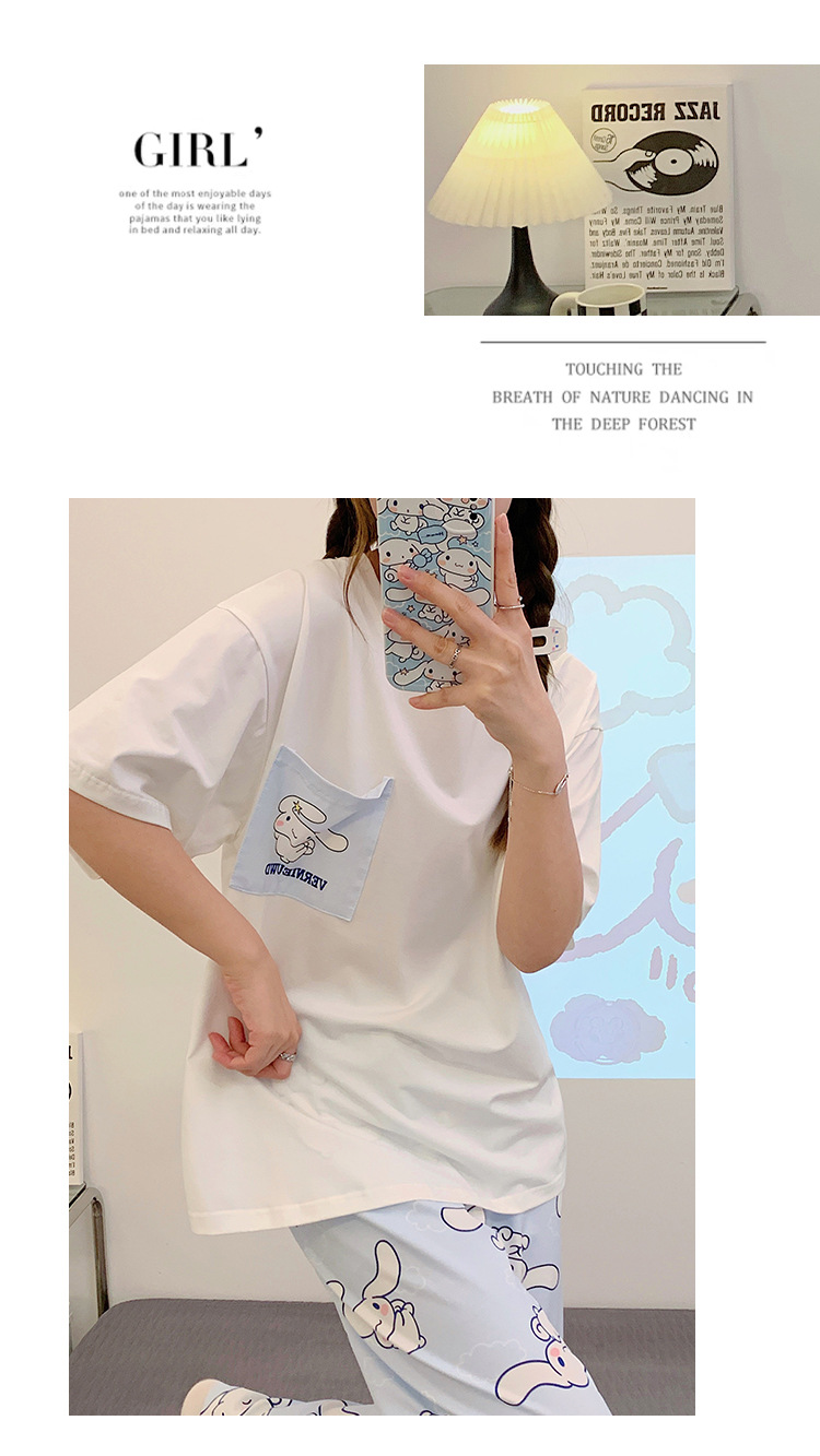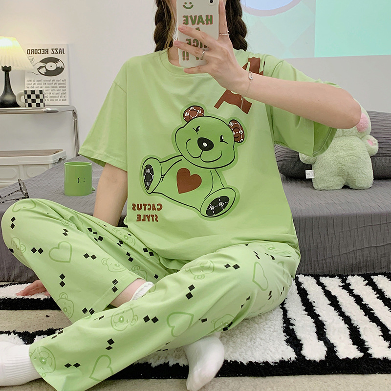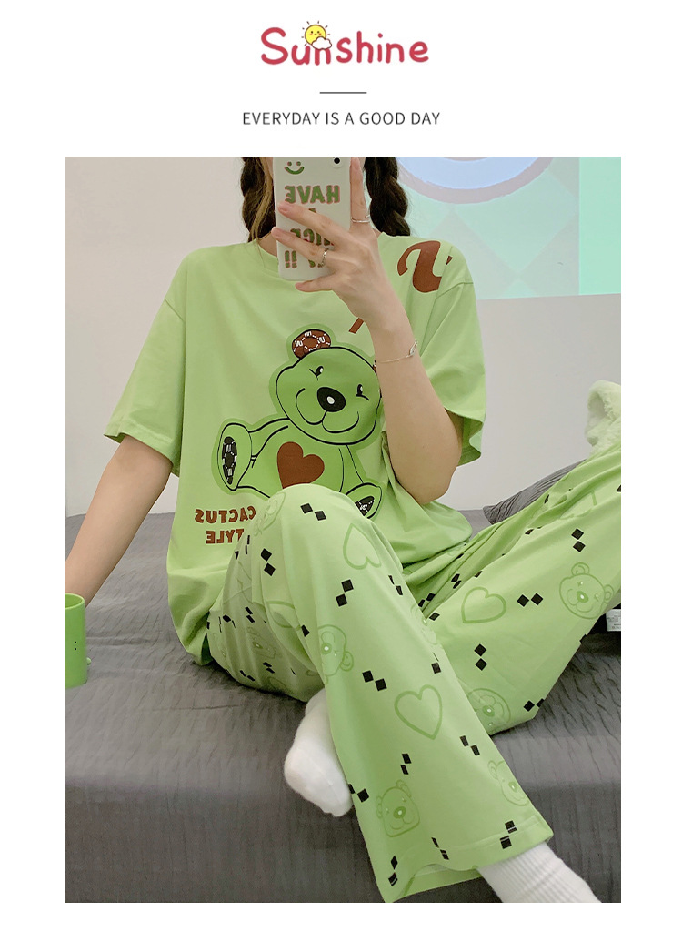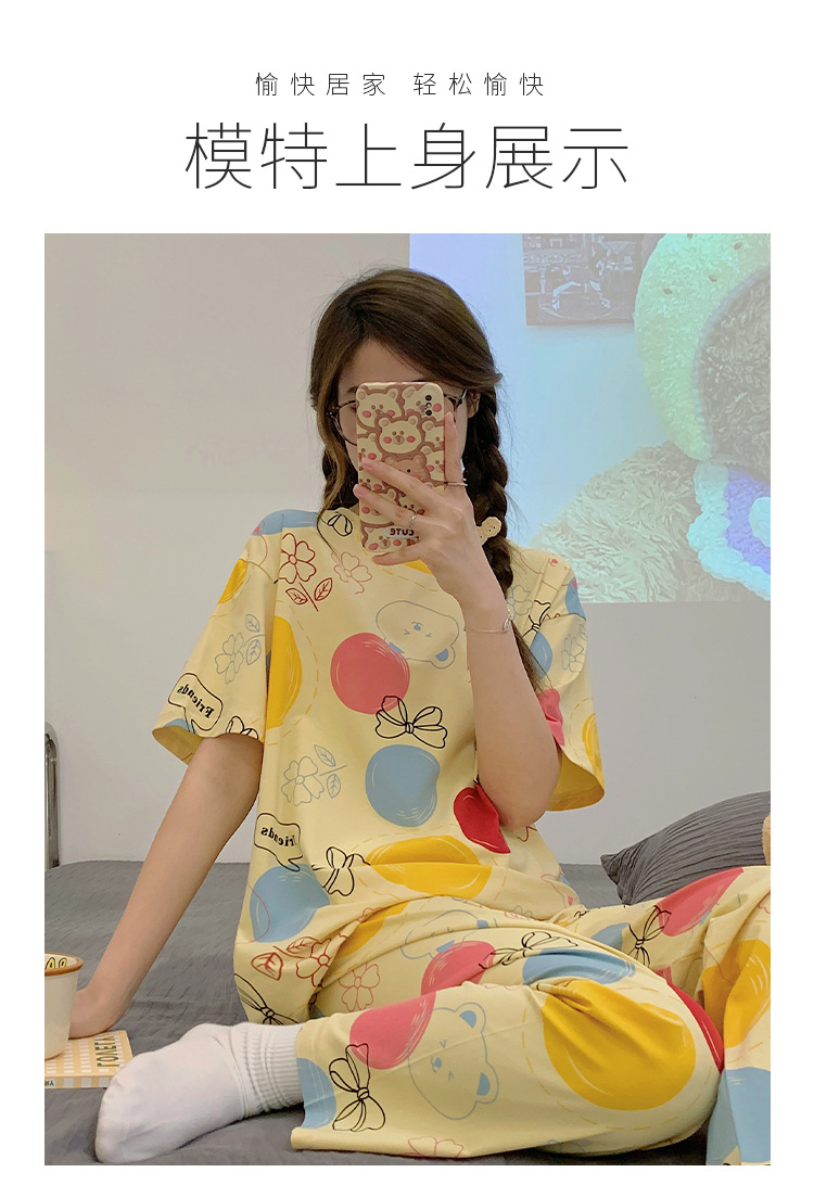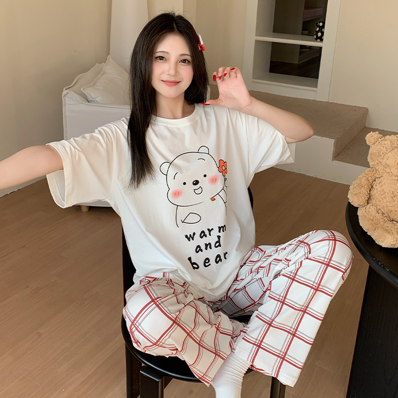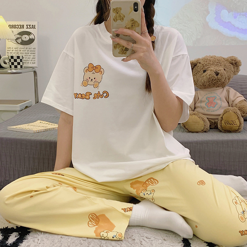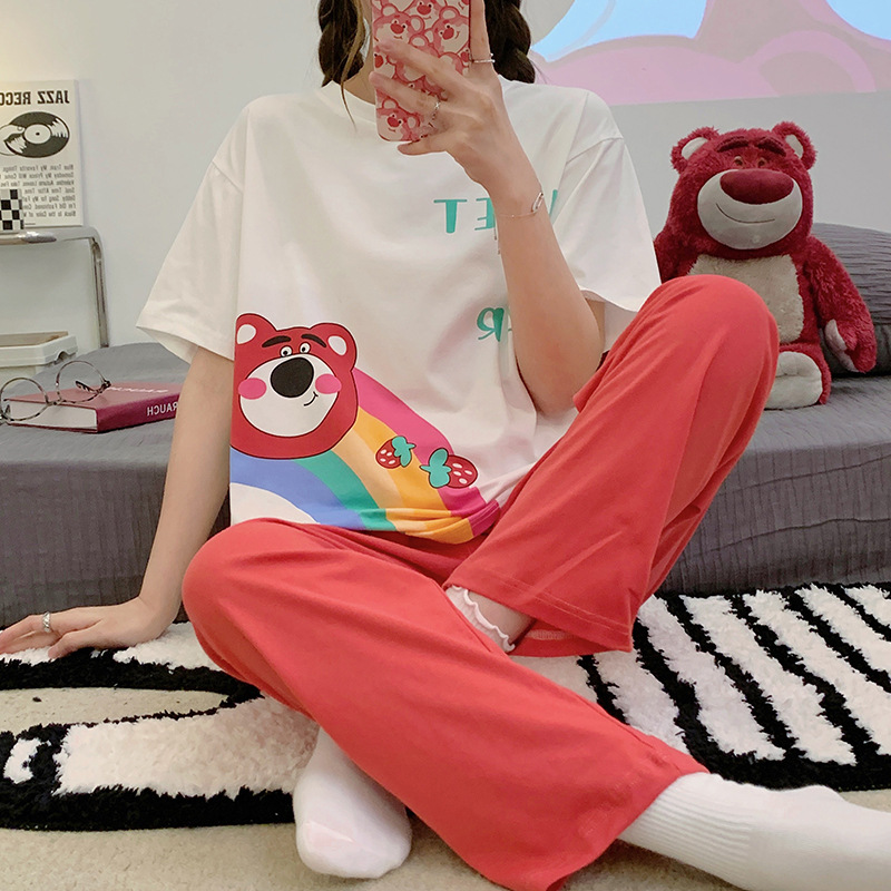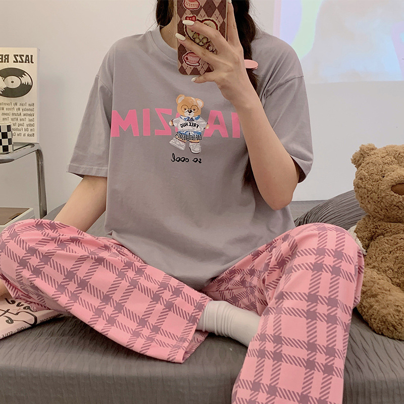 2024 봄과 여름 면 잠옷 여성 한국식 만화 크루 넥 반팔 바지 세트 캐주얼 홈웨어스토어 가기