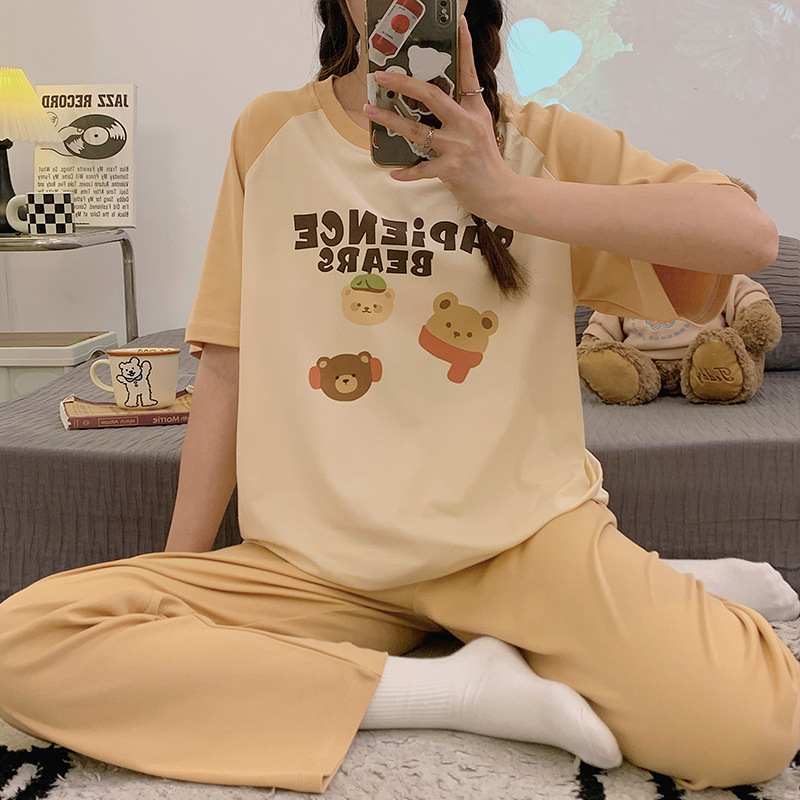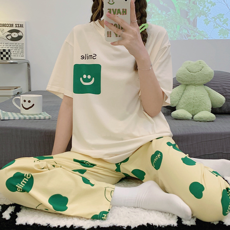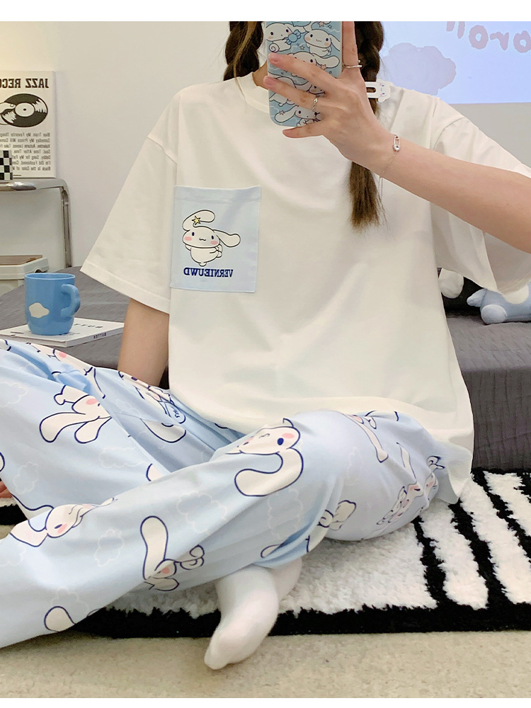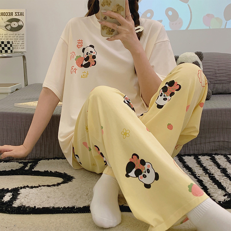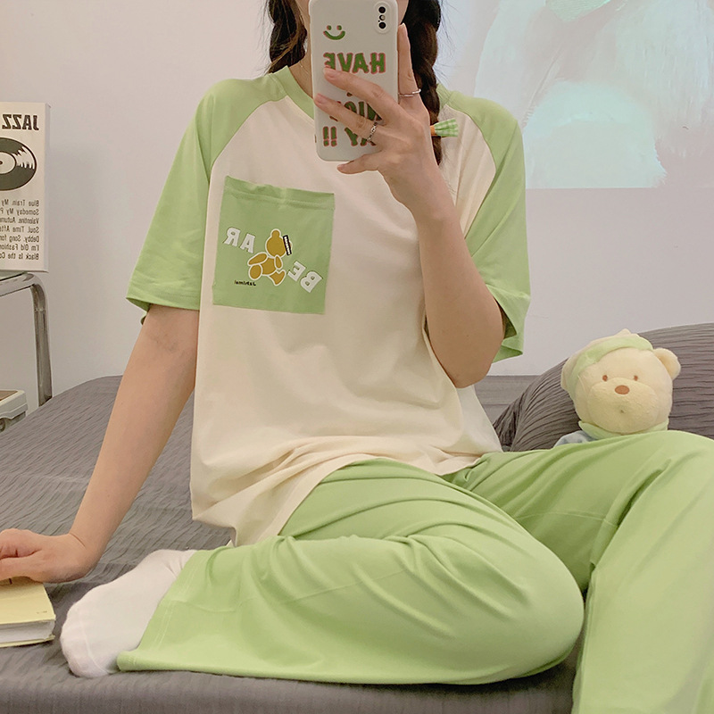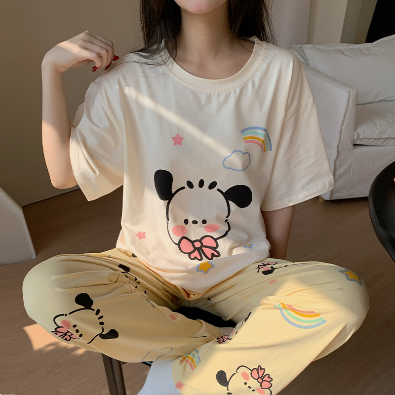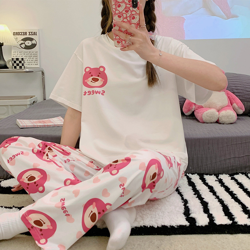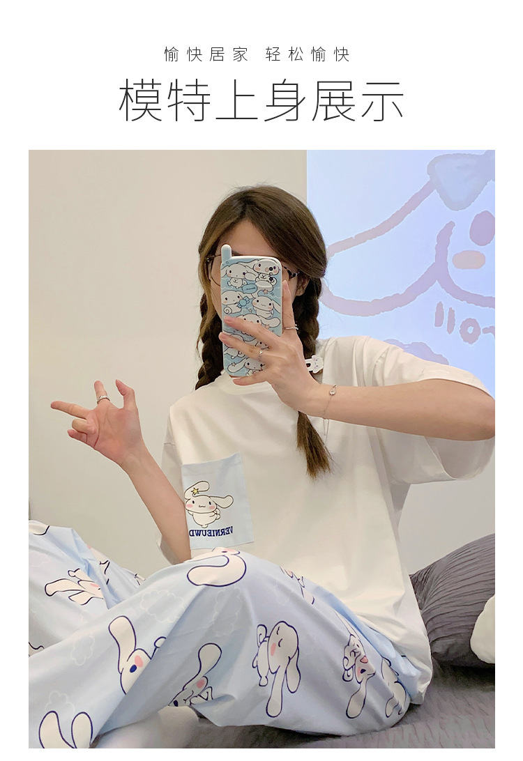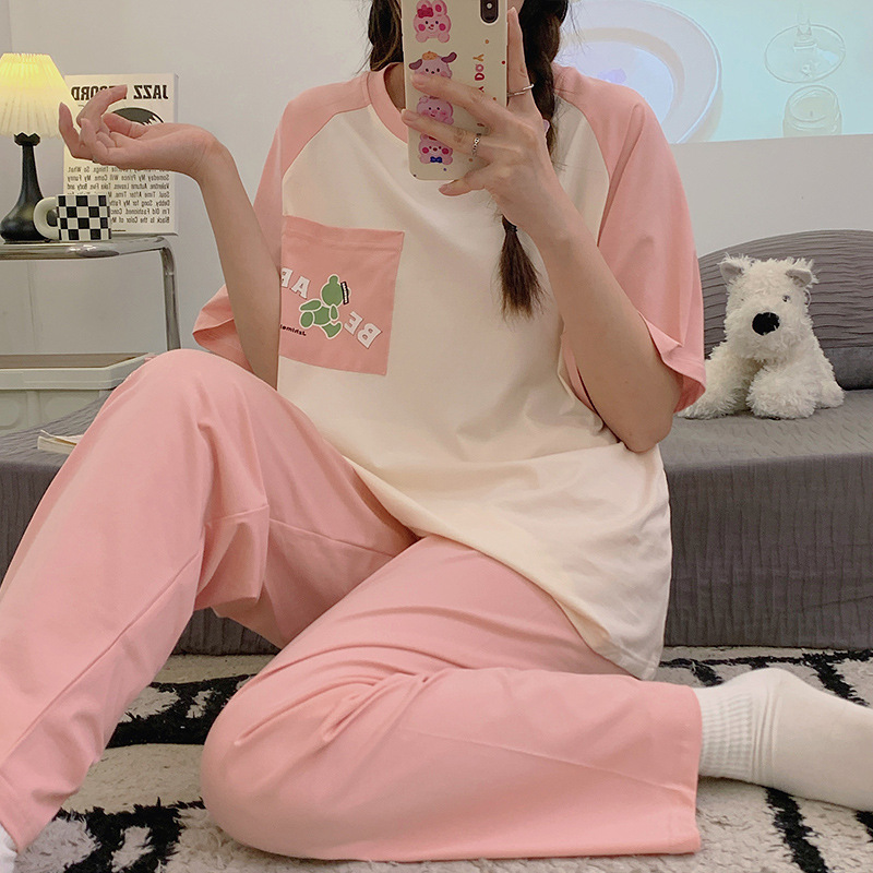 2024 봄과 여름 면 잠옷 여성 한국식 만화 크루 넥 반팔 바지 세트 캐주얼 홈웨어스토어 가기