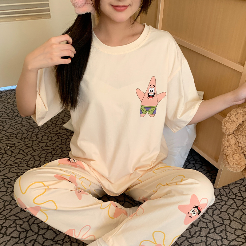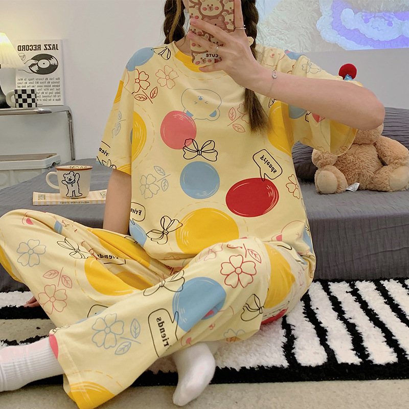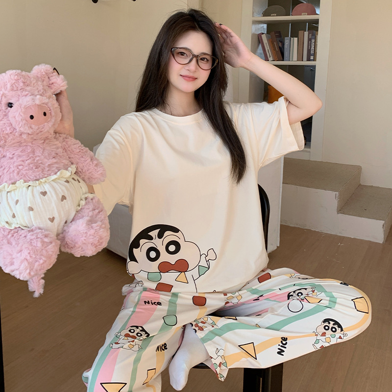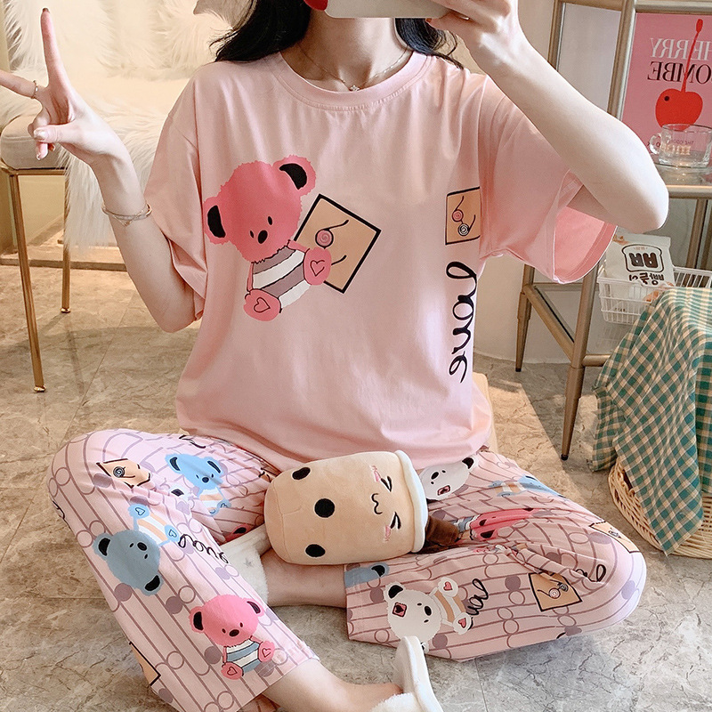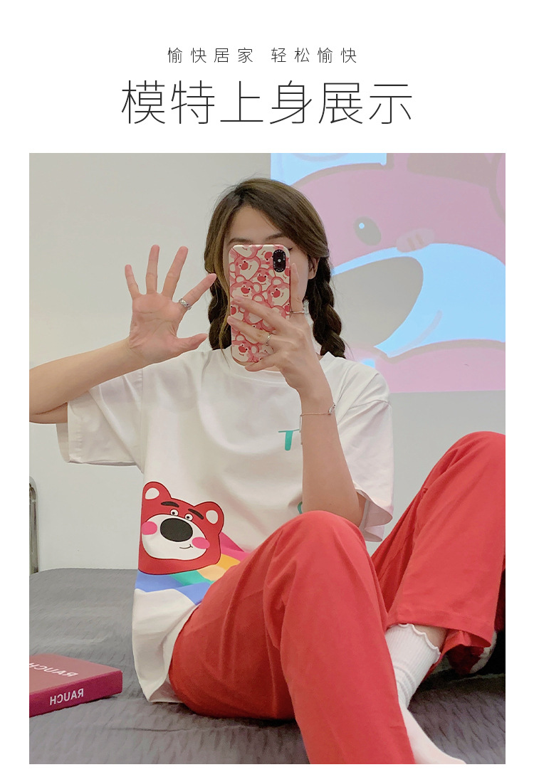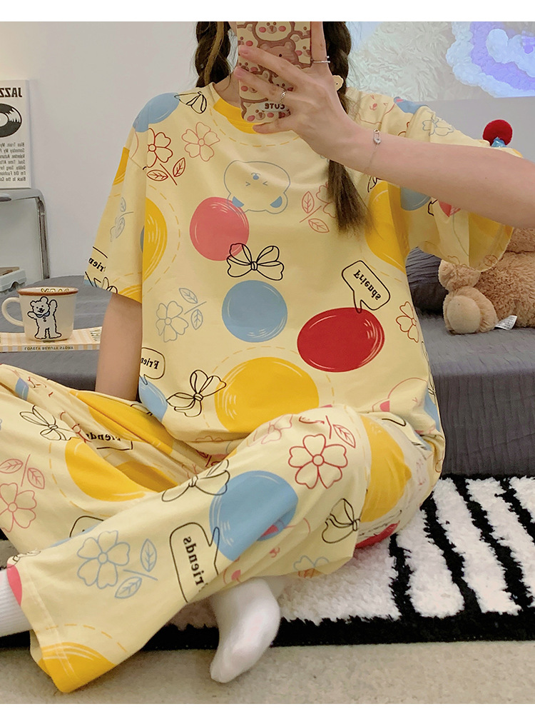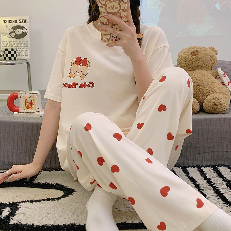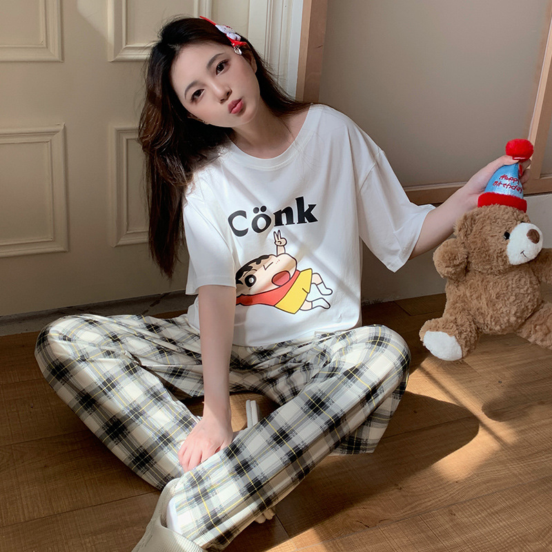 2024 봄과 여름 면 잠옷 여성 한국식 만화 크루 넥 반팔 바지 세트 캐주얼 홈웨어스토어 가기