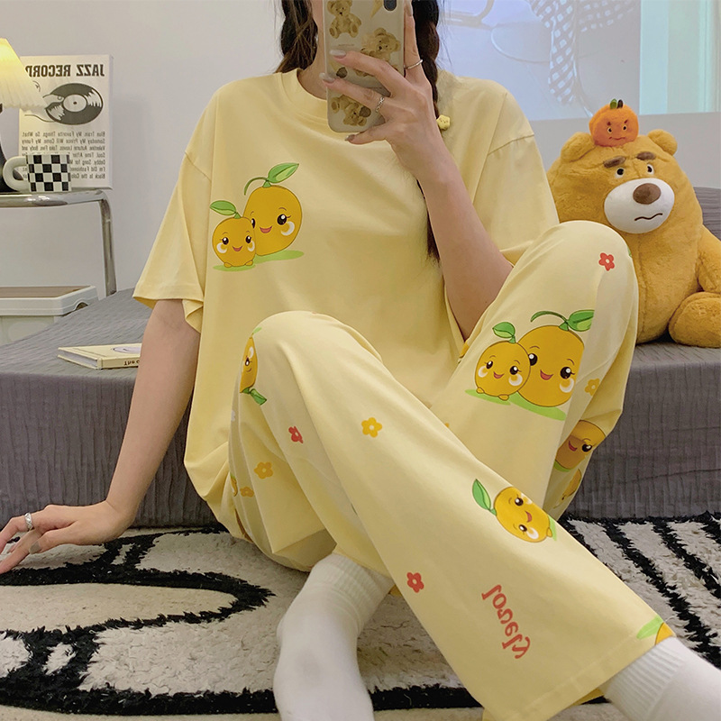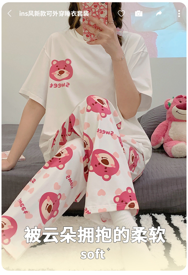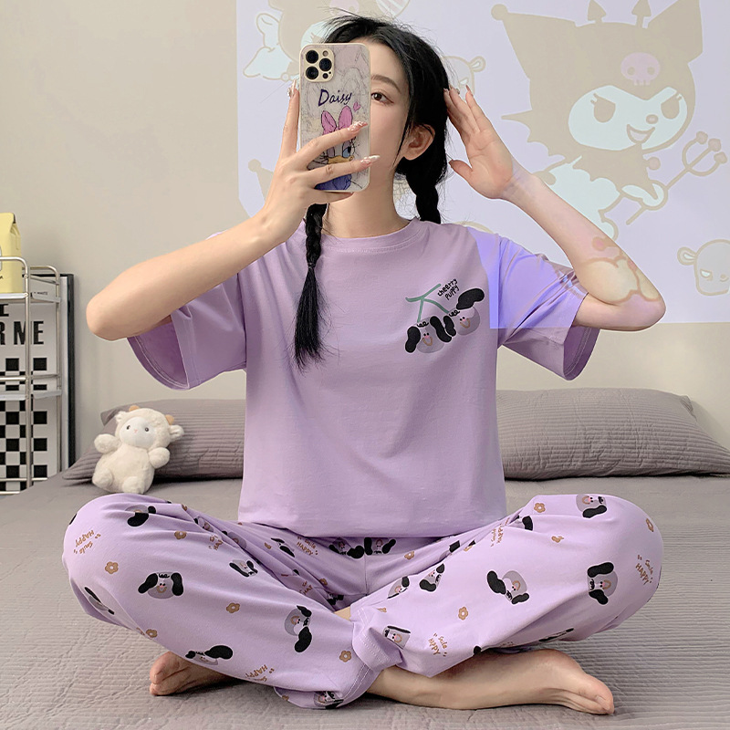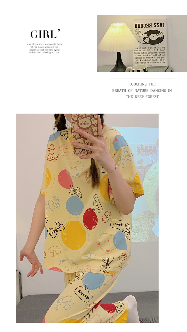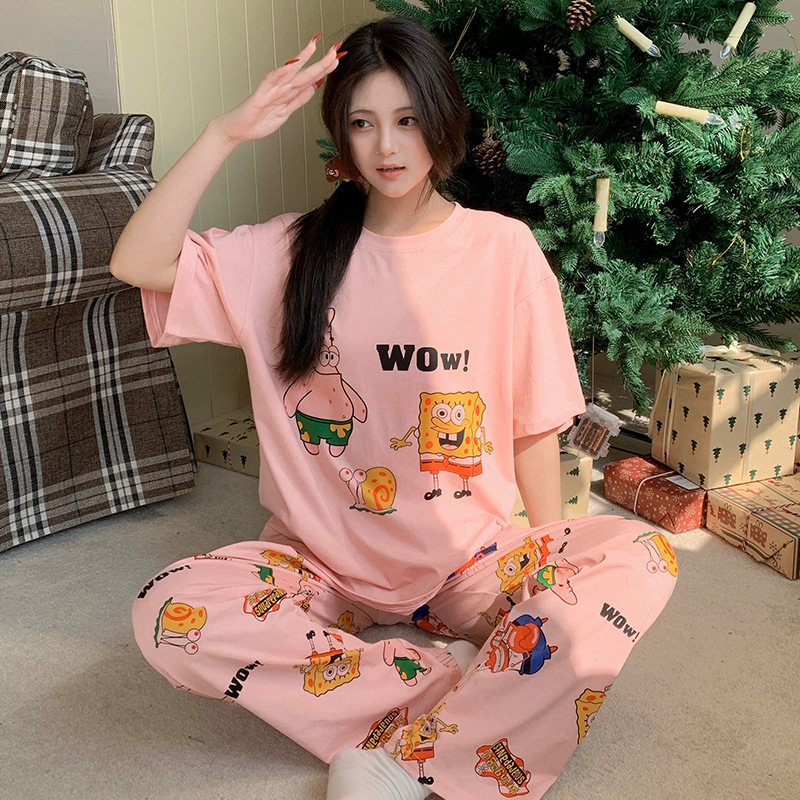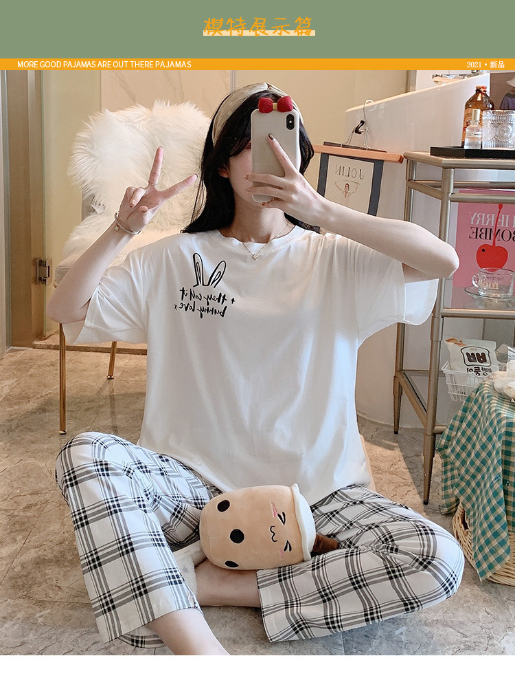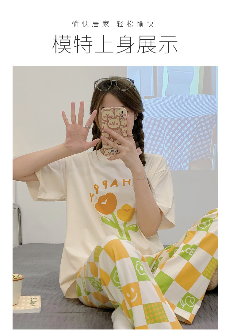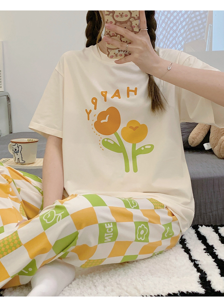 2024 봄과 여름 면 잠옷 여성 한국식 만화 크루 넥 반팔 바지 세트 캐주얼 홈웨어스토어 가기