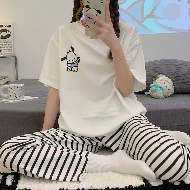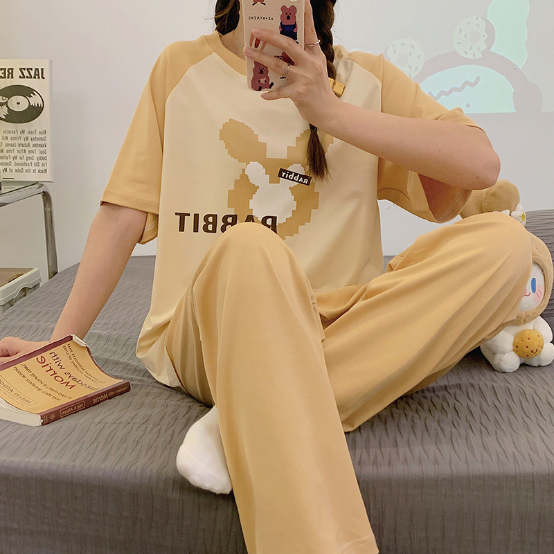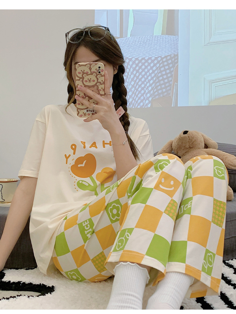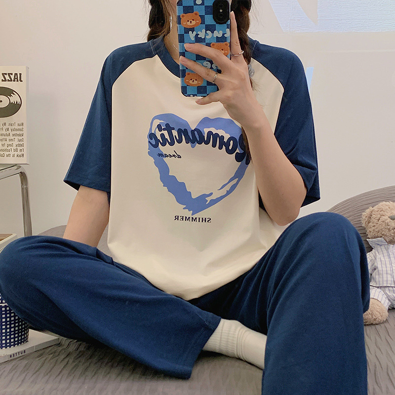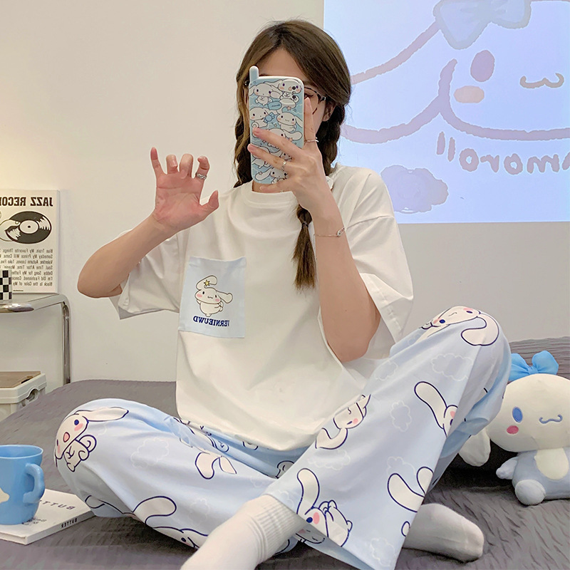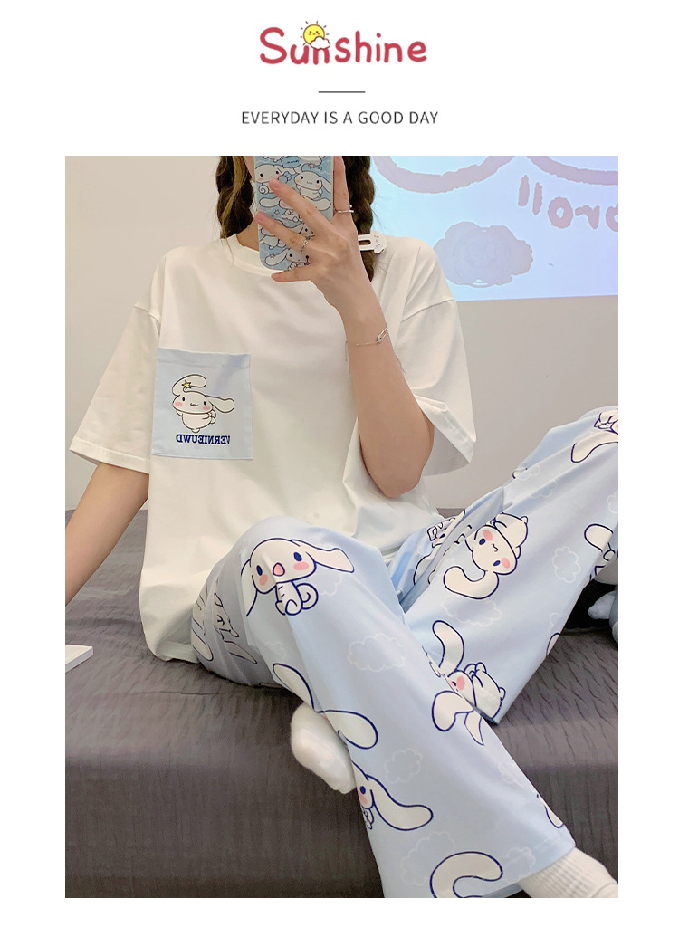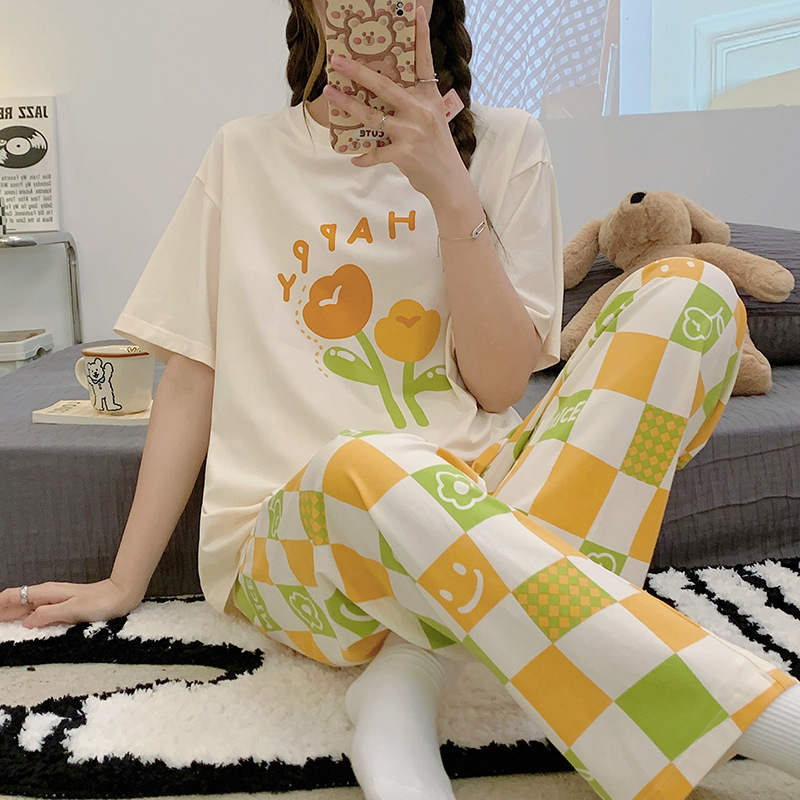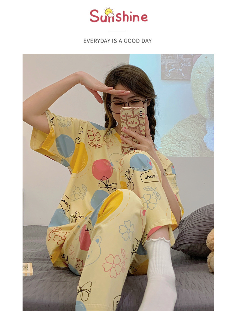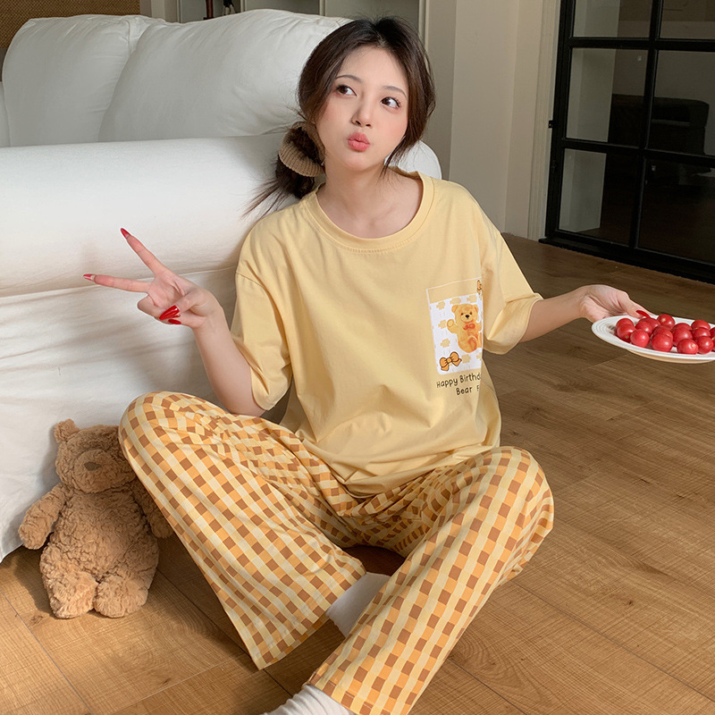 2024 봄과 여름 면 잠옷 여성 한국식 만화 크루 넥 반팔 바지 세트 캐주얼 홈웨어스토어 가기