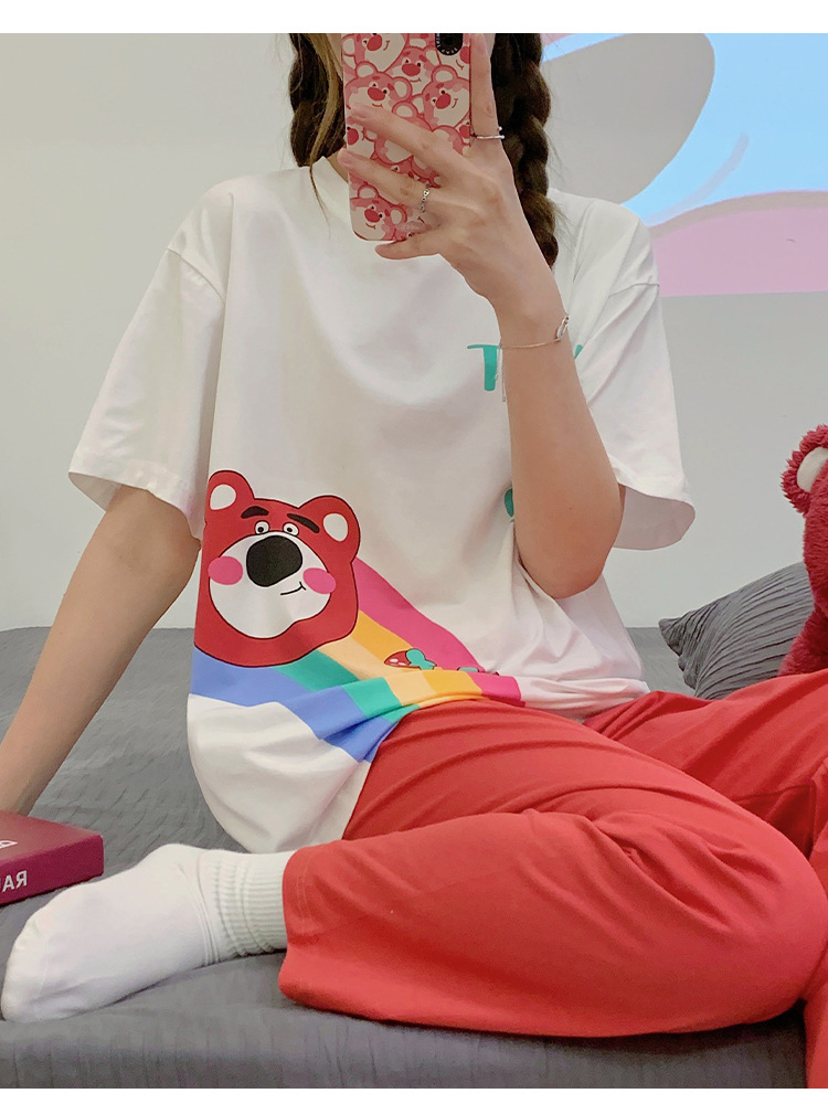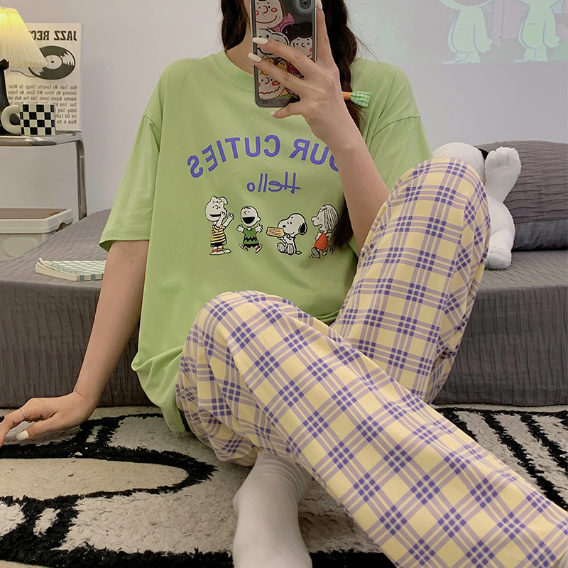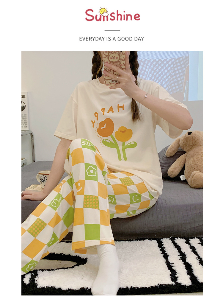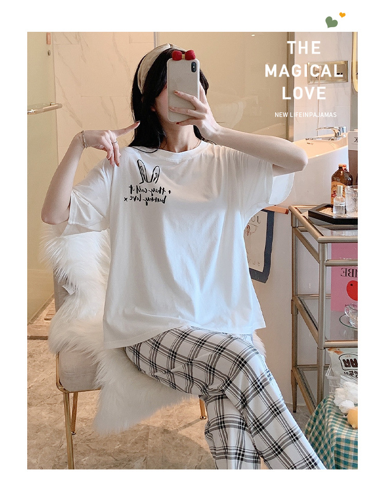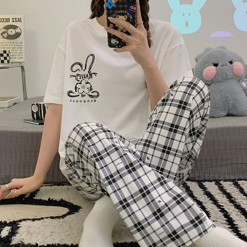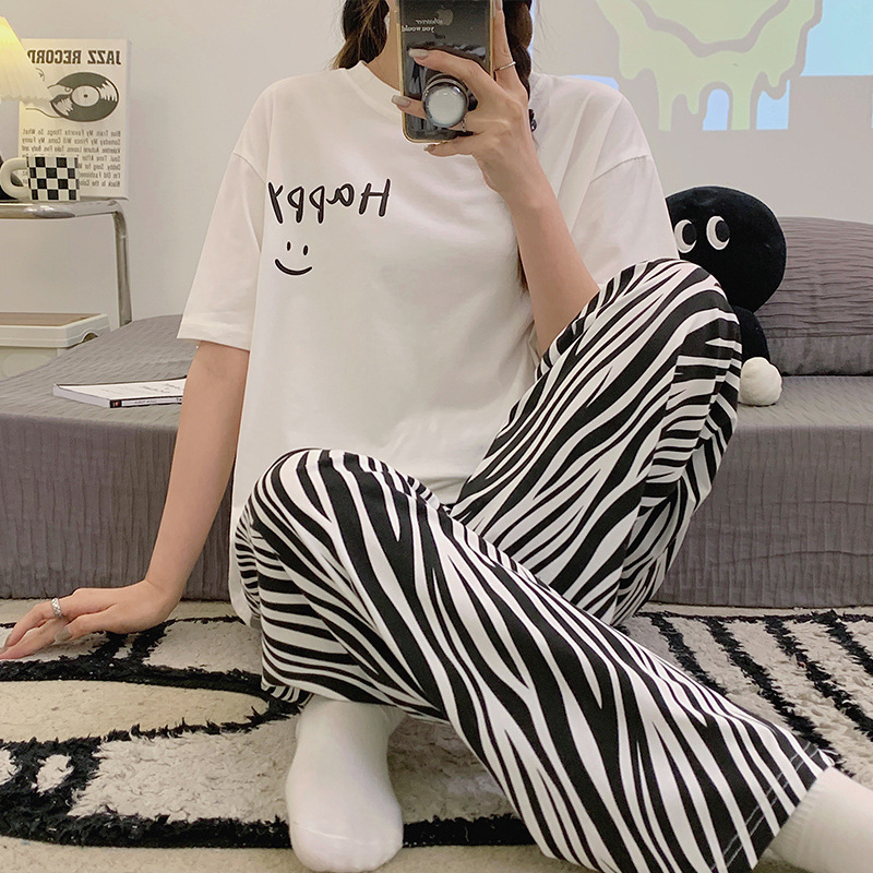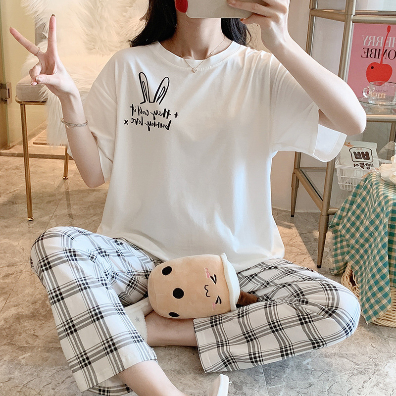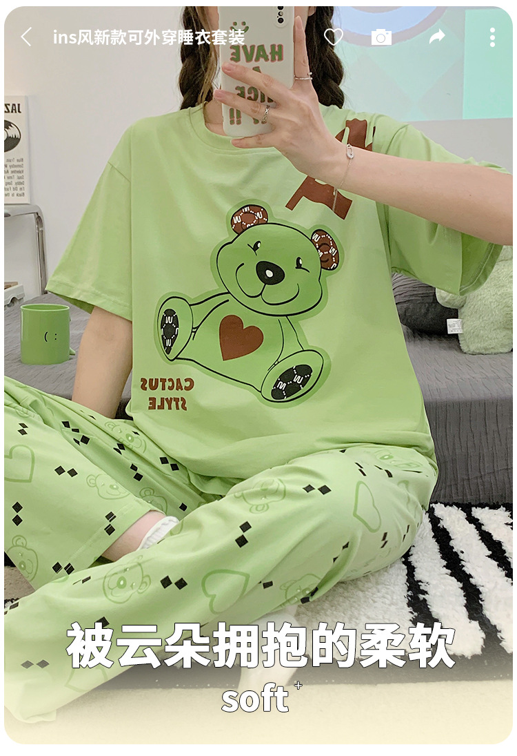 2024 봄과 여름 면 잠옷 여성 한국식 만화 크루 넥 반팔 바지 세트 캐주얼 홈웨어스토어 가기