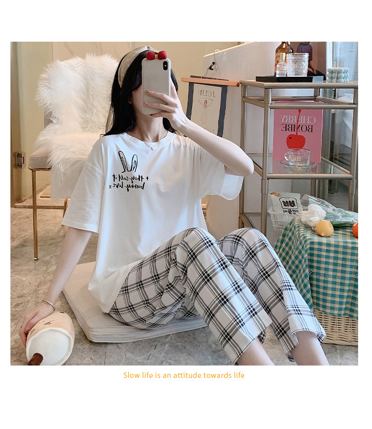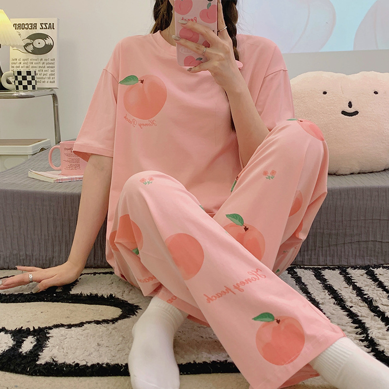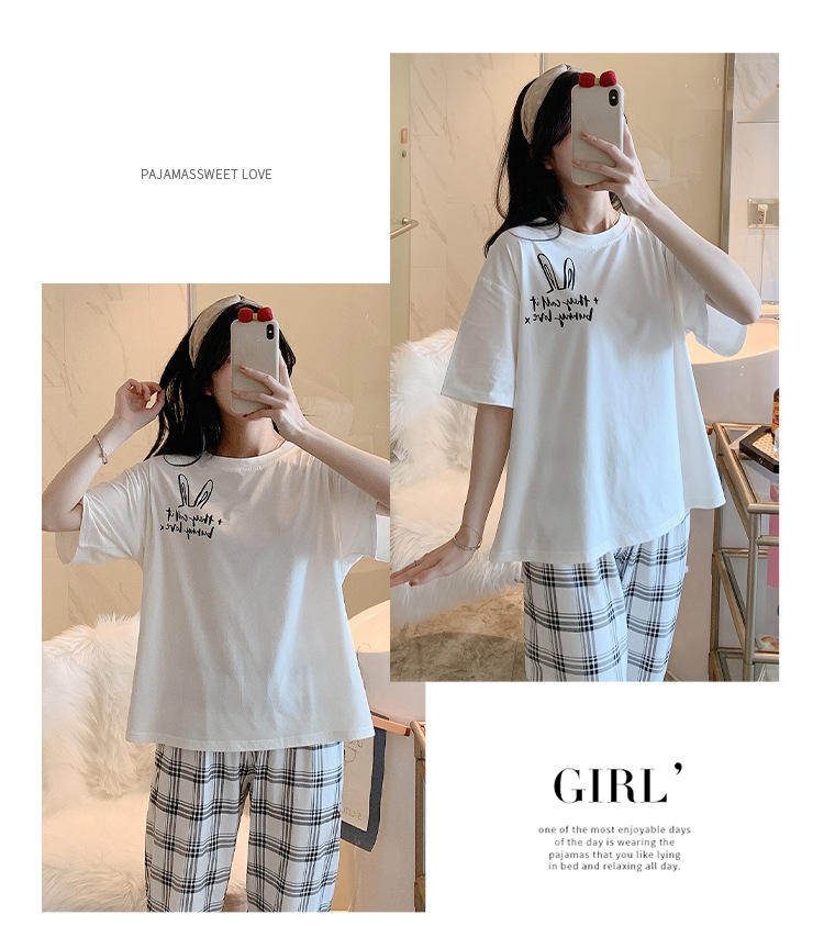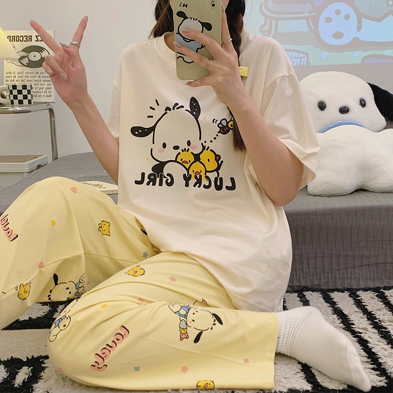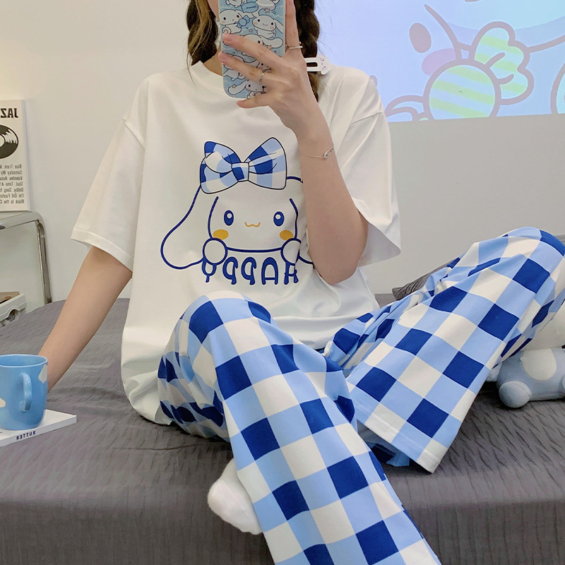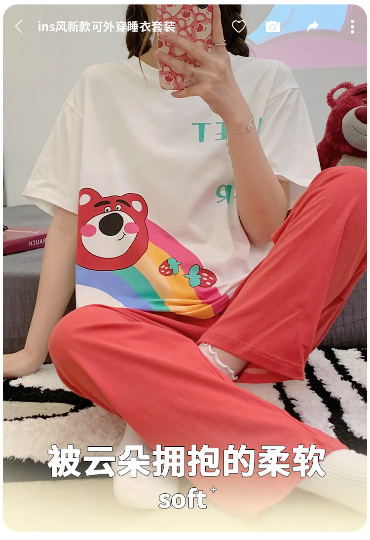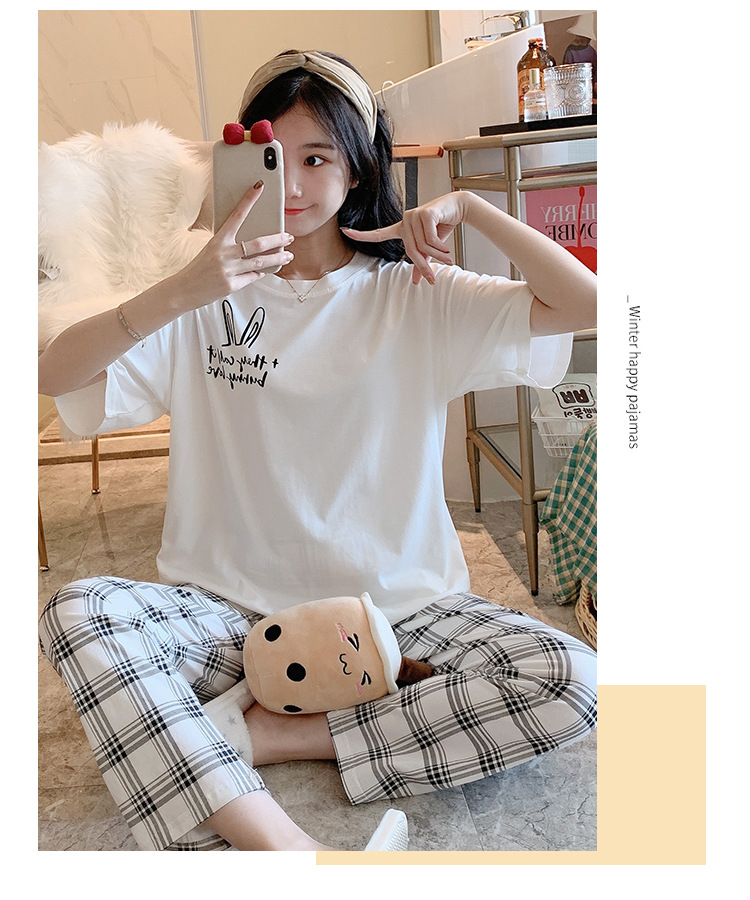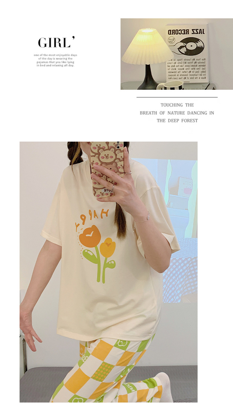 2024 봄과 여름 면 잠옷 여성 한국식 만화 크루 넥 반팔 바지 세트 캐주얼 홈웨어스토어 가기