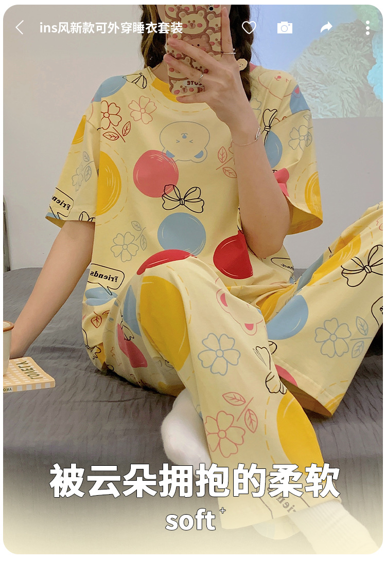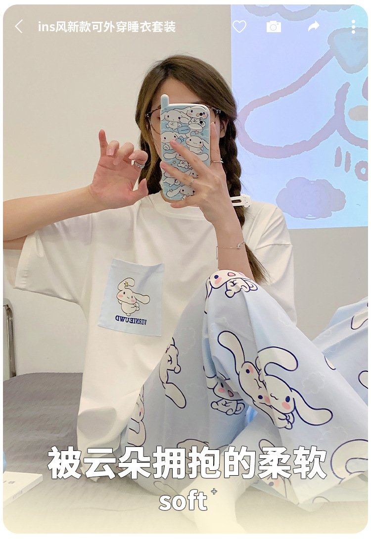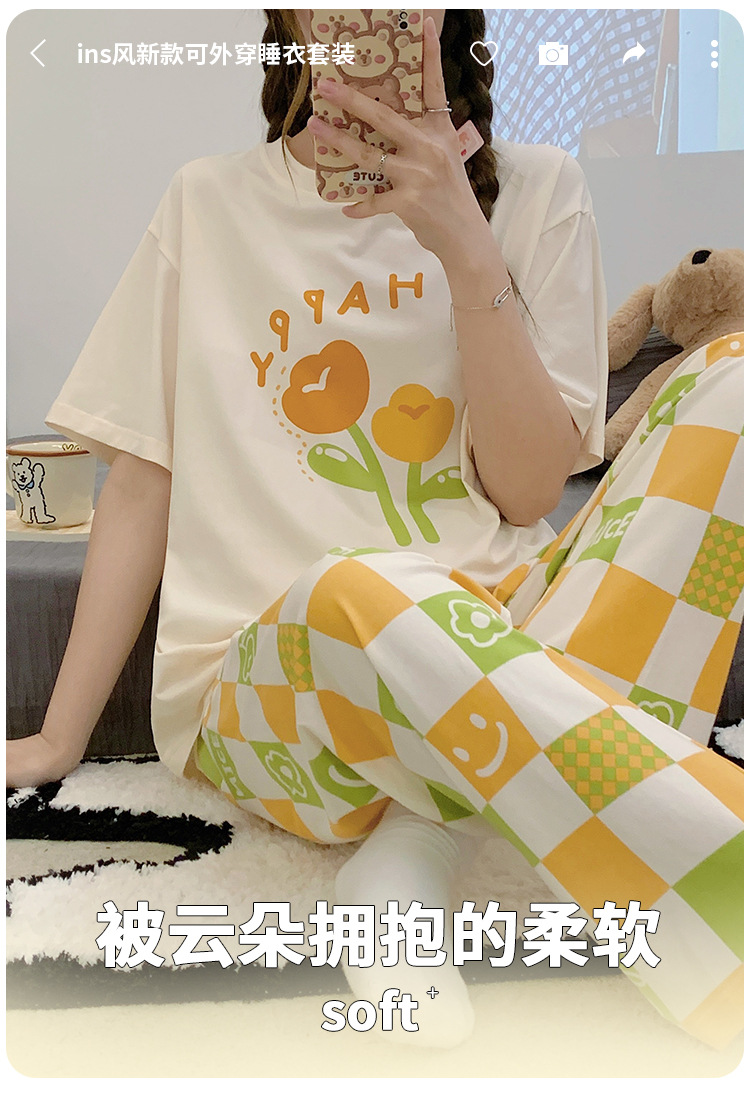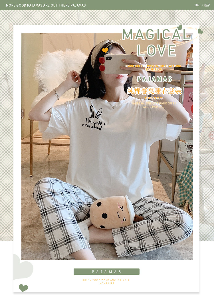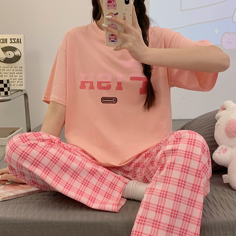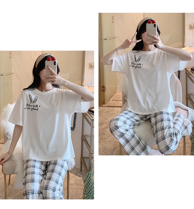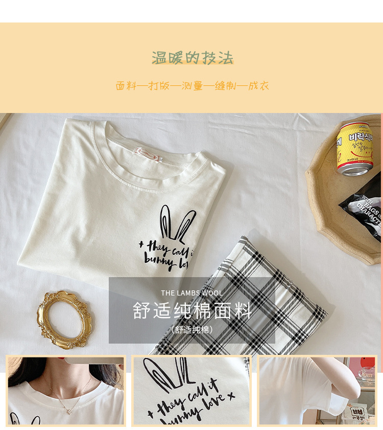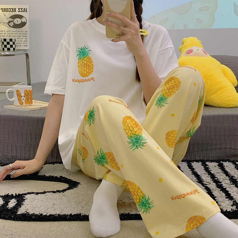 2024 봄과 여름 면 잠옷 여성 한국식 만화 크루 넥 반팔 바지 세트 캐주얼 홈웨어스토어 가기