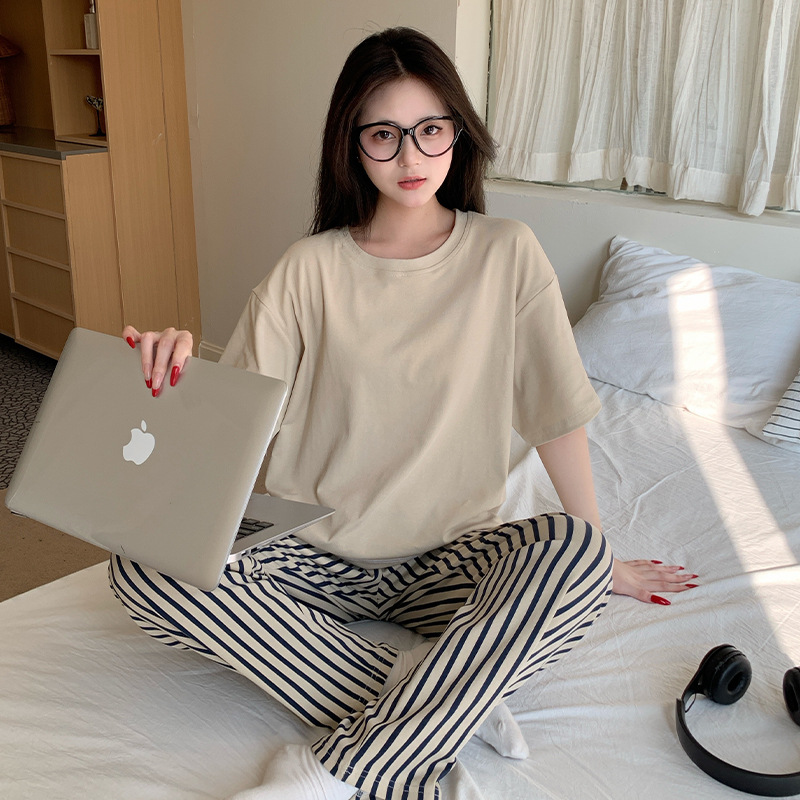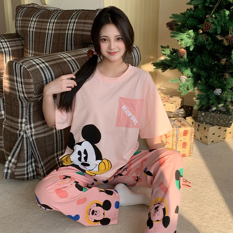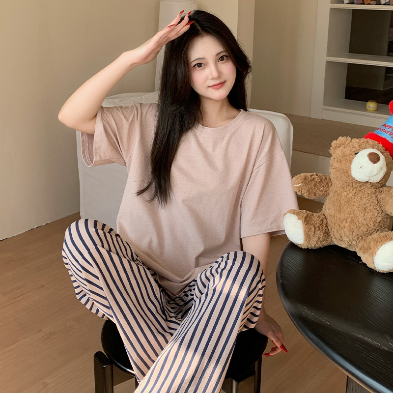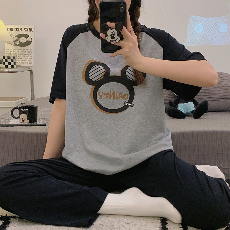 2024 봄과 여름 면 잠옷 여성 한국식 만화 크루 넥 반팔 바지 세트 캐주얼 홈웨어