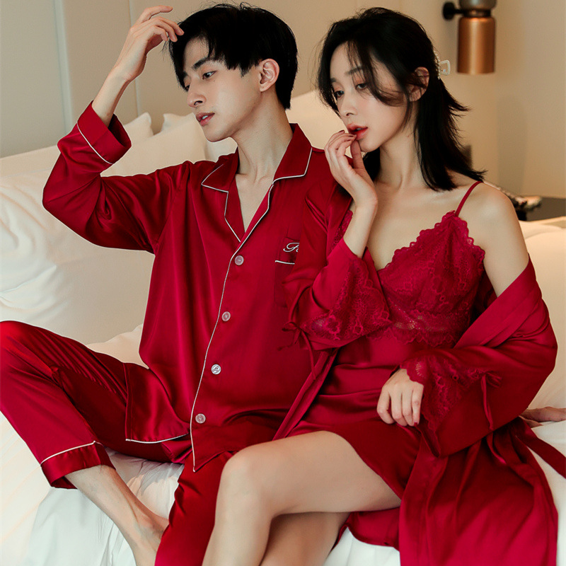 커플 잠옷 봄과 가을 긴 소매 여자의 섹시한 뜨거운 슬링 잠옷 얼음 실크 여름 남자의 얇은 실크 가정 옷