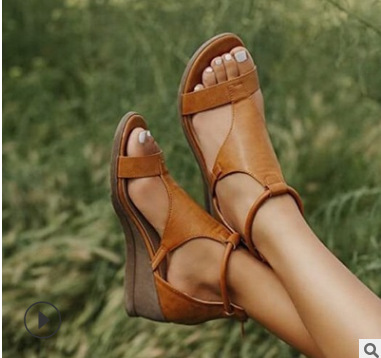 크로스보더 대형 사이즈 로마 레트로 심플 캐주얼 웨지힐 버클 여성화, 통기성 좋고 가벼운 레이스업 로우힐, 재고 있음스토어 가기