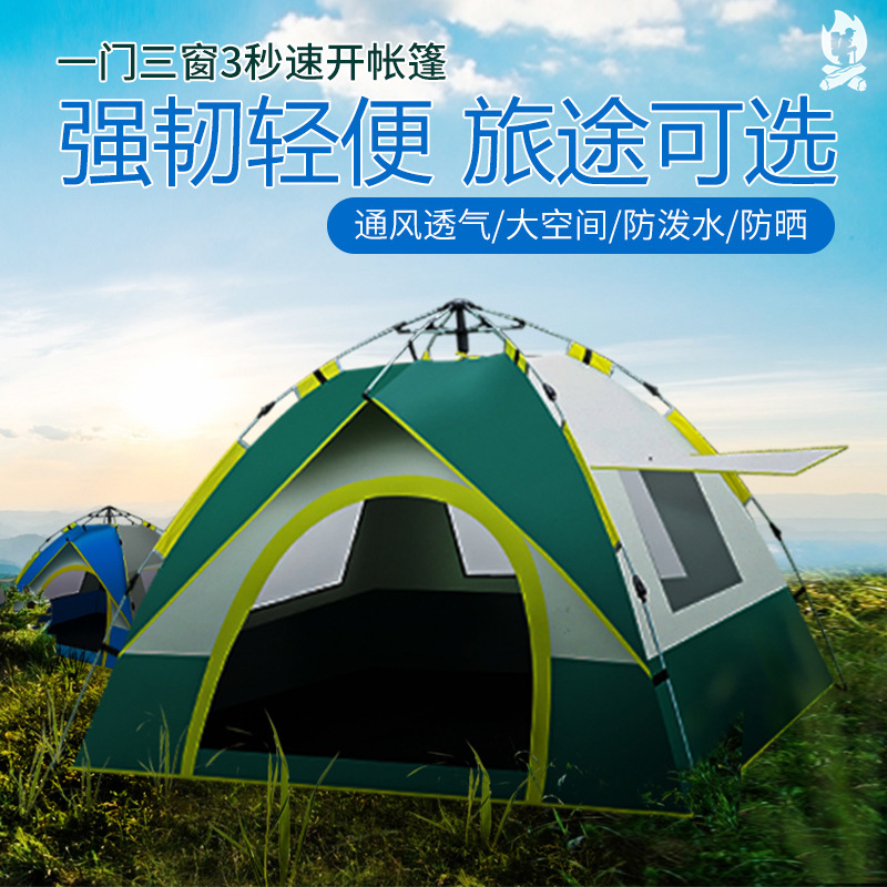 新品特点:采用防晒、防紫外线银胶布面料,防撕裂B3网纱;单门三个大窗,增强户外视野,和透气性,帐篷3个窗帘都可单独打开,用防风绳固定