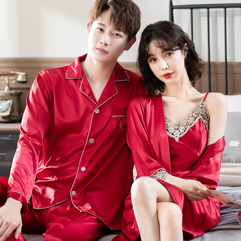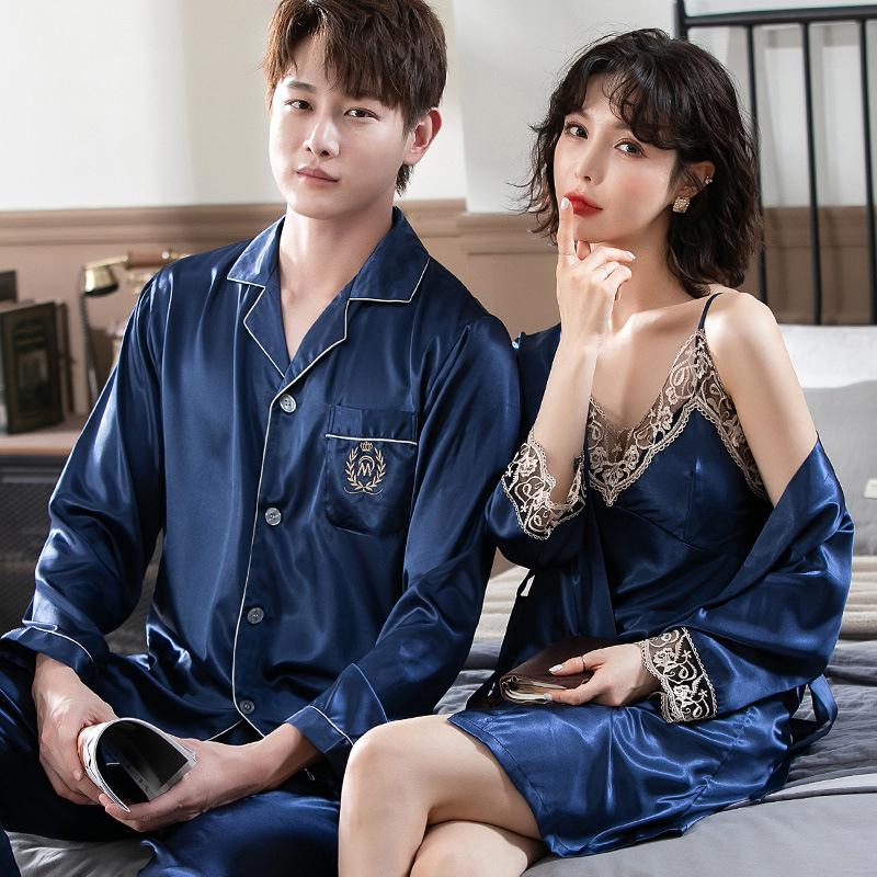 새로운 커플 잠옷 여자의 봄과 가을 얇은 얼음 실크 가슴 패드 여름 남자의 긴 소매 가정 옷 실크 시뮬레이션 세트스토어 가기