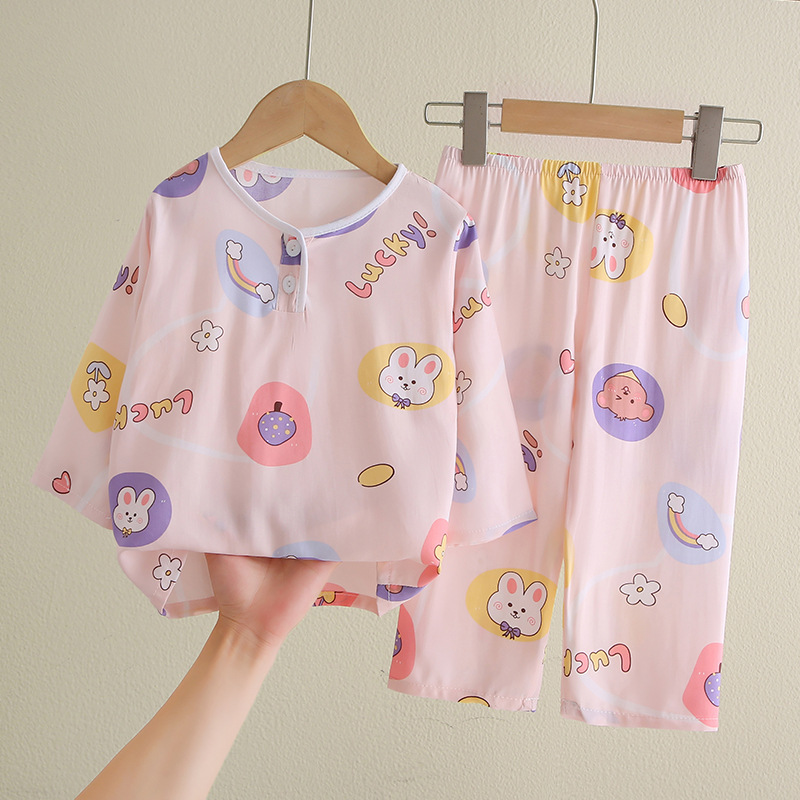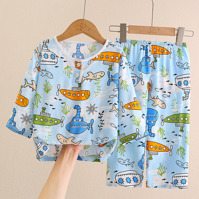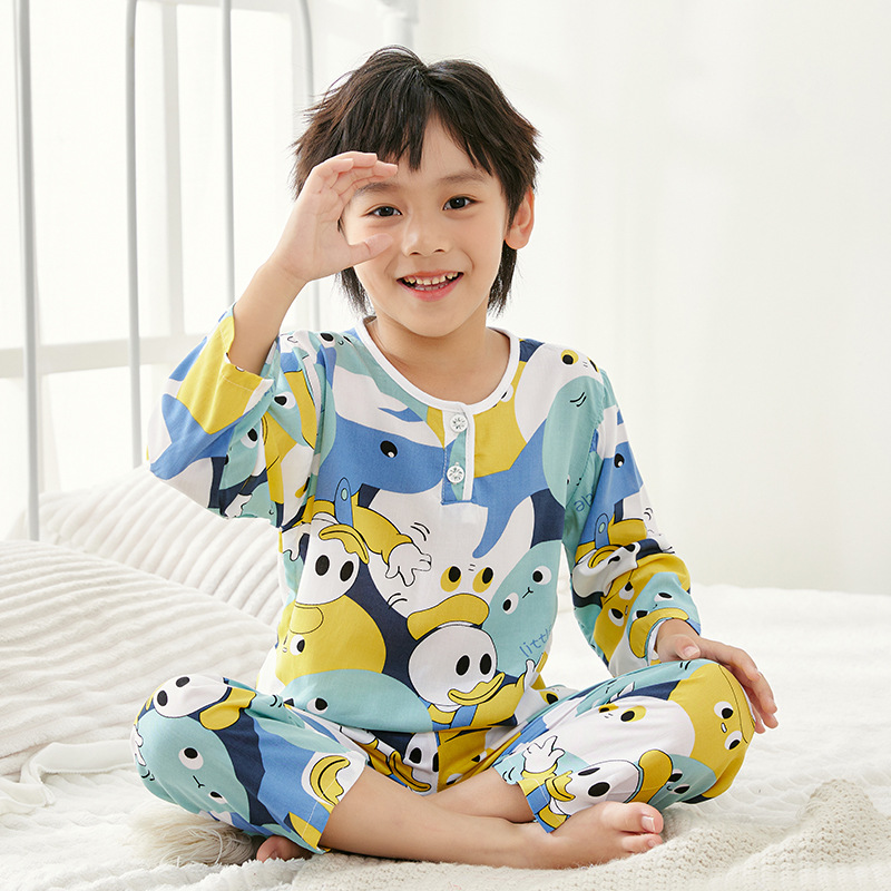 여름 얇은 어린이 잠옷 면 실크 긴팔 세트 어린이 소년 소녀 면 실크 아기 에어컨 의류 가정 의류