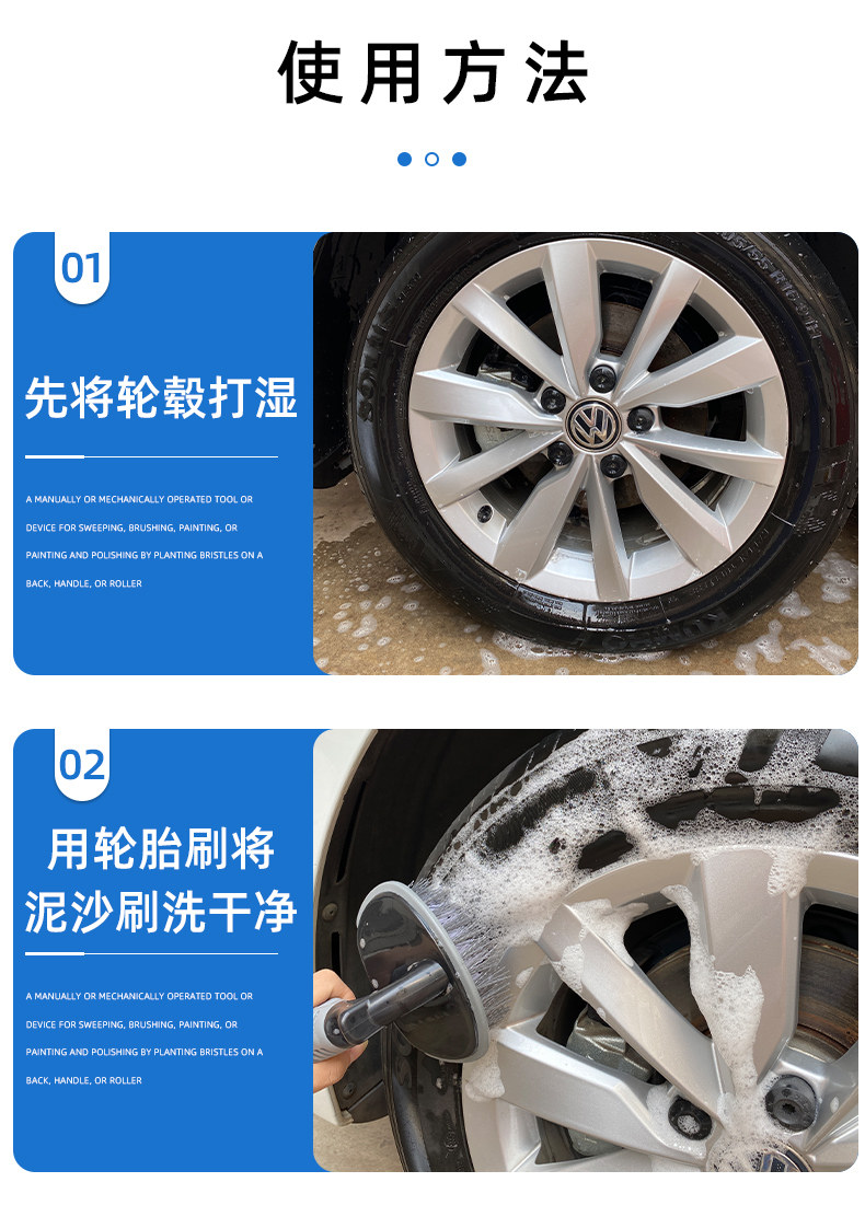 方便的洗车工具,操作简单,便于携带清洁效果好!产品采用PVC毛,经切割加工成不同尺寸的锥型,适用于各种车辆的胎铃,器械的清洁保养