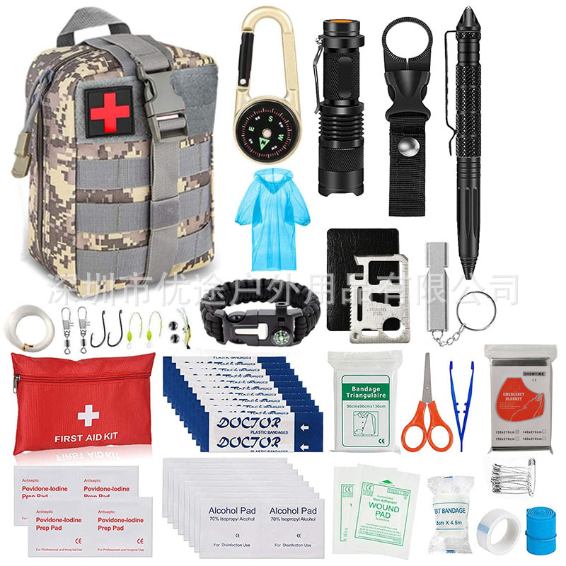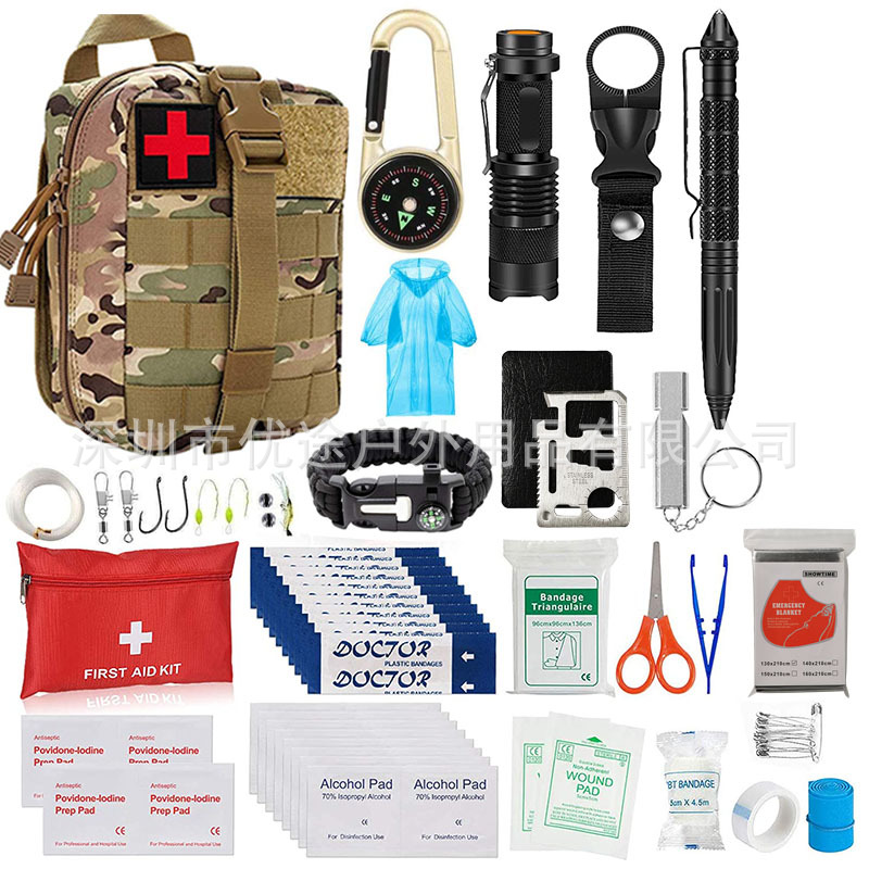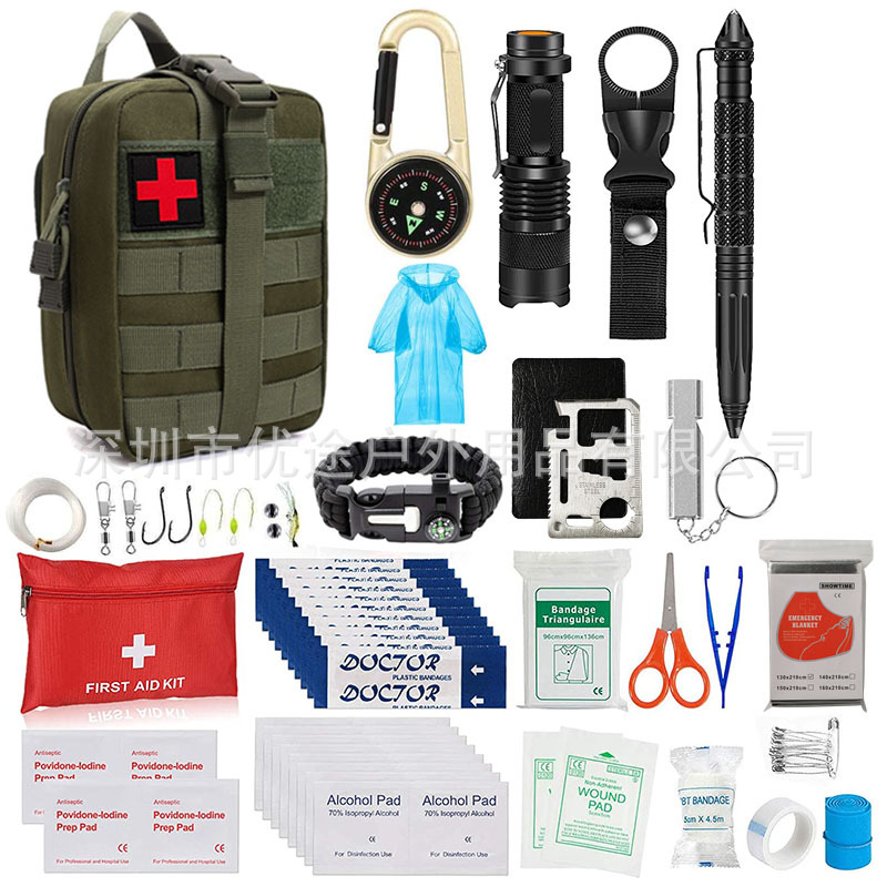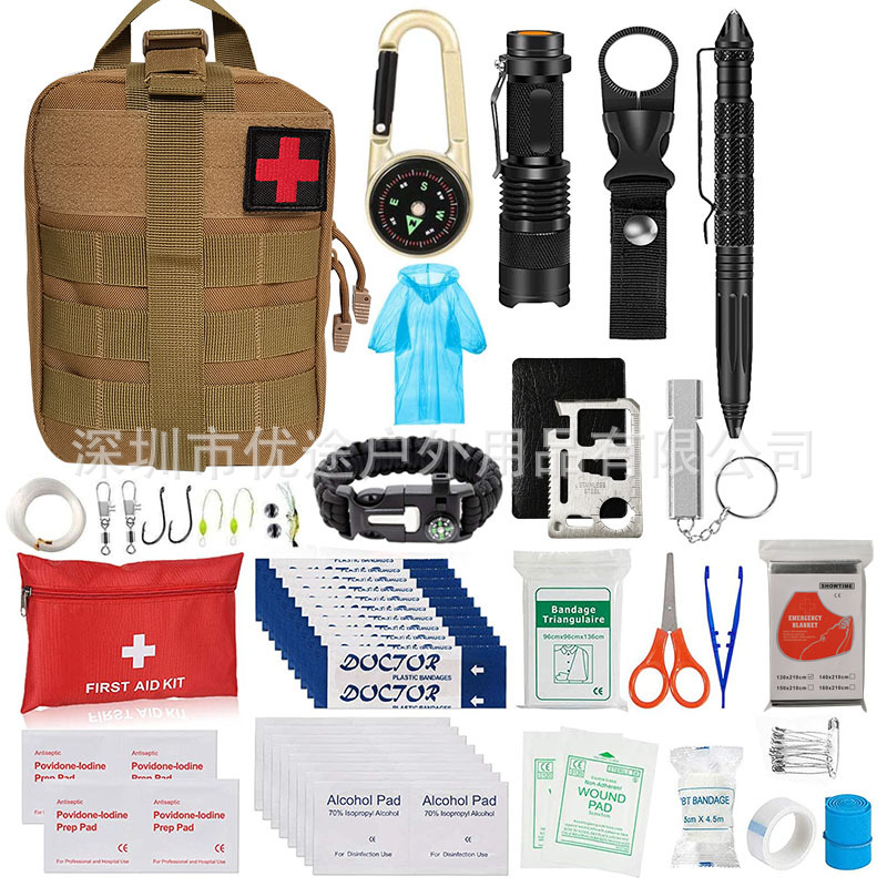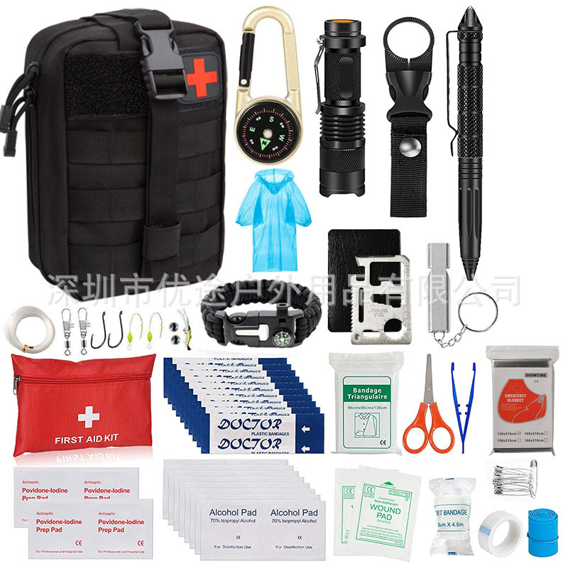 1、战术包*1;2、登山扣指南针*1;3、强光手电筒*1;4、水瓶扣*1;5、战术笔*1;7、求生口哨*1;8、多功能工具卡*1;9、雨衣*1;10、求生手链*1;11、6合1钓鱼套装*1(浮漂*2,夜光虾*1,鱼钩*2,咬铅*2,鱼线*1,八字环*2);12、急救包*1;13、常规创口贴*10;