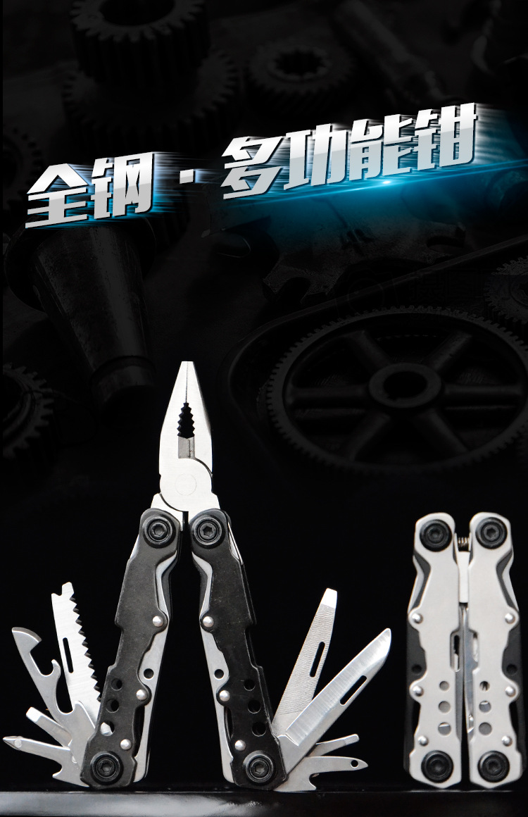 功能:1.尖嘴钳 2.大力钳 3.镀锌铁线剪切器 4.小刀 5.钢锉 6.撬批