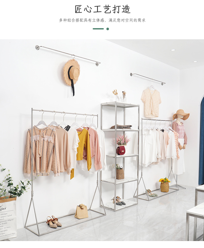 의류 매장 스테인레스 스틸 행거 디스플레이 스탠드 바닥 형 중다오 선반 실버 여성 의류 매장 의류 디스플레이 스탠드 조합
