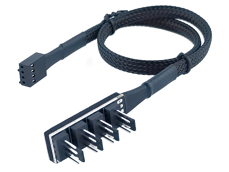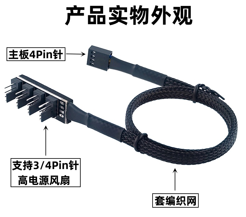 【产品接口】:一端电脑主板4Pin接口,另一端4个和5个4Pin针座。
