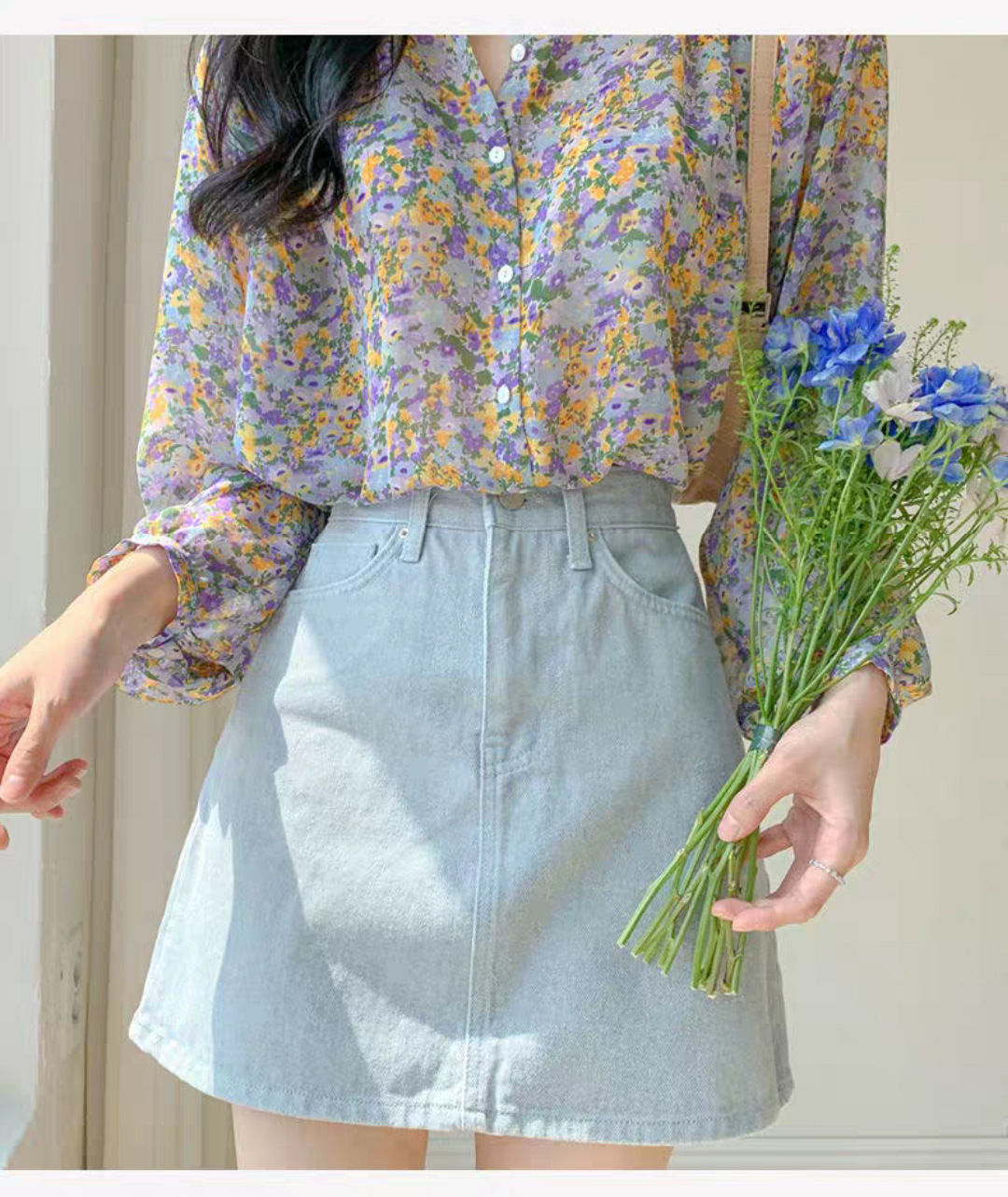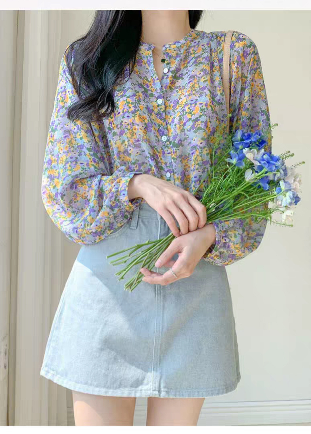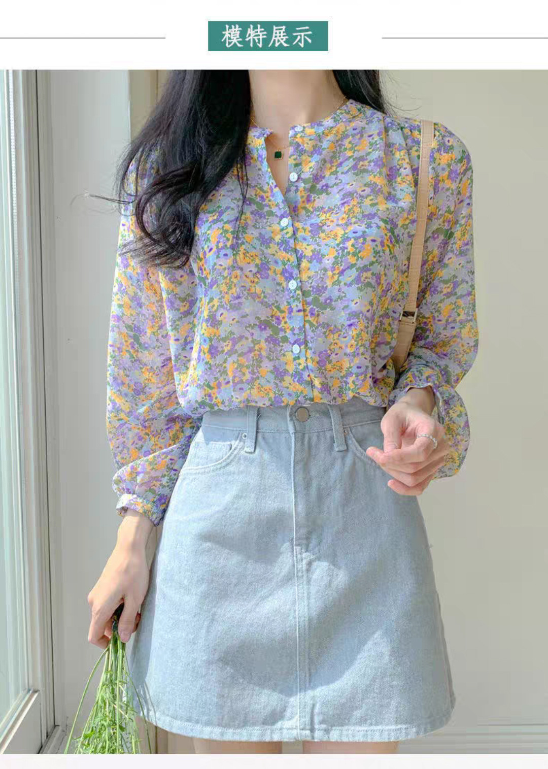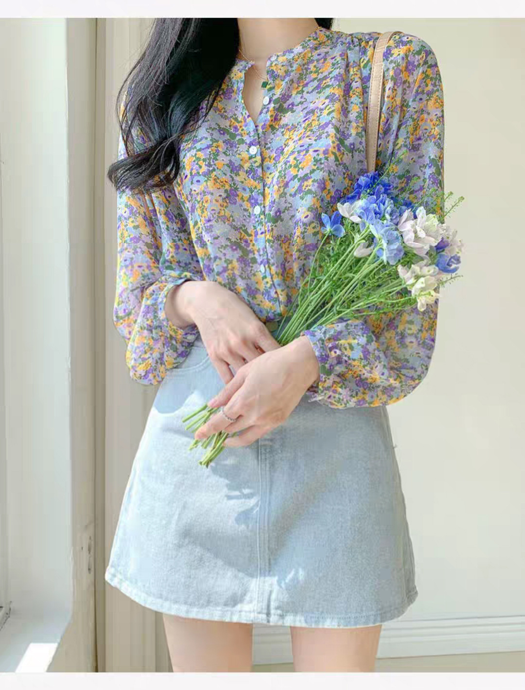 꽃 쉬폰 셔츠 여성의 새로운 디자인 감각 긴 소매 인쇄 세련된 탑 달콤한 작은 셔츠스토어 가기