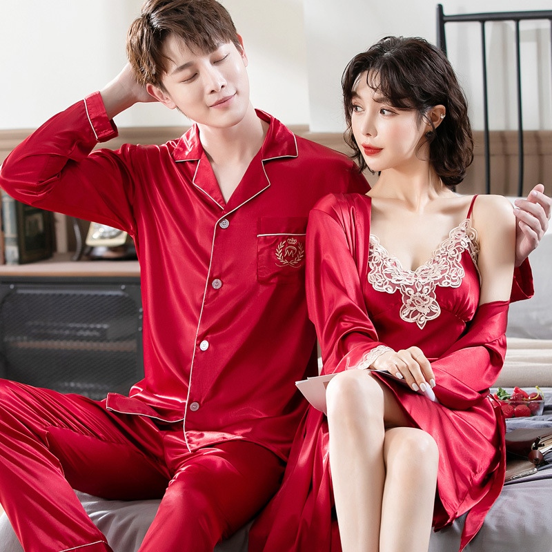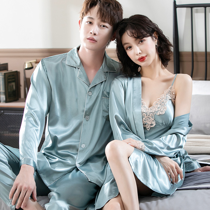 봄과 가을 잠옷 커플 목욕 가운 실크 잠옷 여자 잠옷 가슴 패드 여름 남자의 긴 소매 얼음 실크 세트 가정 의류스토어 가기