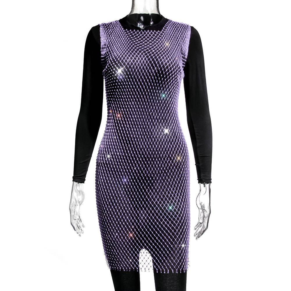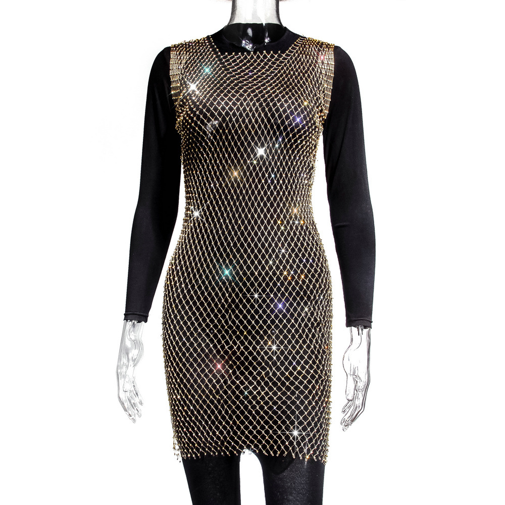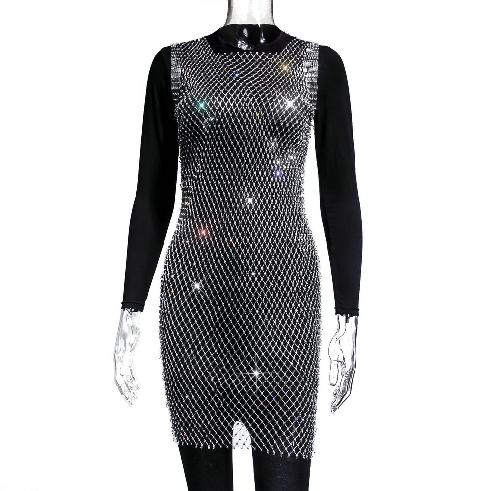 크로스보더 워터드릴 피쉬넷 탑, 2026 유럽 및 미국 여름 메쉬 반짝이 여성 반팔 원피스, 숏 스타일, 인기 판매 중