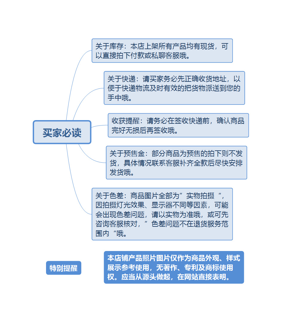 部分商品为预售款页面价格为预付定金,下单前请与客服联系确认,部分商品及偏远地区(例如:新疆、西藏、香港、澳门、台湾等地区)无法包邮,详情请询问客服修改运费,部分商品款式或与页面图片有些许不同,请您下单前与客服确定规格款式,以免造成误会,给您带来的不便敬请谅解!gWmWivOiz9St5Ja3ZAY2YAnAFjPX7DD5OscI