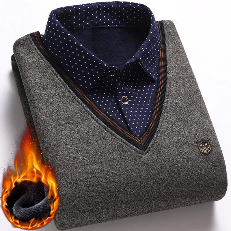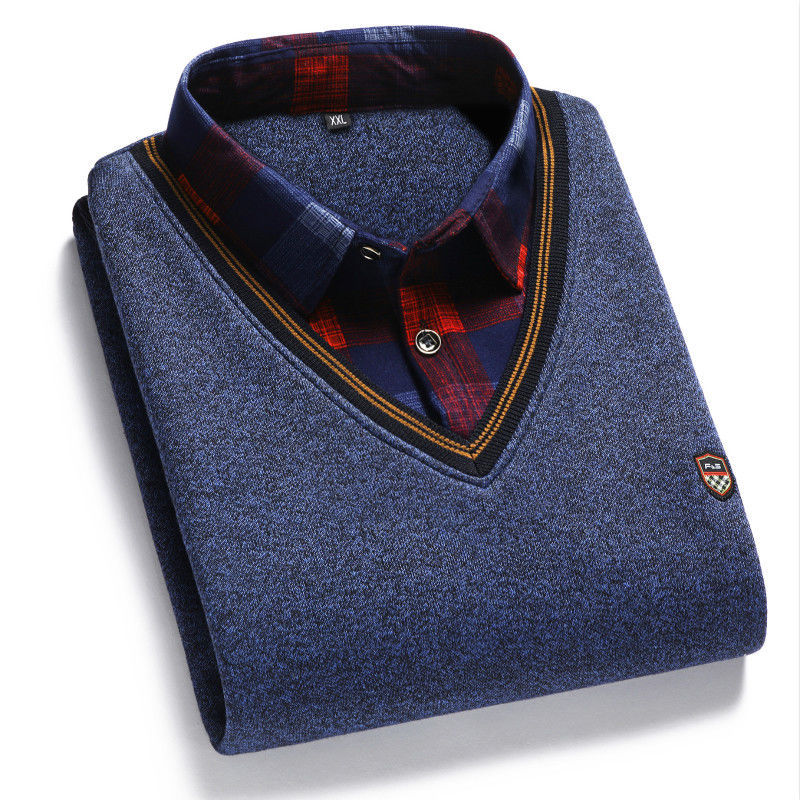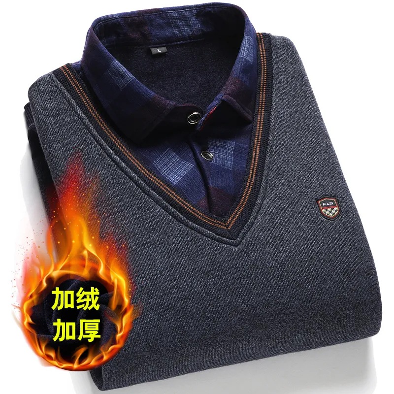【加绒加厚】男士假两件衬衫领毛衣男中老年打底针织衫内搭