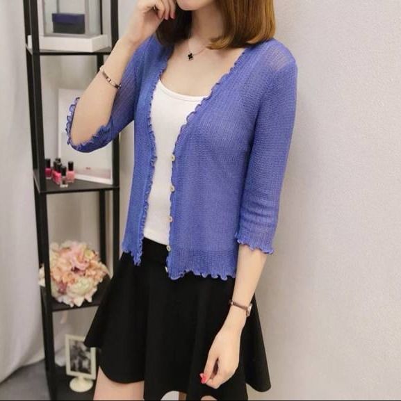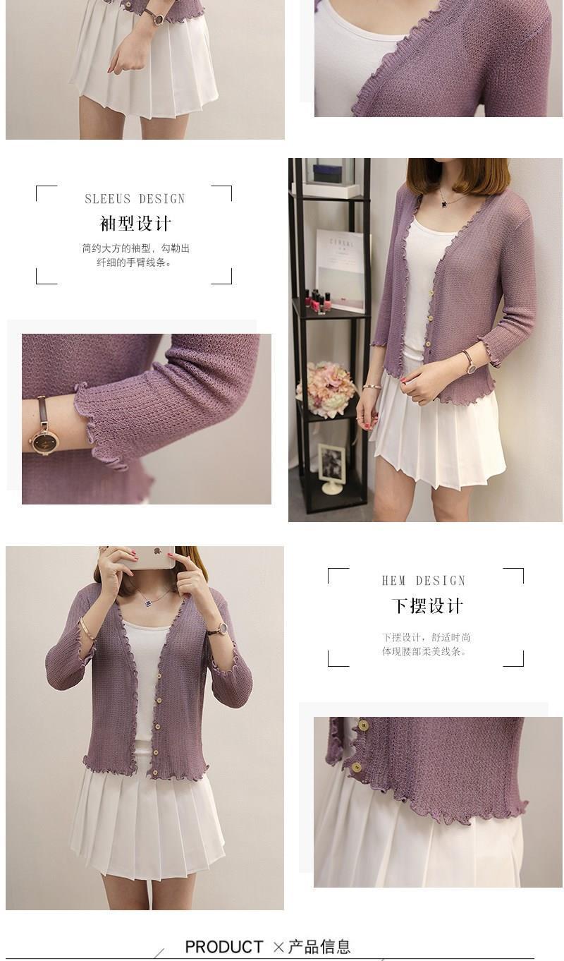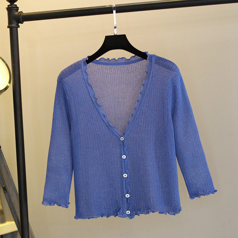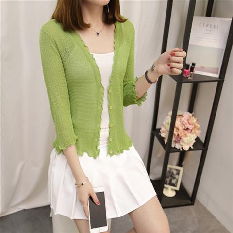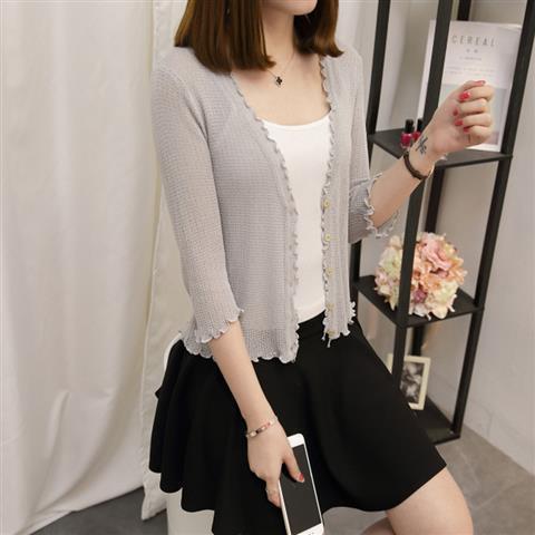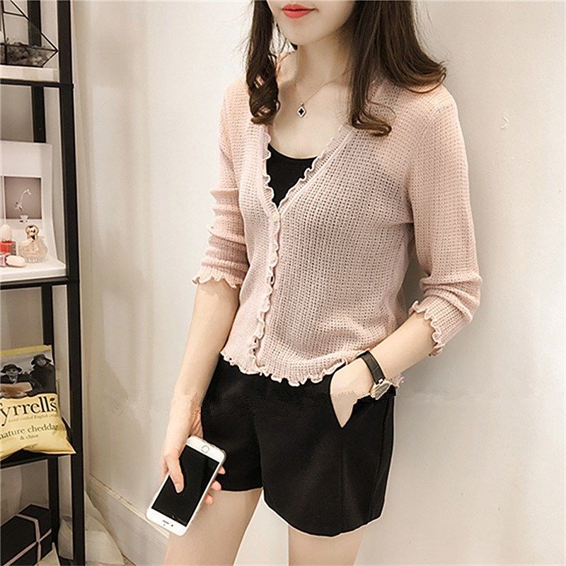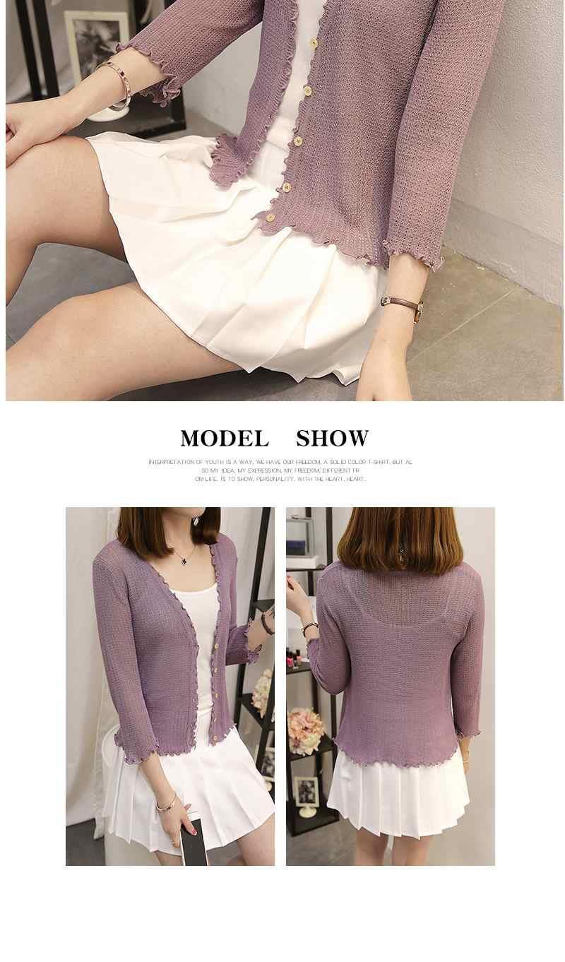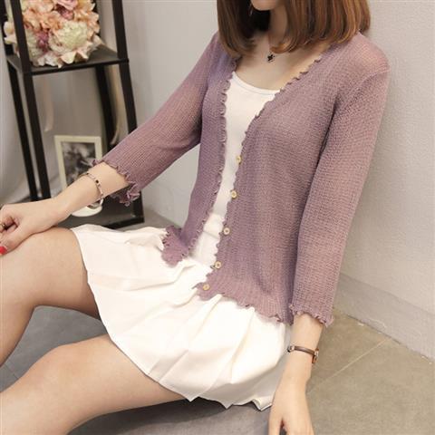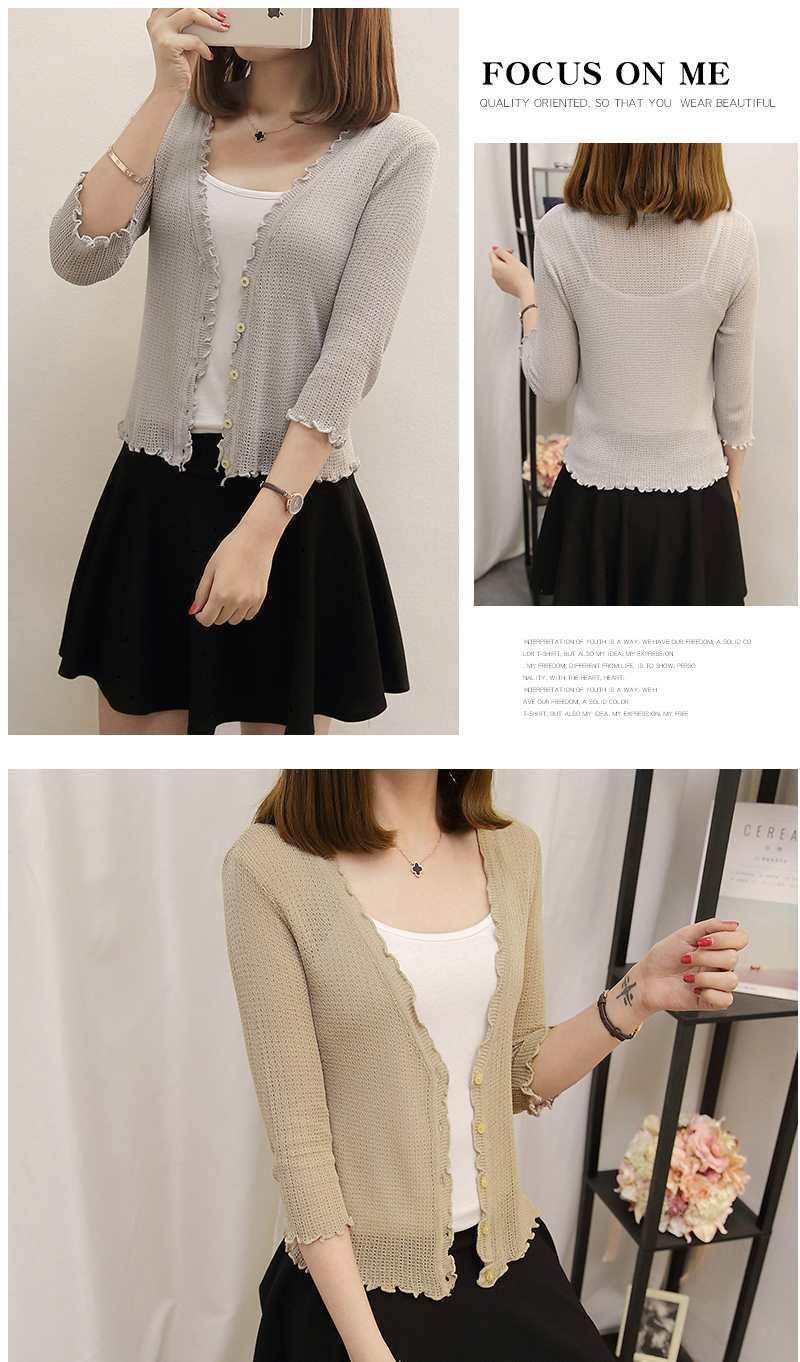 아이스 실크 니트 스웨터 여성용 가디건 여름 짧은 에어컨 셔츠 겉옷 얇은 짧은 코트 우드 이어 가장자리가있는 자외선 차단제 숄