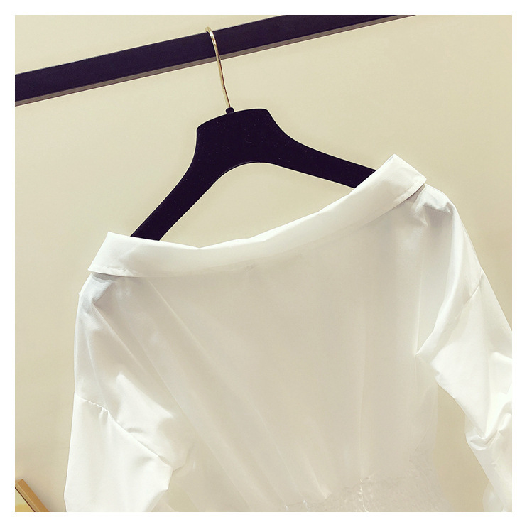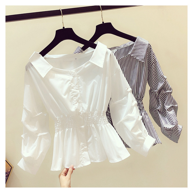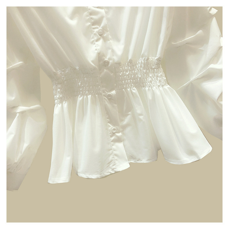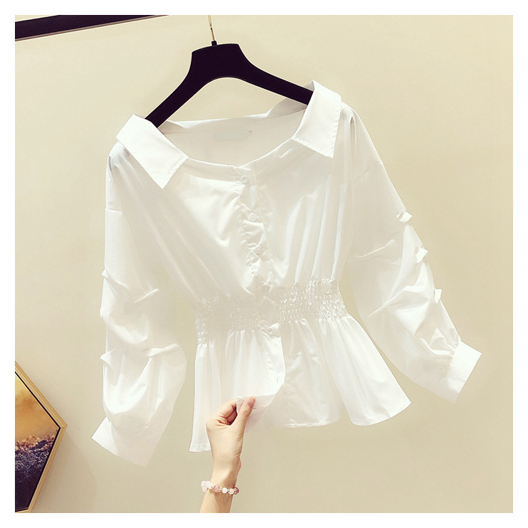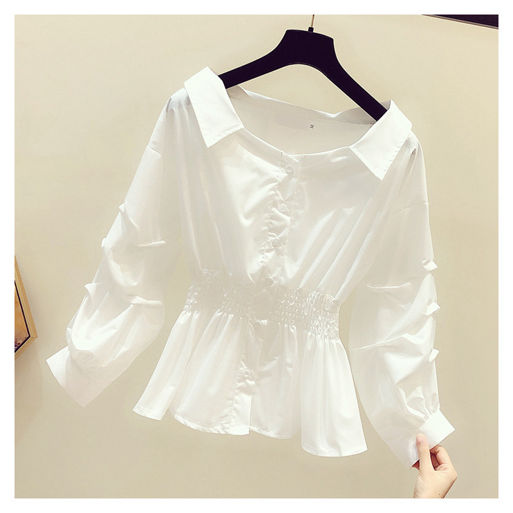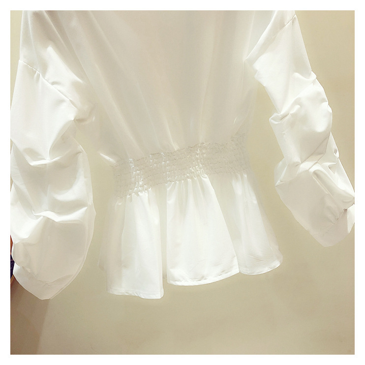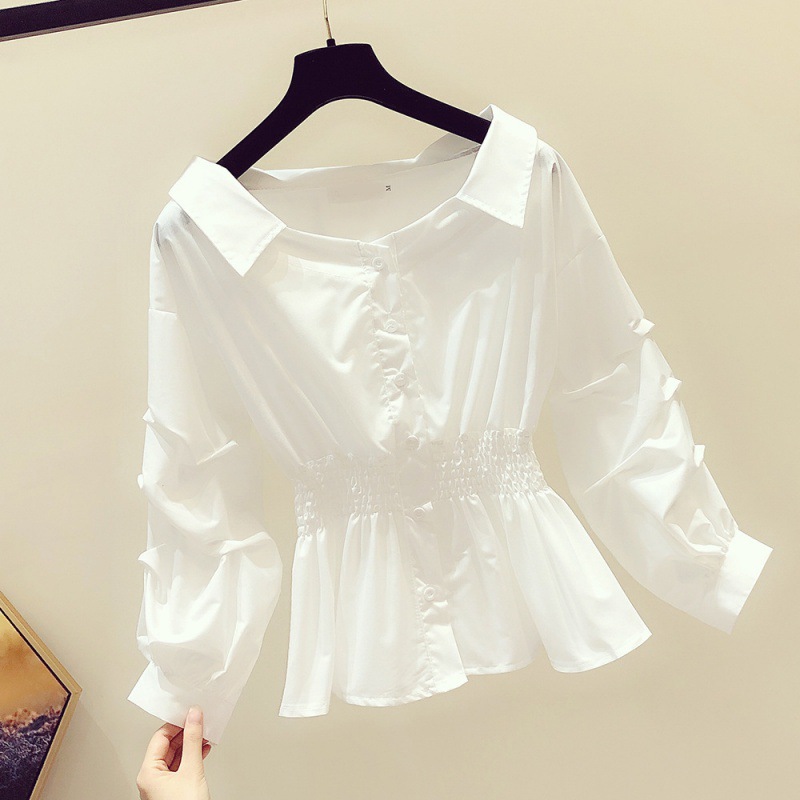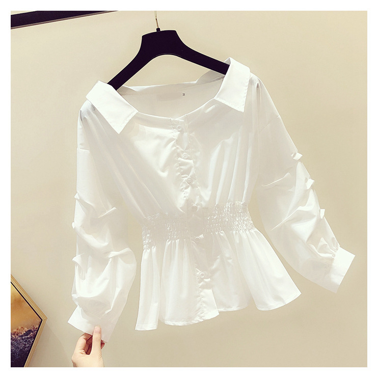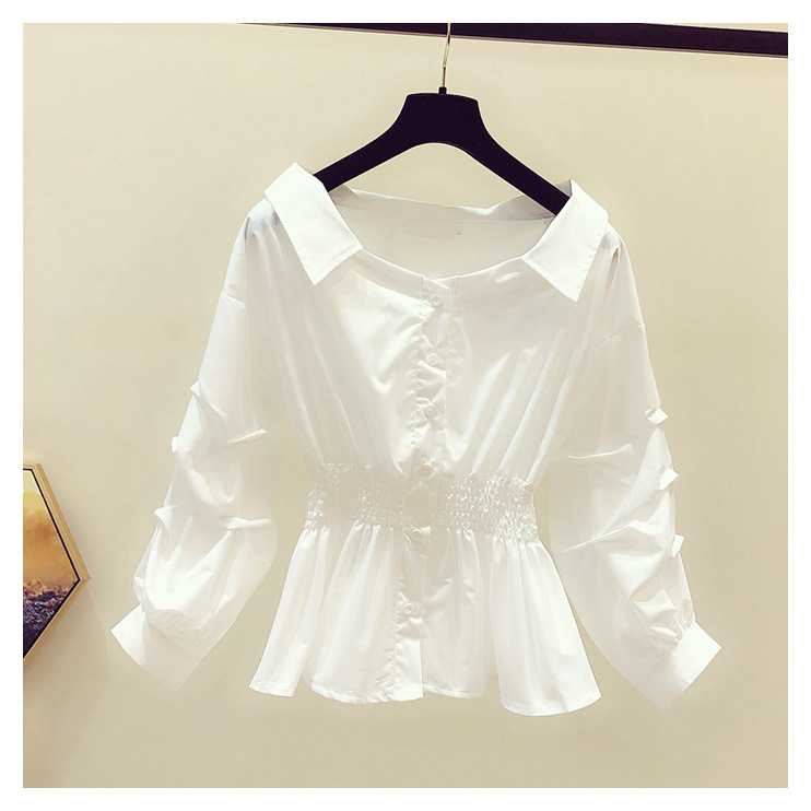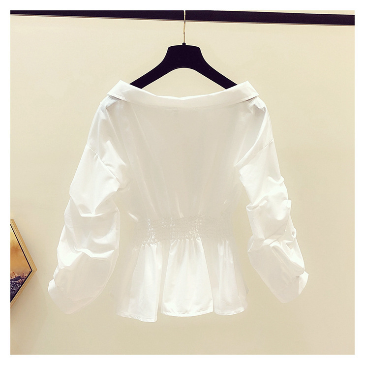 2025 봄/가을 루즈핏 오프숄더 허리라인 강조 셔츠 한국 스타일 브이넥 여성용 흰색 셔츠 퍼프 소매스토어 가기