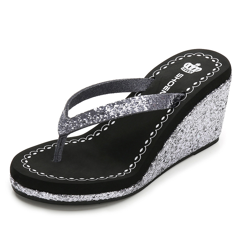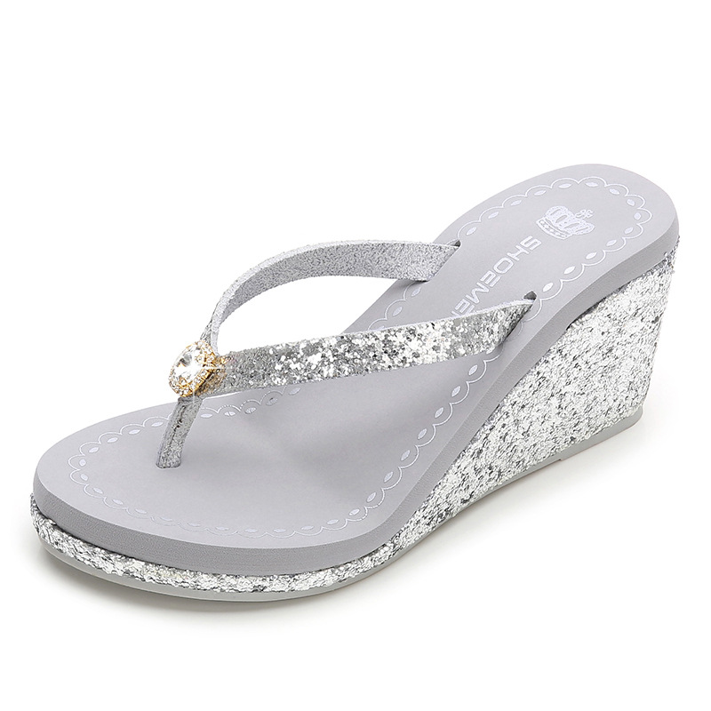 2025 새로운 여름 스팽글 라인 석 여성 하이힐 슬리퍼 두꺼운 밑창 비치 슬리퍼 소스 재고 있음