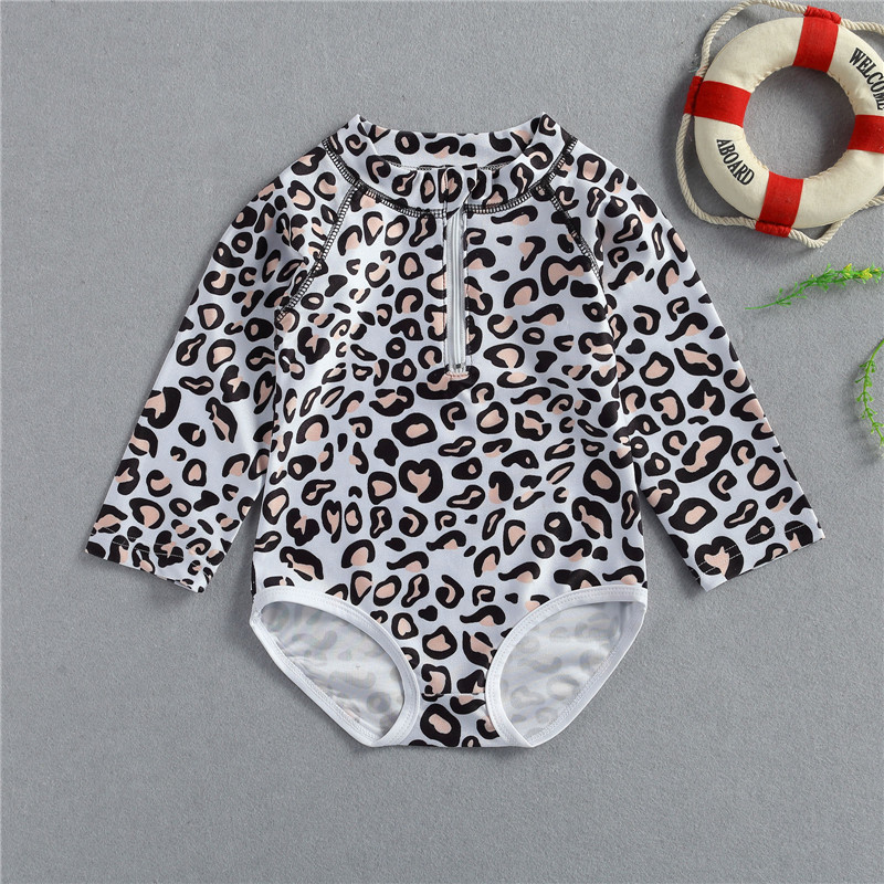 아마존 여름 아동복 여자 수영복 레오파드 무늬 긴팔 원피스 수영복 아기 여자 하와이 휴가 수영복