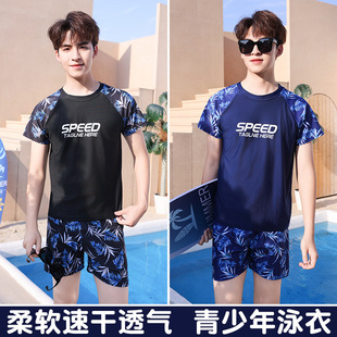 青少年游泳衣三件套中大童男孩温泉泳裤套装批发短袖成人泳装批发