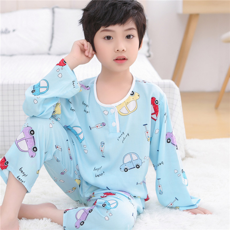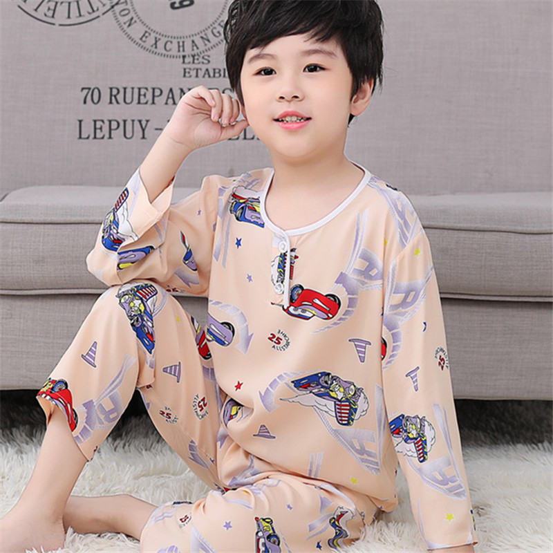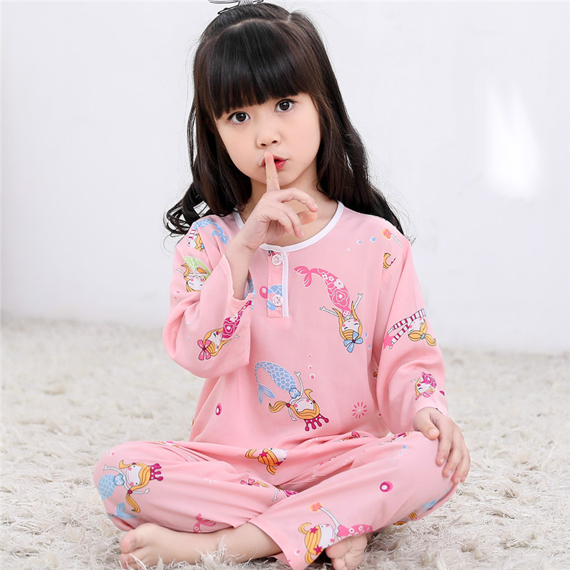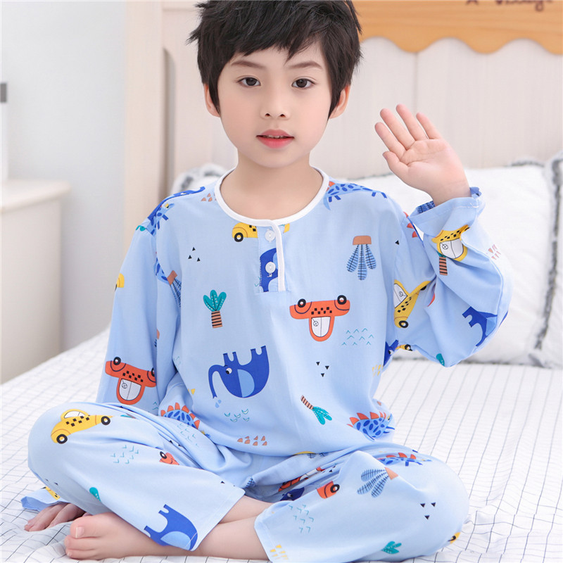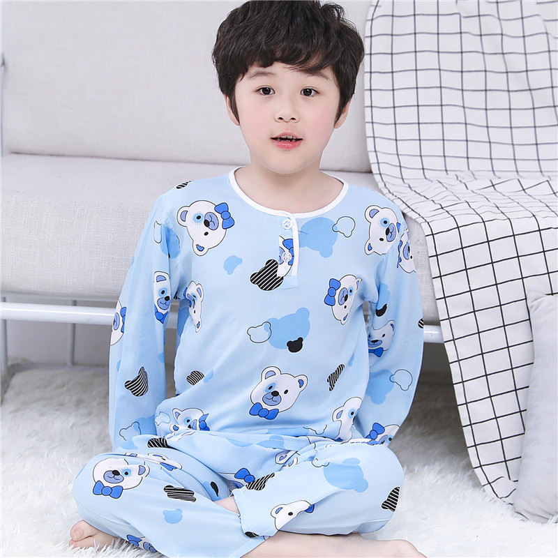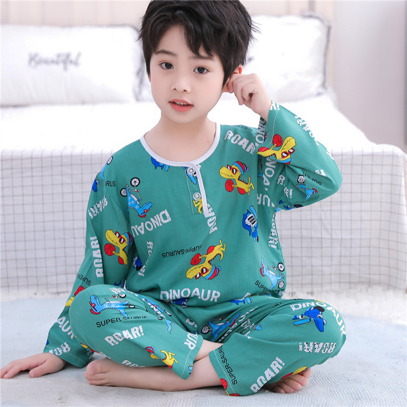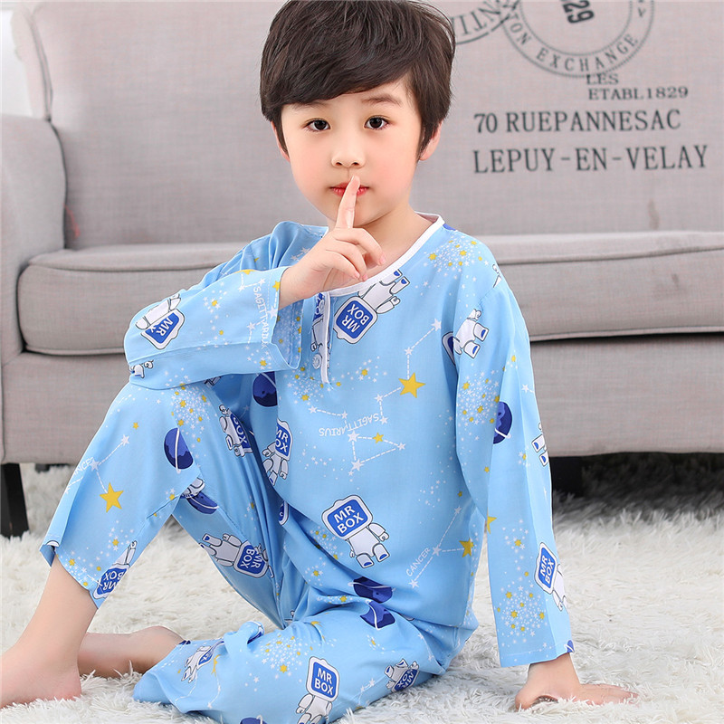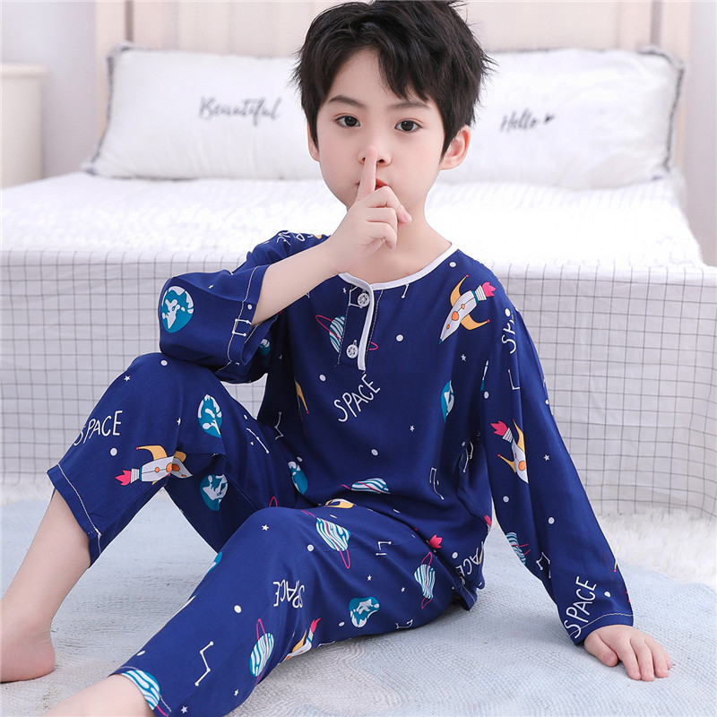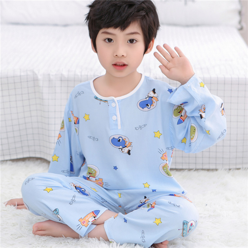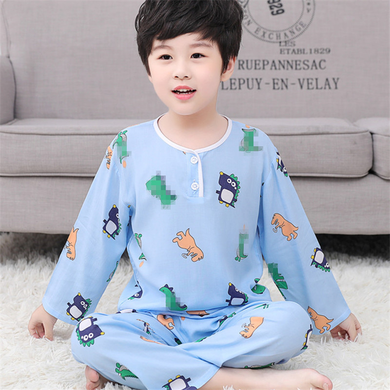 2021 여름 새로운 스타일 면 어린이 잠옷 얇은 긴 소매 면 실크 만화 소녀와 소년을위한 인공 면 에어컨 의류