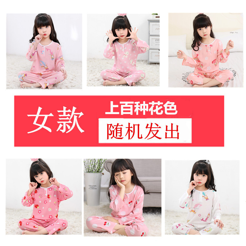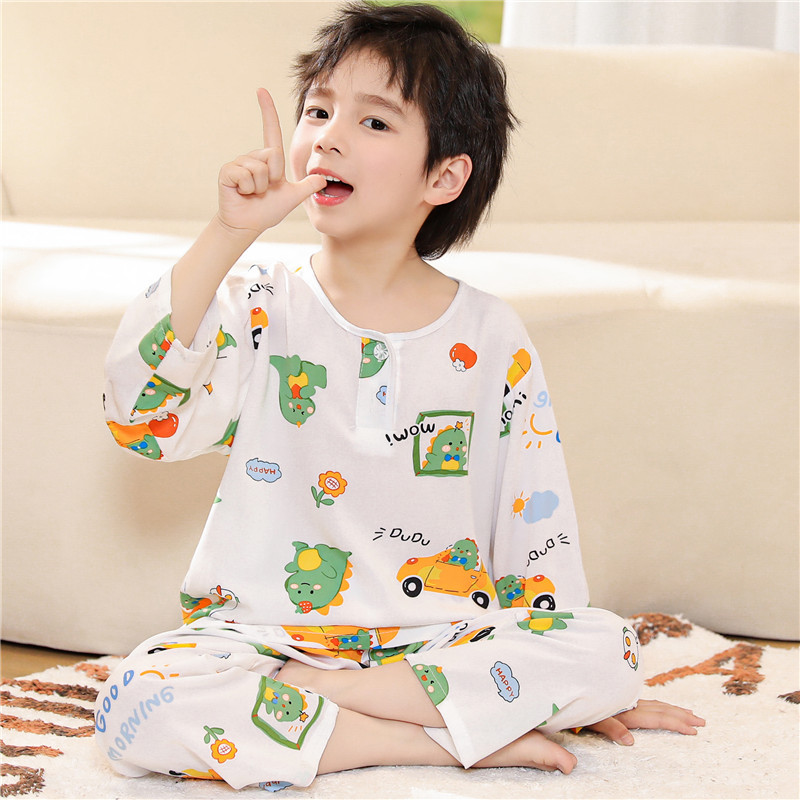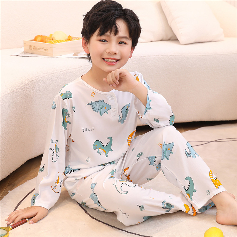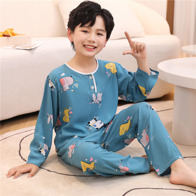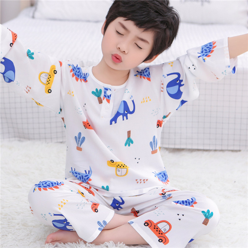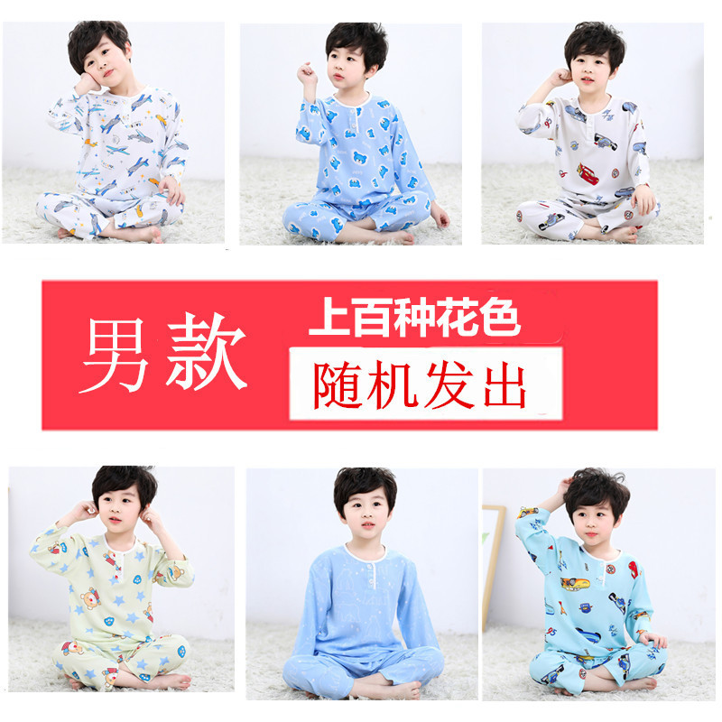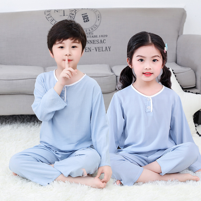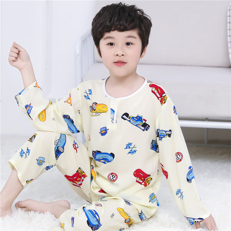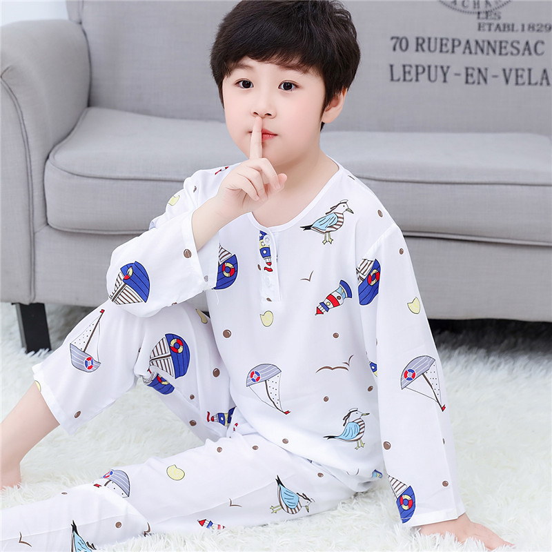 2021 여름 새로운 스타일 면 어린이 잠옷 얇은 긴 소매 면 실크 만화 소녀와 소년을위한 인공 면 에어컨 의류