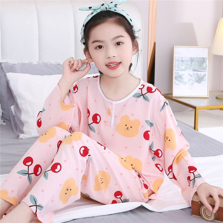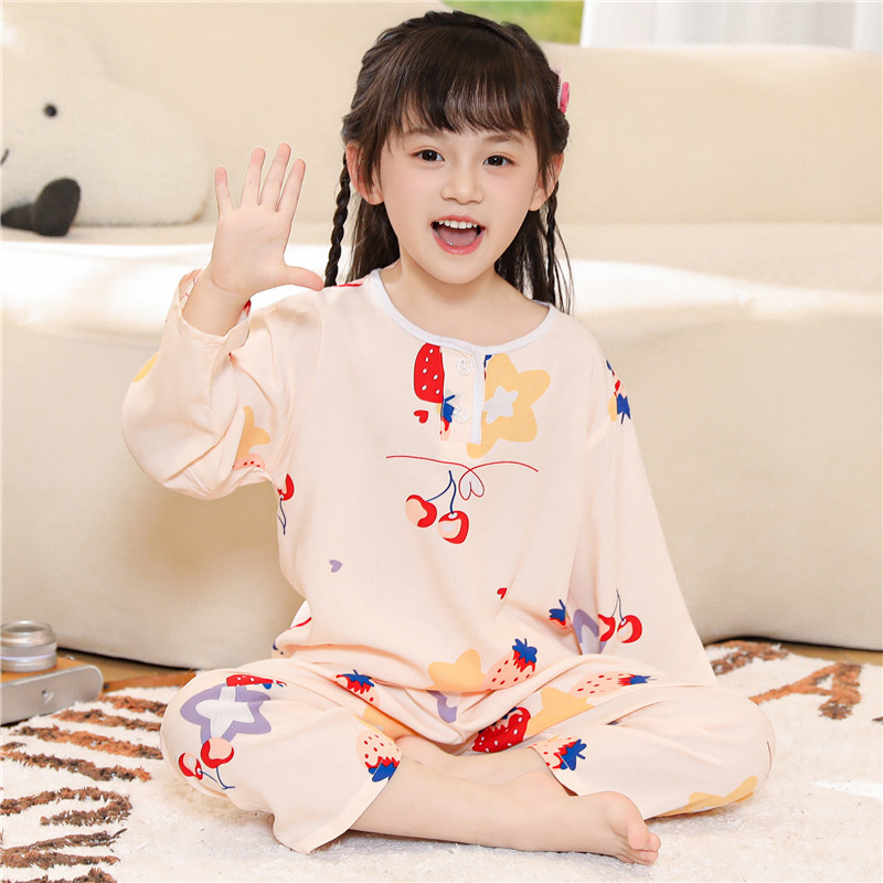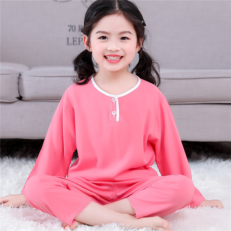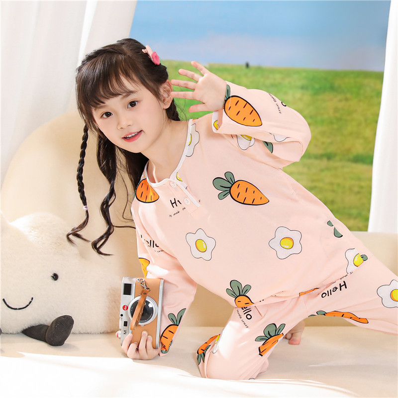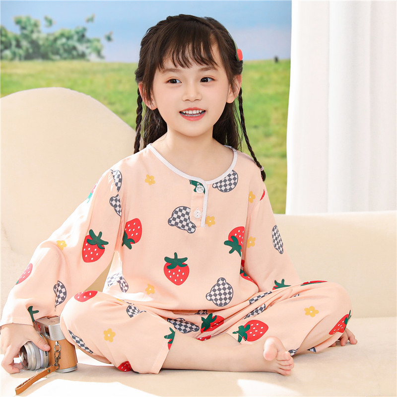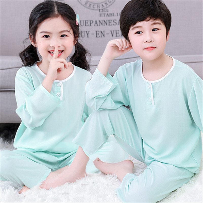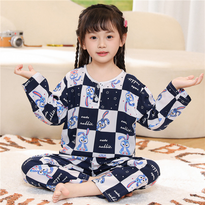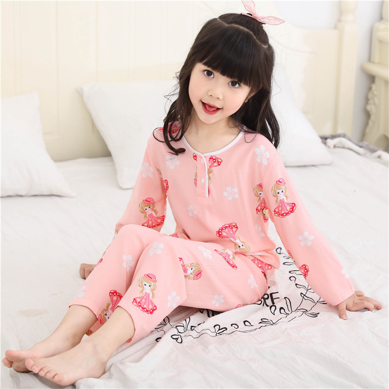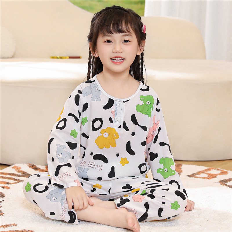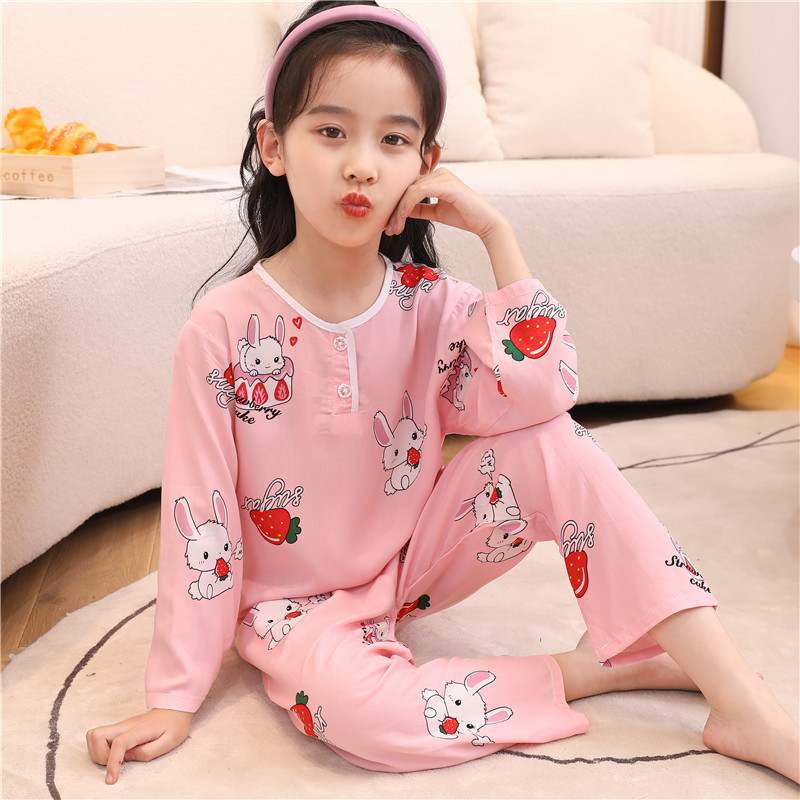 2021 여름 새로운 스타일 면 어린이 잠옷 얇은 긴 소매 면 실크 만화 소녀와 소년을위한 인공 면 에어컨 의류