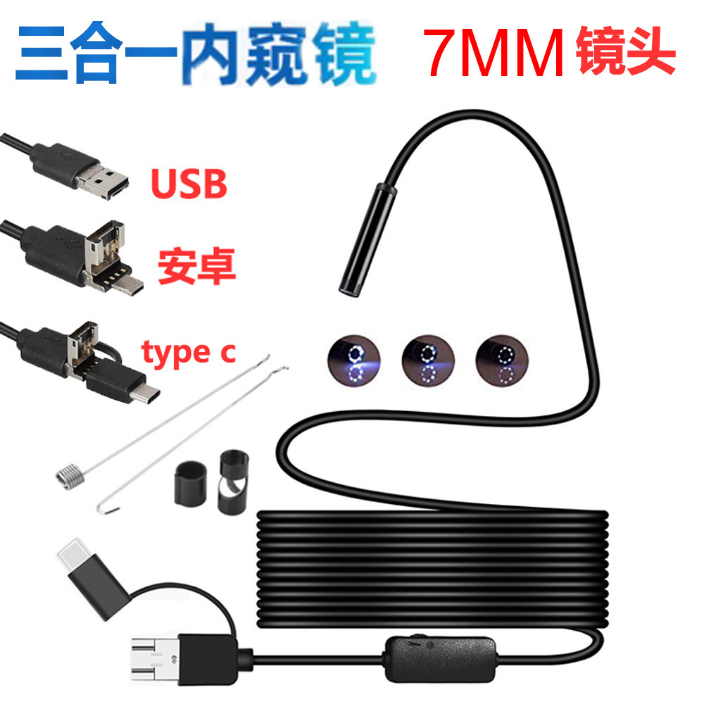 此款安卓内窥镜是一款新型的电子产品。本产品的优点是:尺寸小、重量轻,前端摄像头外壳直径为7.0mm,中间部位安装一个控制盒(调节灯光和拍照按键。注:拍照按键仅电脑使用时可以支持使用。手机可以通过使用的软件进行拍照),可以调节六个LED灯的亮度,捕捉图像后拍照直接拍照存储在安卓手机内,可以录像,记录检查的整个过程,方便后续的观察和分析.
