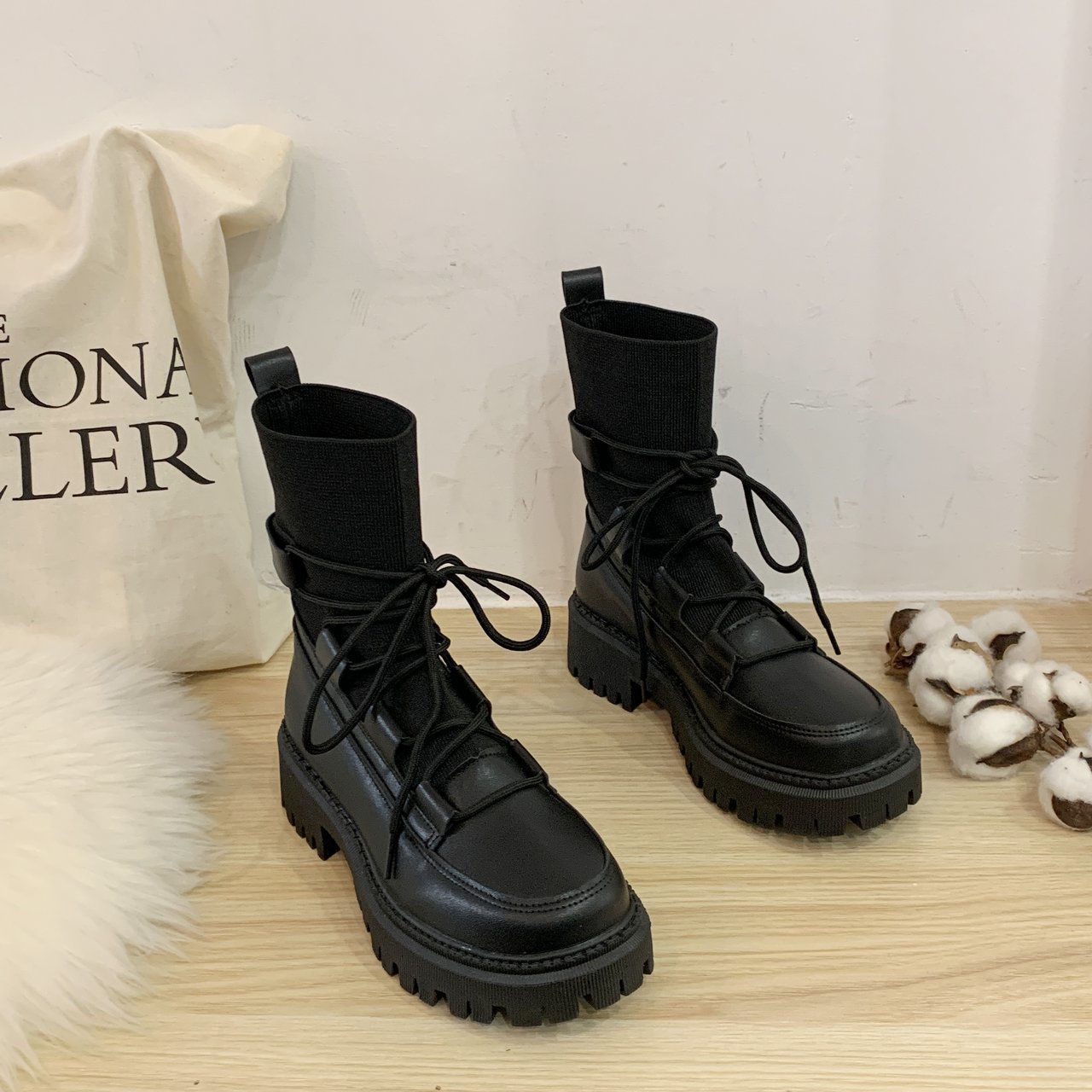 2024 봄, 가을 벨벳 여성 부츠, 마틴 부츠, 가죽과 천 소재의 모직 플라이 니트 신축성 부츠, 두꺼운 굽, 하이힐, 두꺼운 밑창 여성 신발