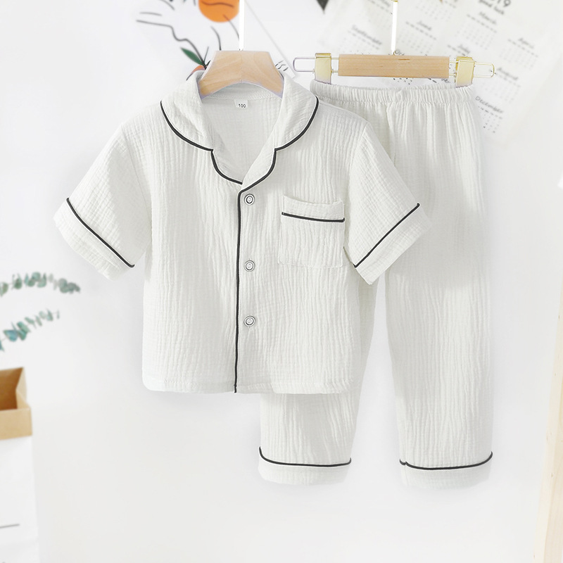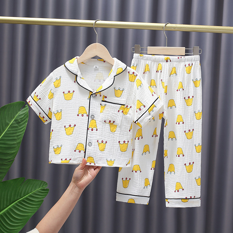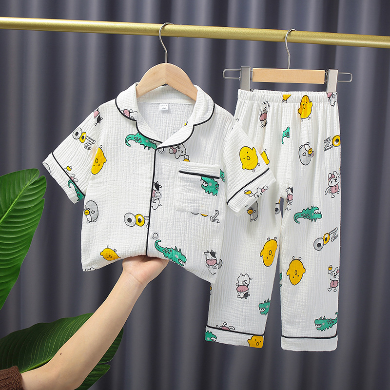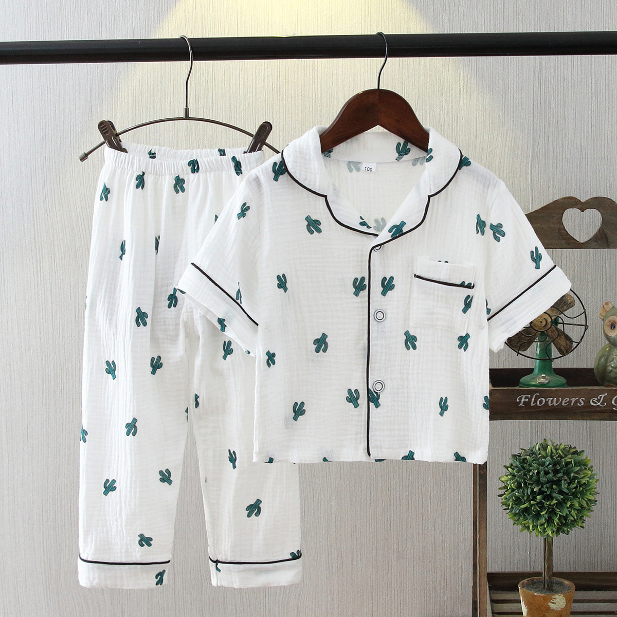 봄과 여름 어린이 순면 거즈 잠옷 소녀와 소년 2 층 면사 중형 및 대형 어린이 얇은 반팔 세트 가정용 옷