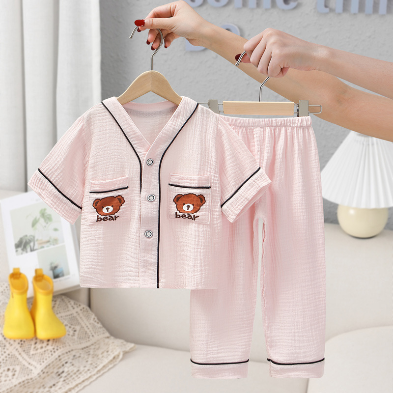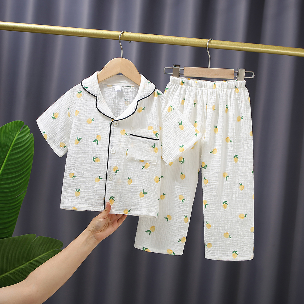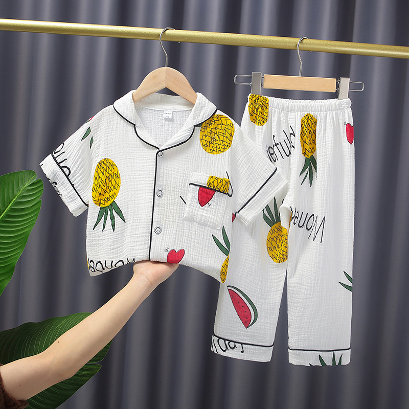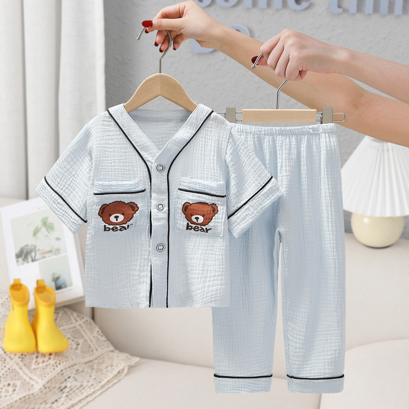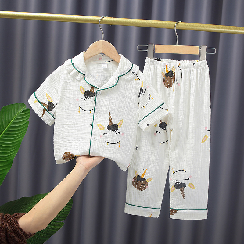 봄과 여름 어린이 순면 거즈 잠옷 소녀와 소년 2 층 면사 중형 및 대형 어린이 얇은 반팔 세트 가정용 옷