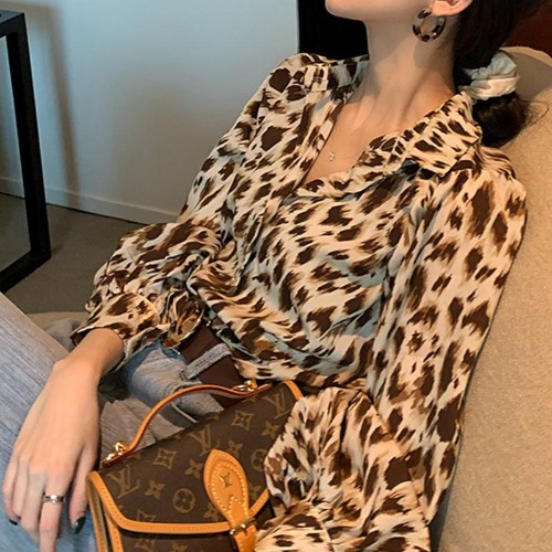 레오파드 프린트 쉬폰 셔츠 여성용 레트로 홍콩 스타일 2026 신상 패션 랜턴 슬리브 루즈핏 프린트 셔츠스토어 가기